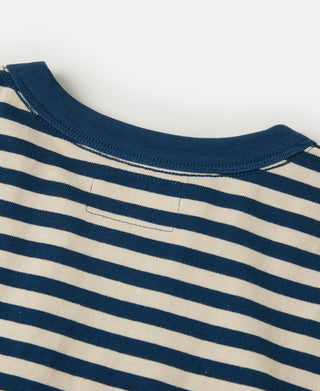 This breton stripe T-shirt, also known as a sailor shirt, features custom-designed striped fabric made from double-yarn material with a heavyweight 280g construction. True to the classic style, the ribbed cuffs are the defining detail of this garment. The ribbed cuffs are specially dyed, and the collar is reinforced with a stability tape for added durability.