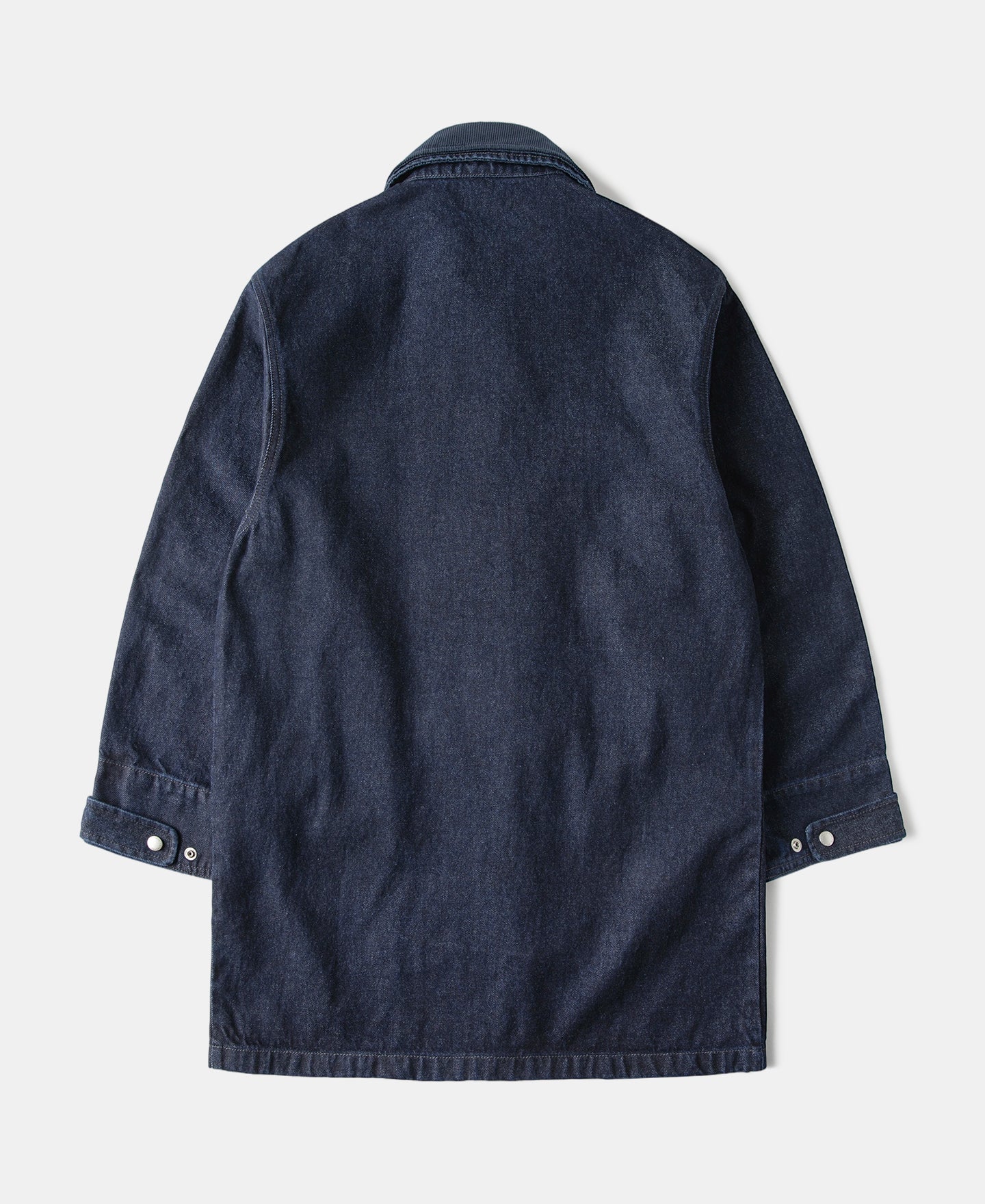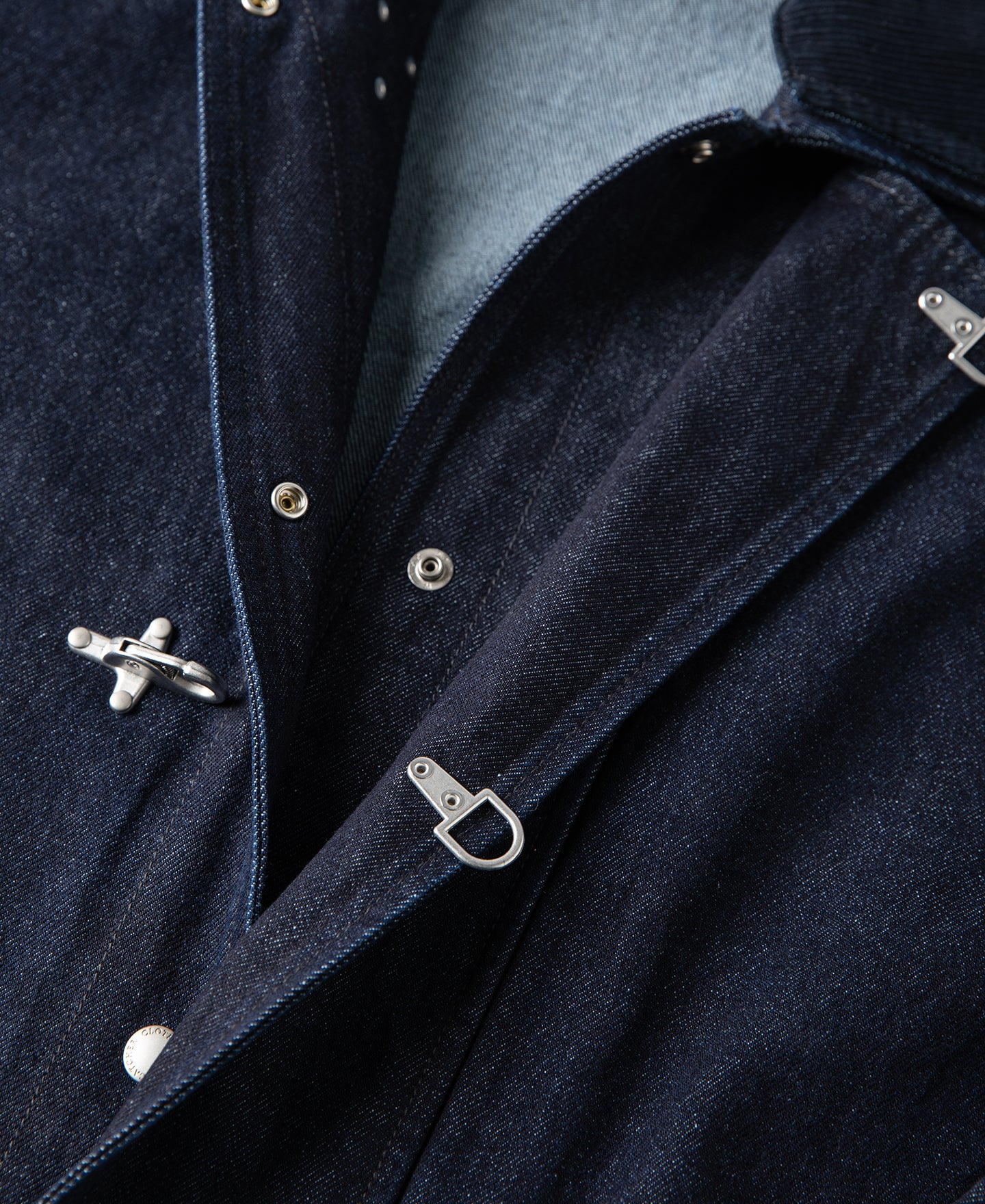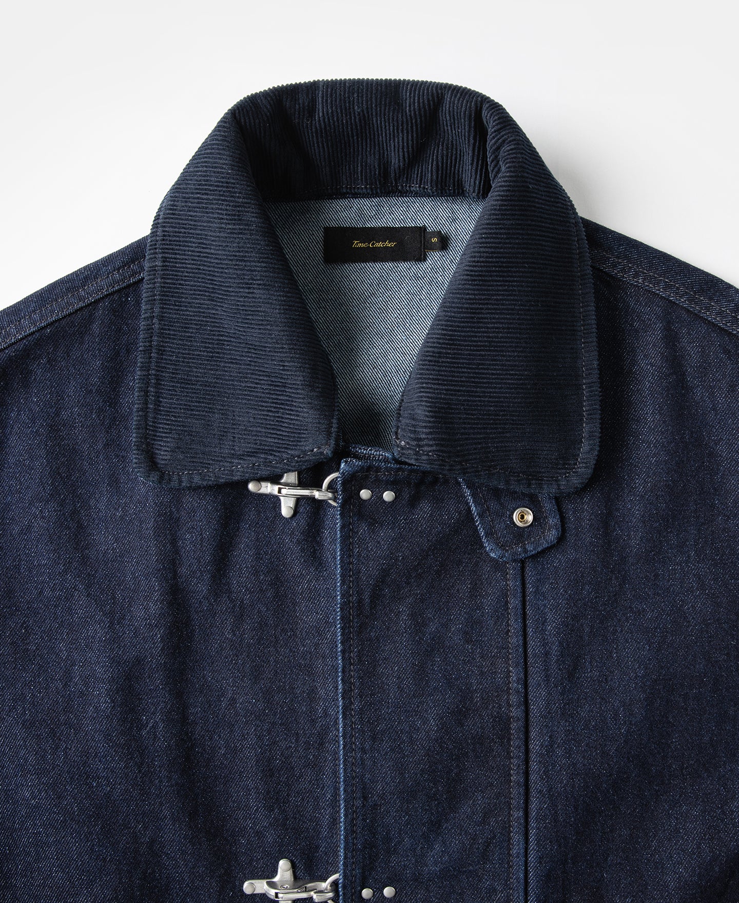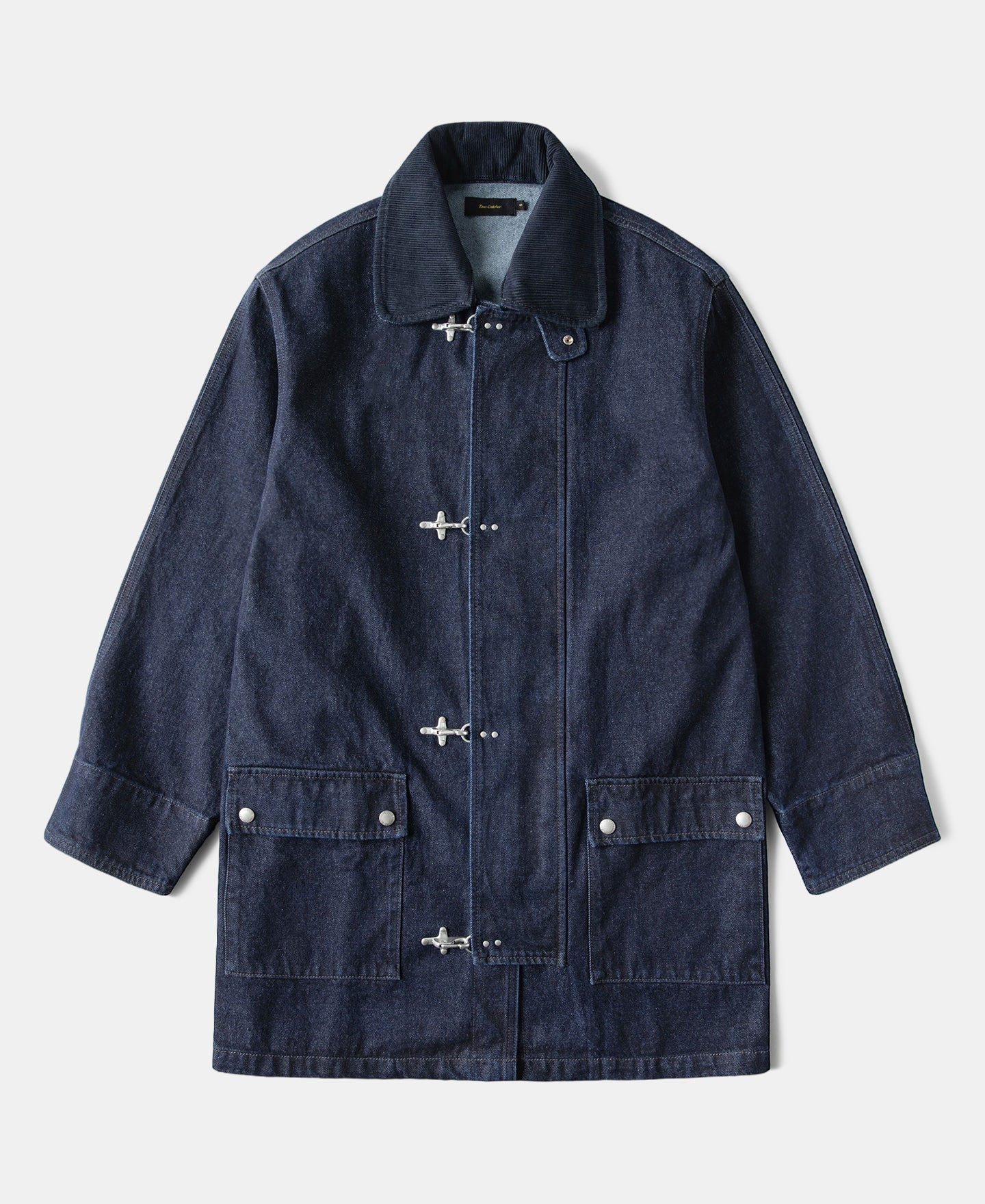Inspired by the classic design of fireman jackets, this reimagined version is crafted from durable 14.2 oz denim fabric. The relaxed fit, oversized exterior pockets, and raglan sleeves provide ample movement and comfort. The tonal corduroy collar adds a refined touch, while the heavy-duty metal lobster clasps secure the storm flap for added functionality. Built with reinforced double-needle stitching and clean edge finishing for lasting durability. A versatile piece that effortlessly blends rugged style with everyday wearability, making it a go-to jacket for any occasion.