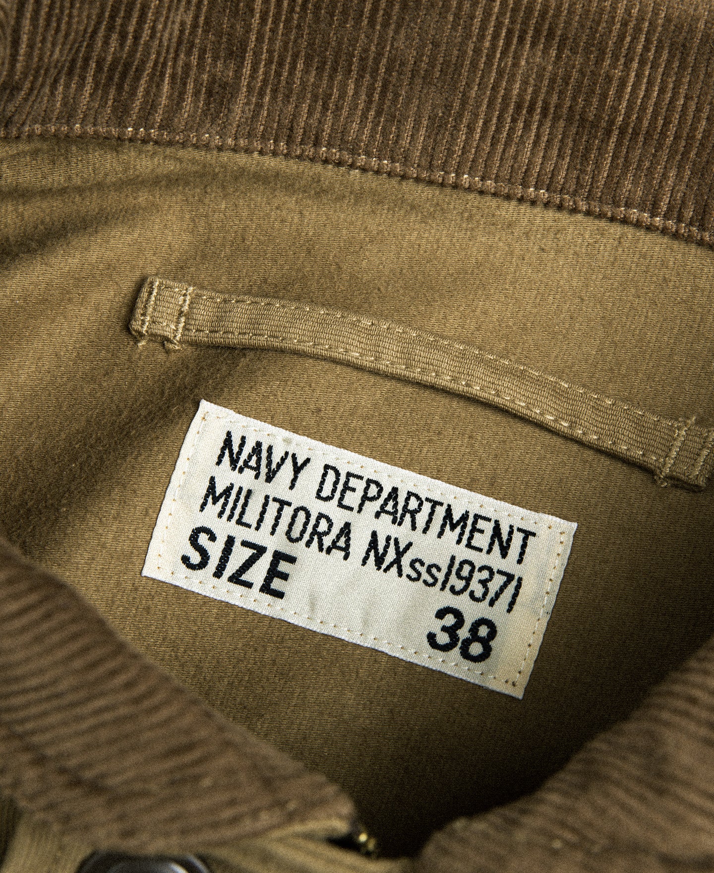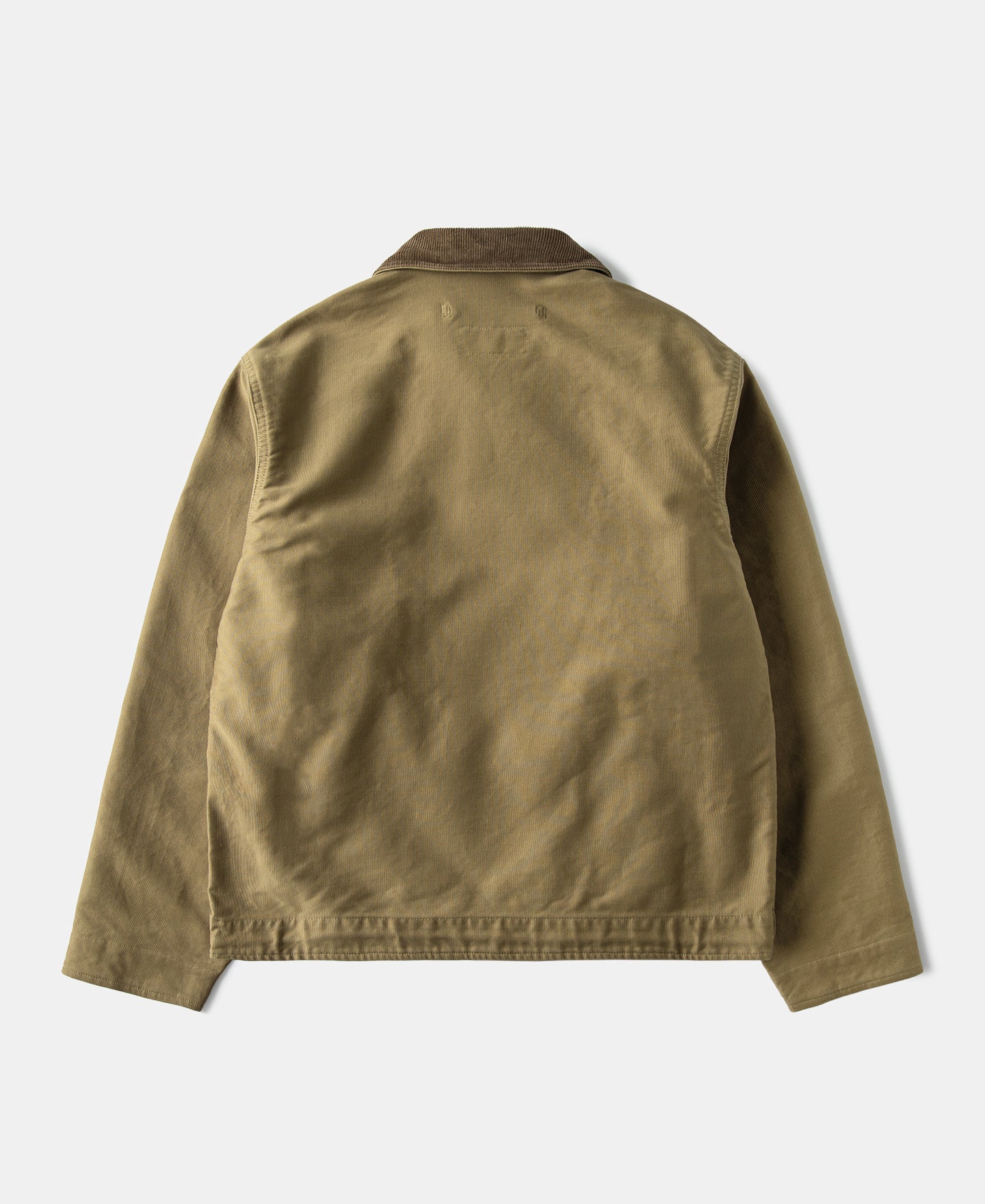 Crafted from heavyweight, high-density jungle cloth (100% cotton), it provides substantial warmth and a structured silhouette. The brown corduroy-trimmed collar and cuffs offer a soft contrast to the durable outer shell, while a Talon zipper and Japanese urea buttons echo its authentic heritage.