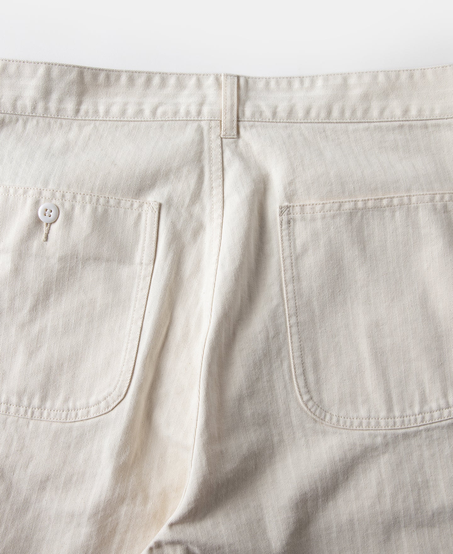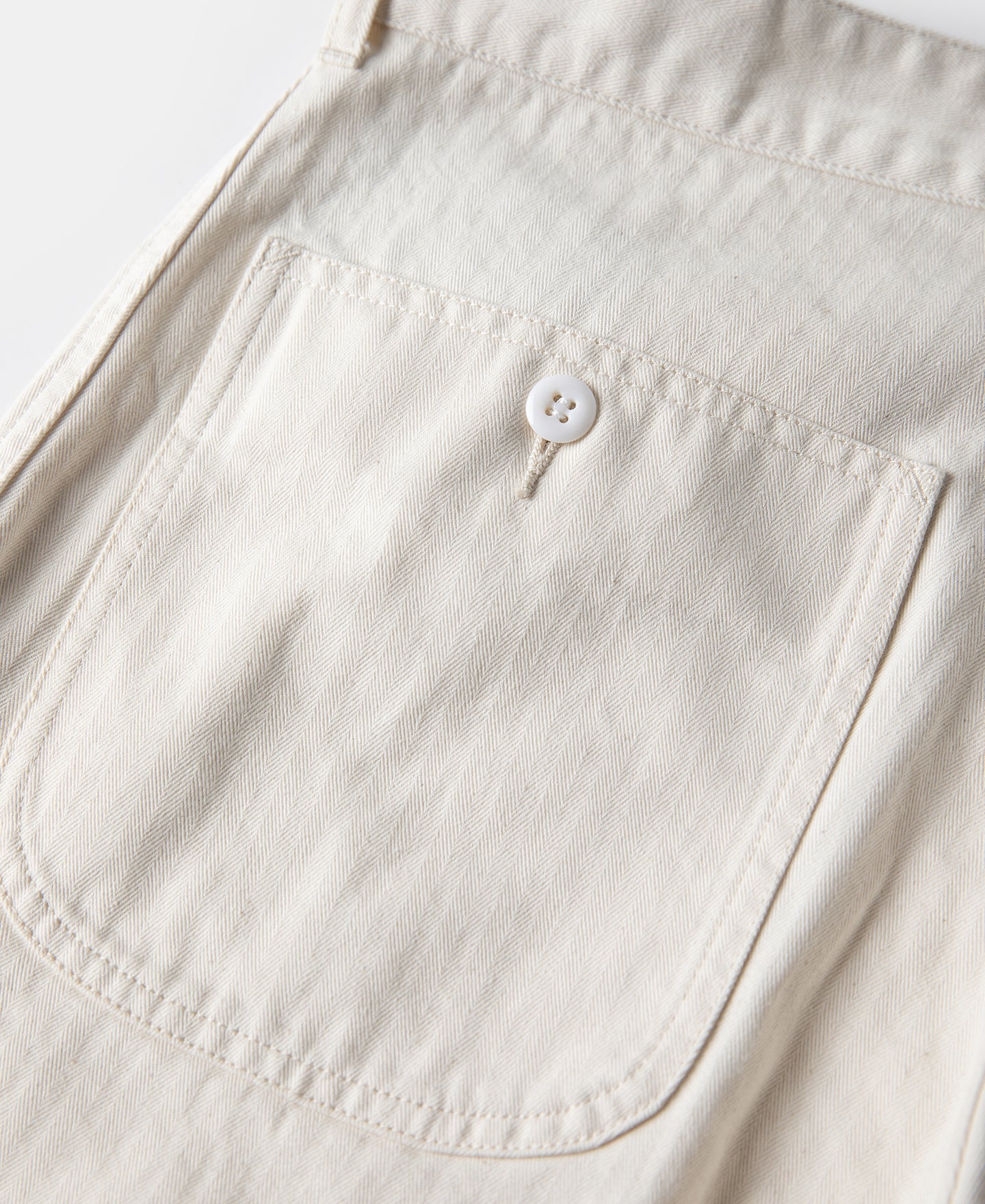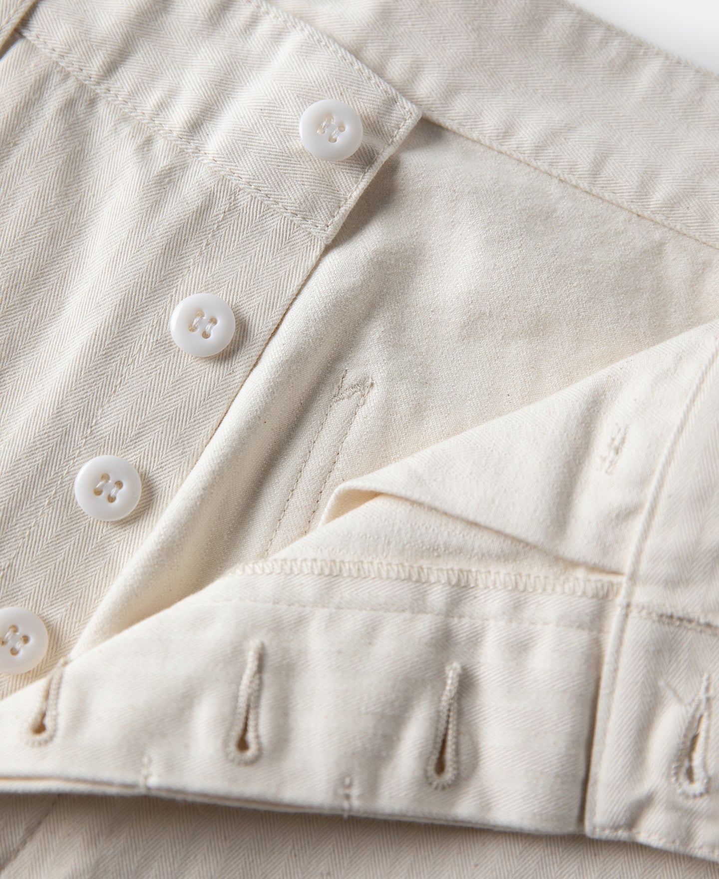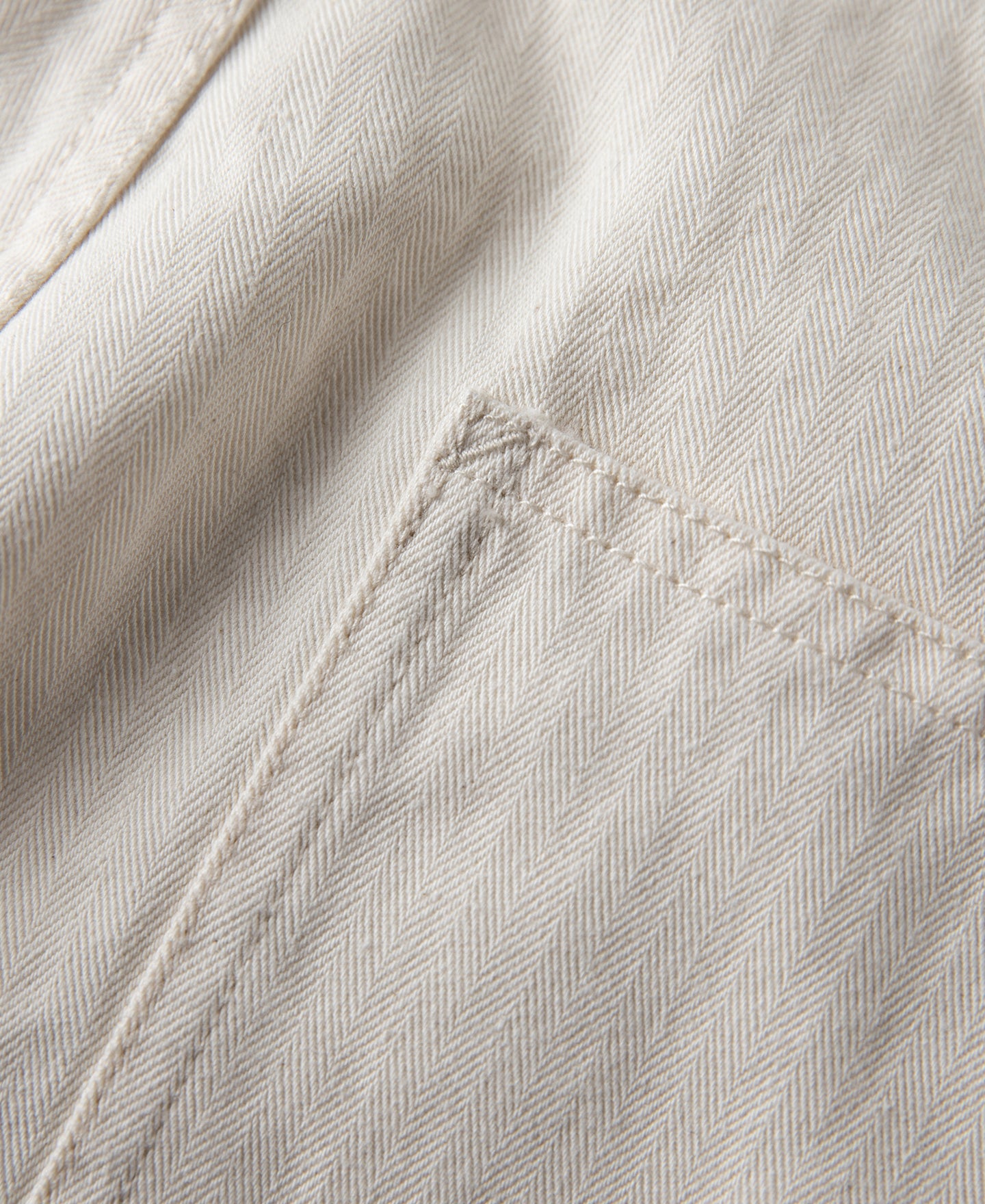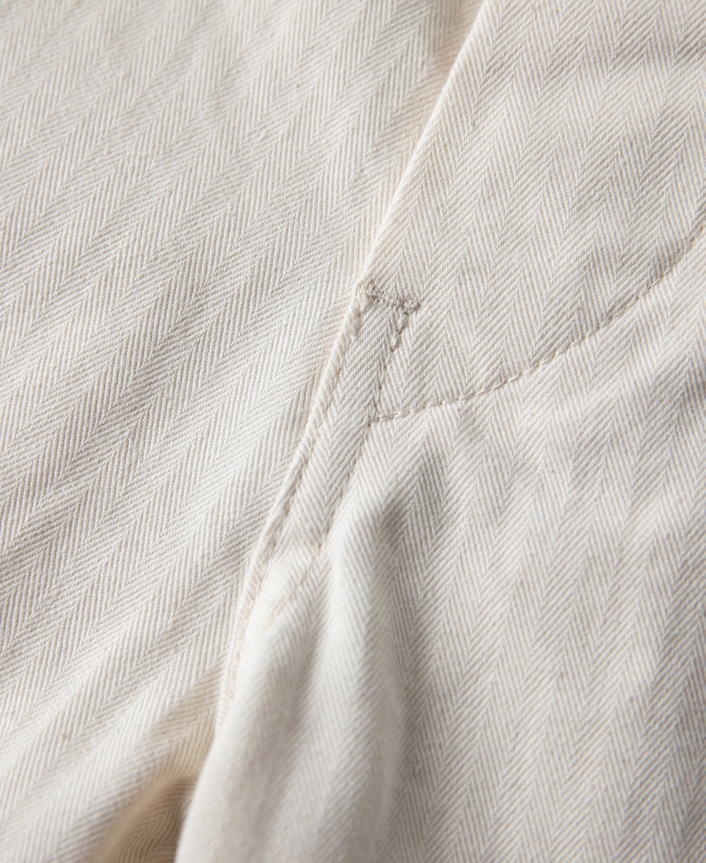 Crafted from 100% custom-woven heavyweight herringbone fabric, the material retains its natural brushed texture for an authentically vintage look. Using traditional fabric finishing techniques, the cloth is air-dried on mesh screens with hot air—ensuring minimal tension during the process. The result is a durable, pre-shrunk fabric that resists wrinkling .