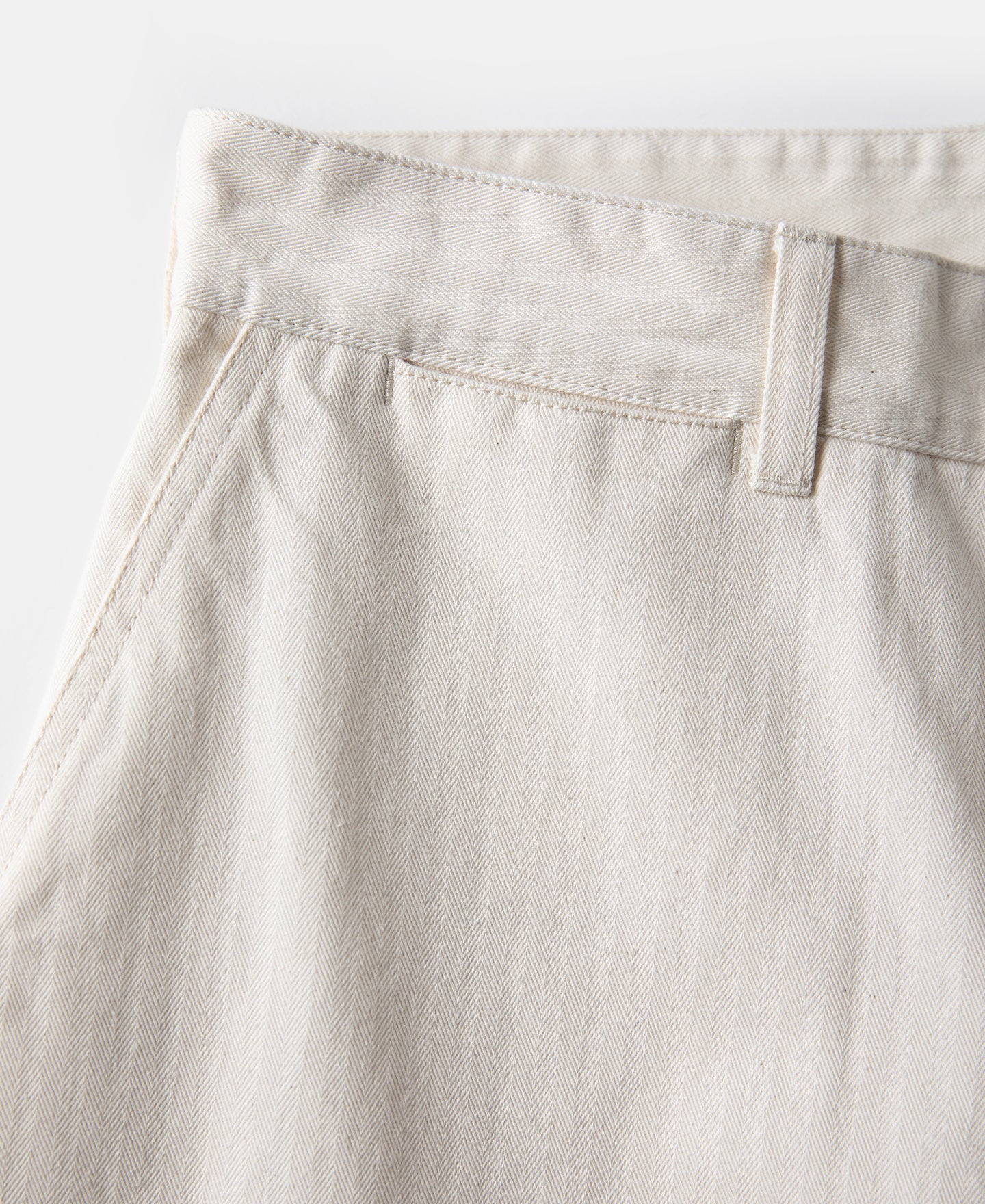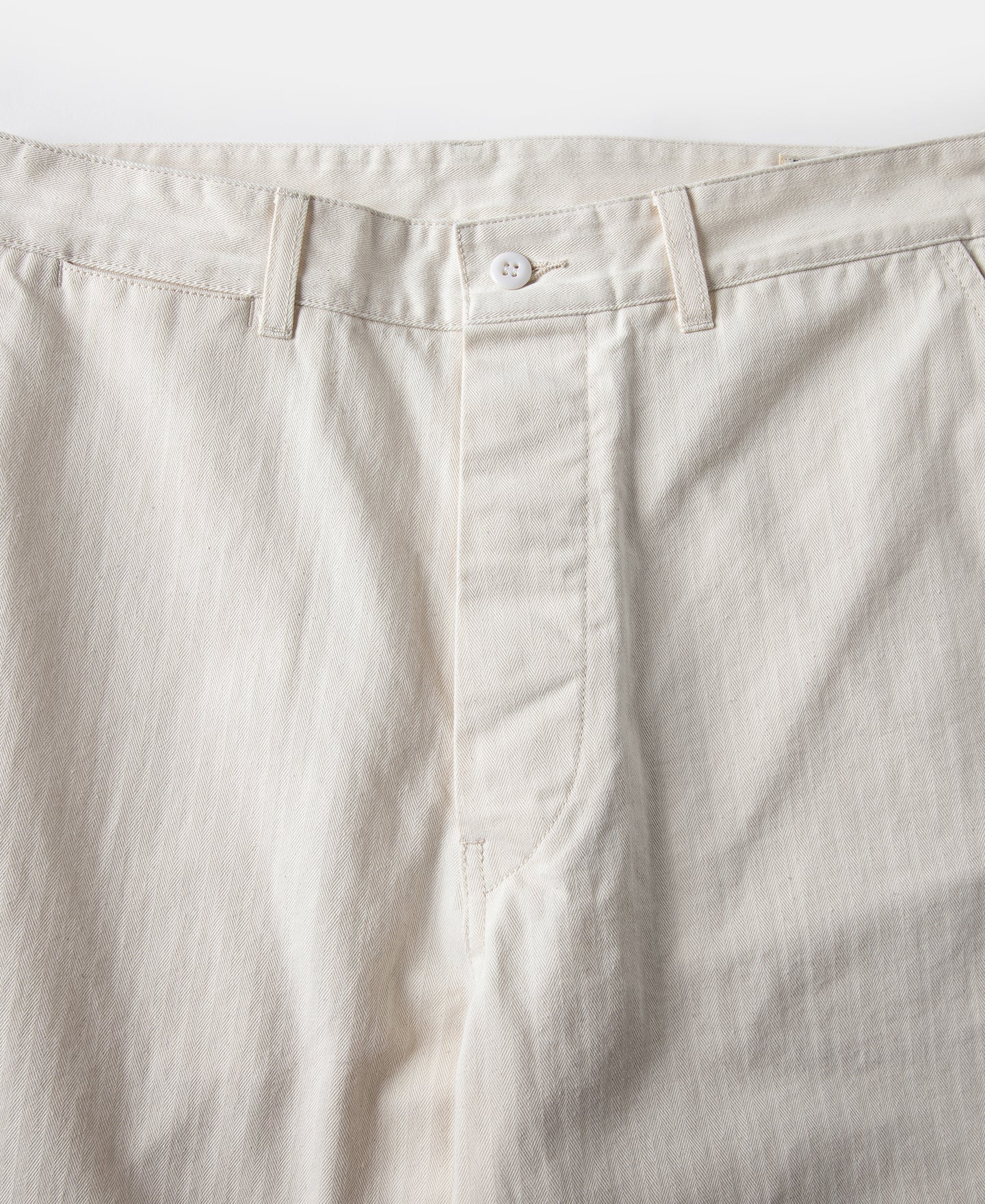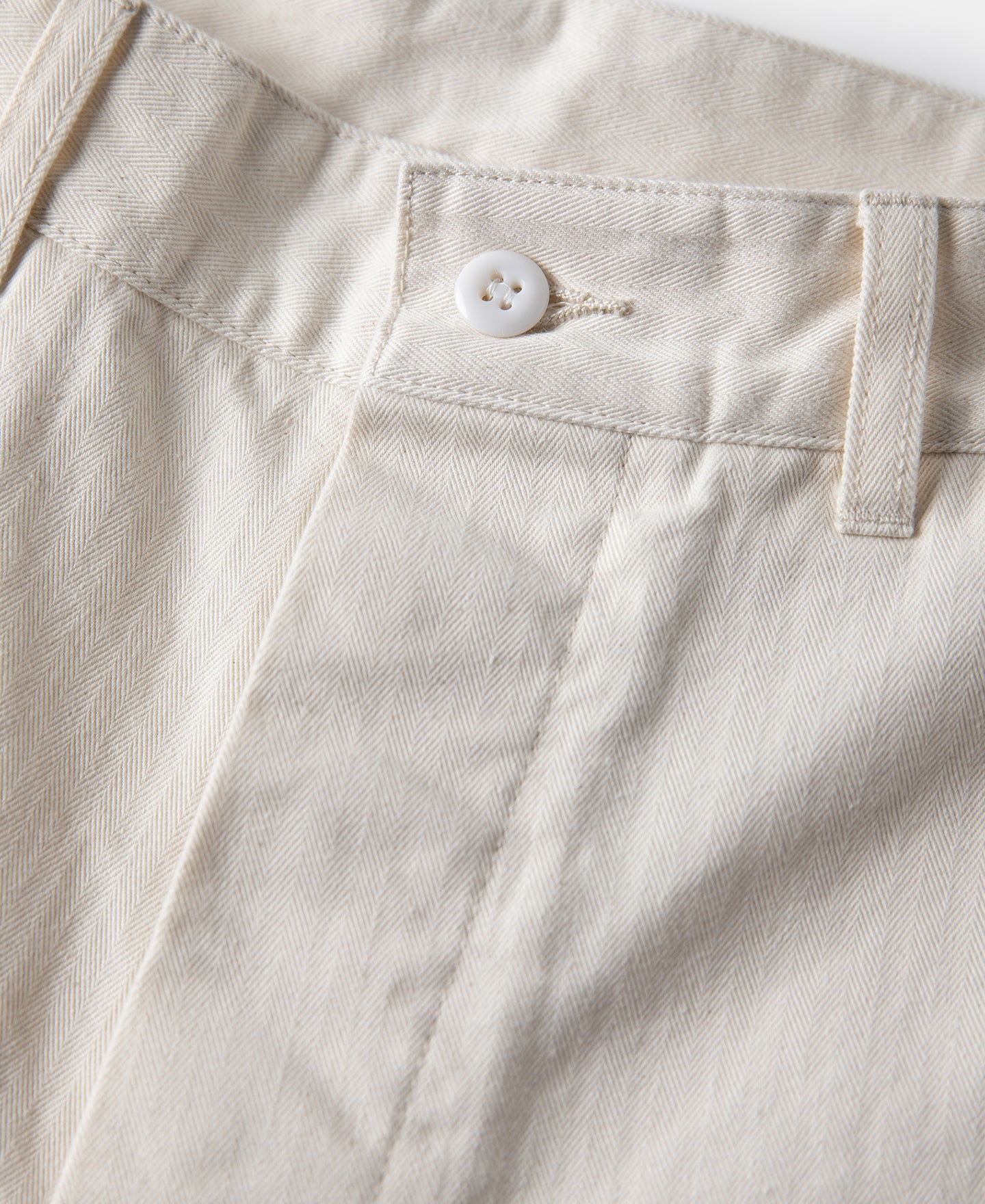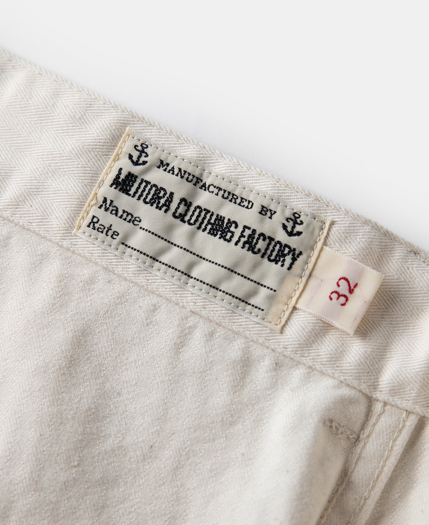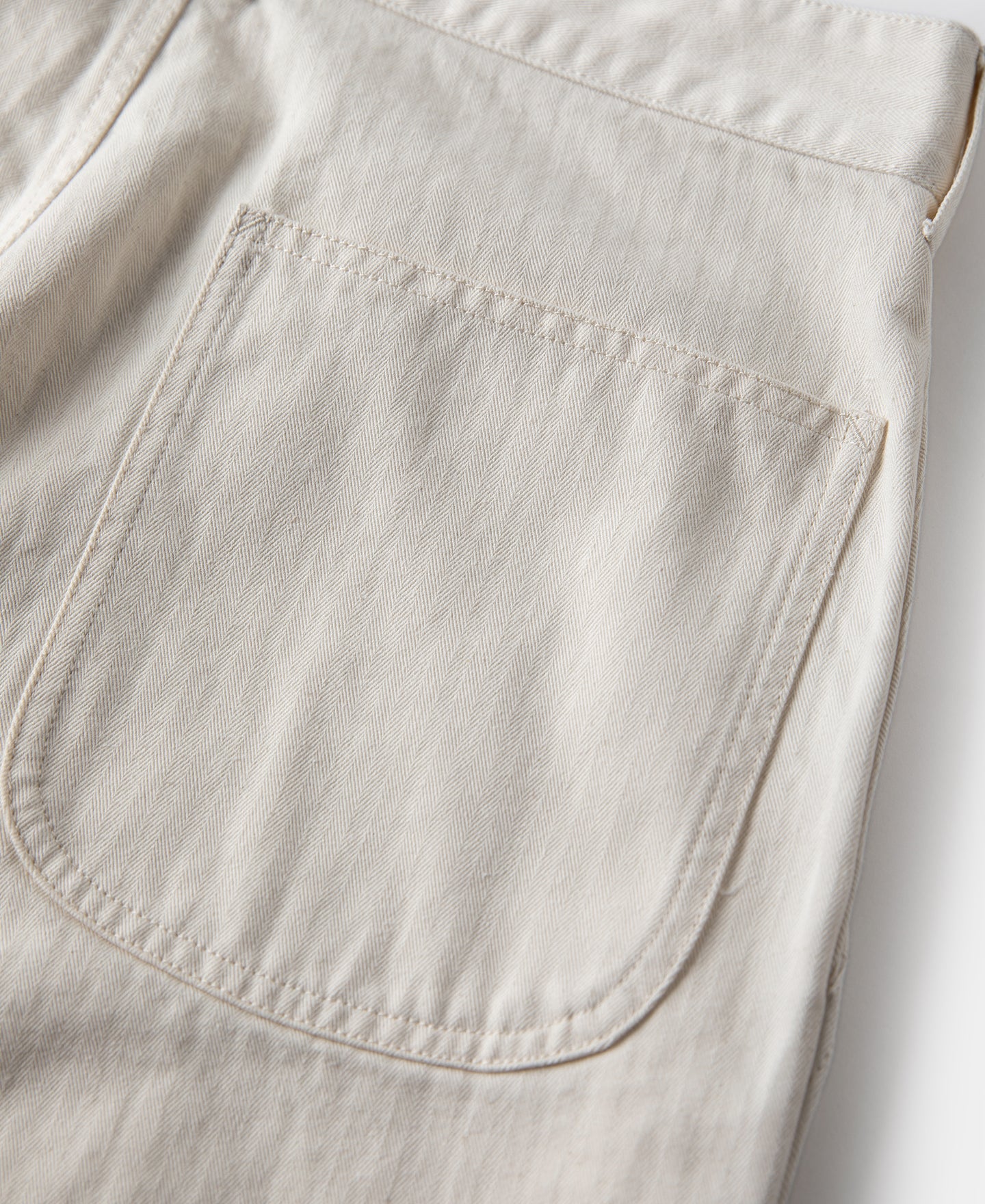 Crafted from 100% custom-woven heavyweight herringbone fabric, the material retains its natural brushed texture for an authentically vintage look. Using traditional fabric finishing techniques, the cloth is air-dried on mesh screens with hot air—ensuring minimal tension during the process. The result is a durable, pre-shrunk fabric that resists wrinkling .