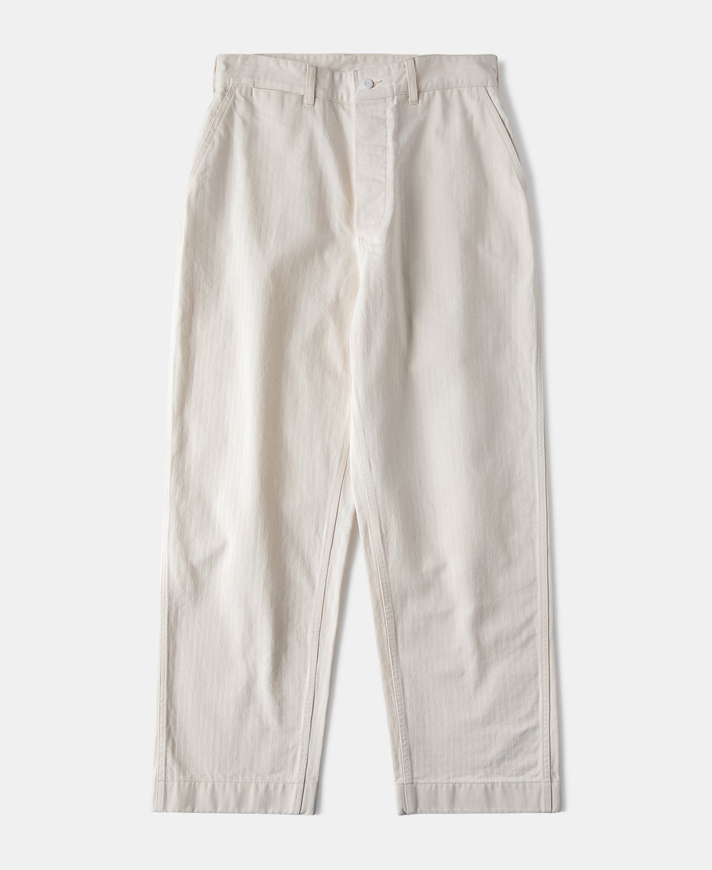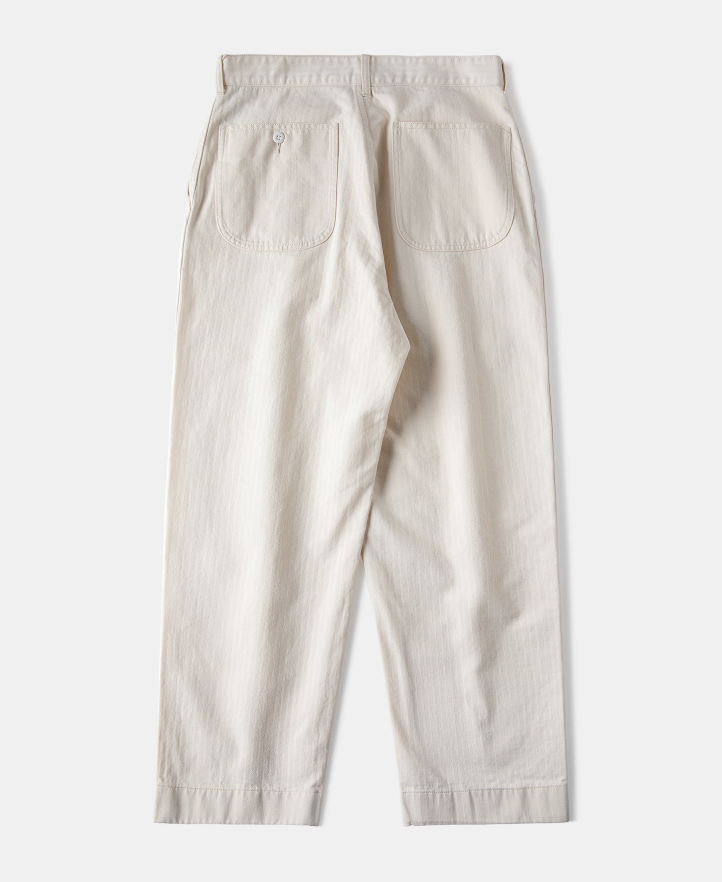 Inspired by the 1950s USMC uniform trousers, these pants feature a classic wide-leg silhouette and a high-waist cut. The distinctive rounded back patch pockets serve as their signature detail, echoing the timeless military aesthetic.