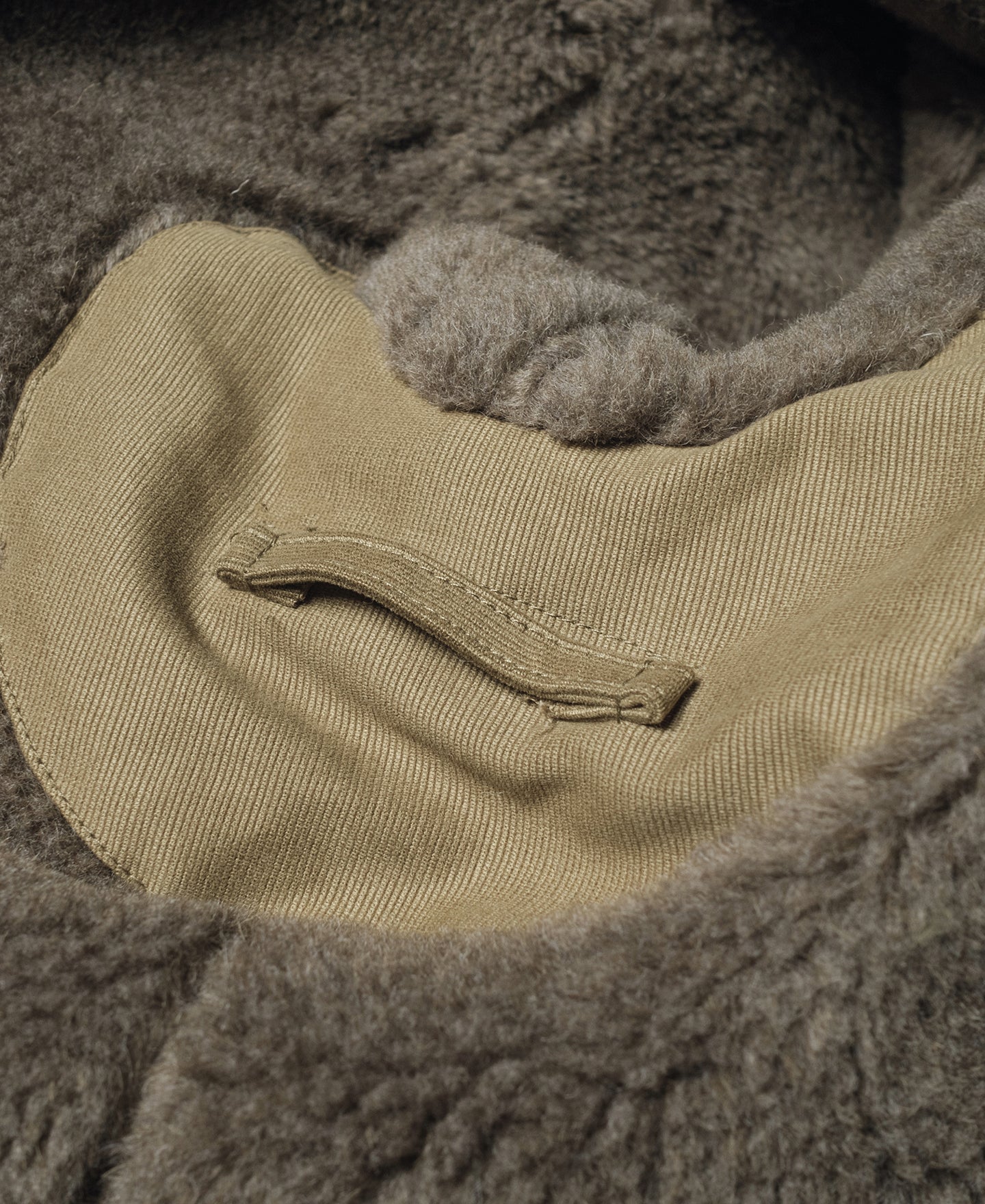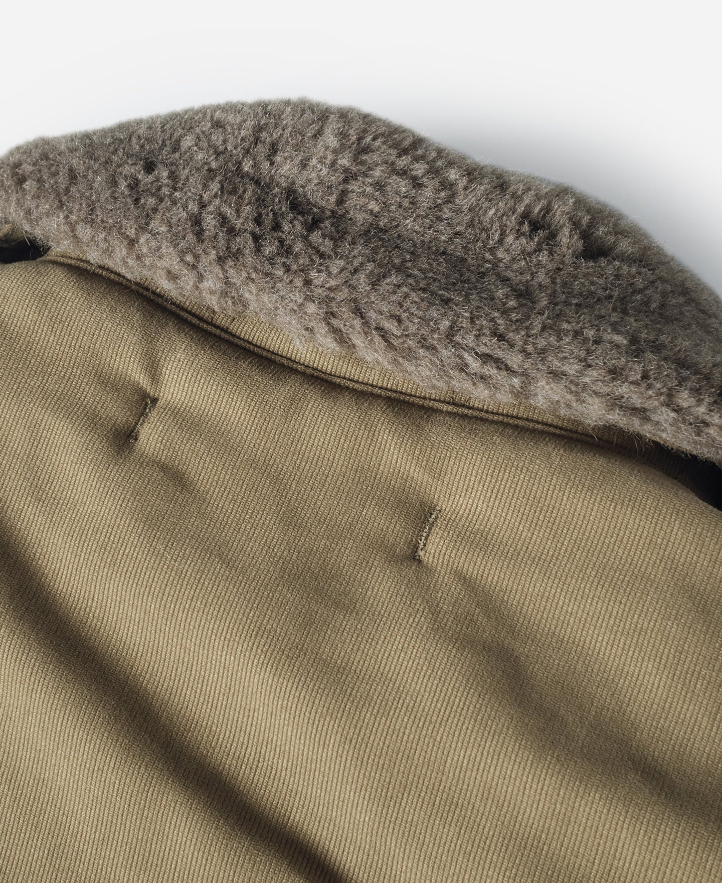 Constructed from heavyweight textured jungle cloth, this jacket offers excellent wind resistance and water repellency. The interior is lined with thick plush wool for outstanding insulation, providing a soft and warm feel without easily shedding. Compared to conventional styles, this jacket is more substantial and can easily handle cold weather when paired with a sweatshirt. The optimized cut ensures a comfortable fit with a well-balanced combination of inner and outer fabrics. -