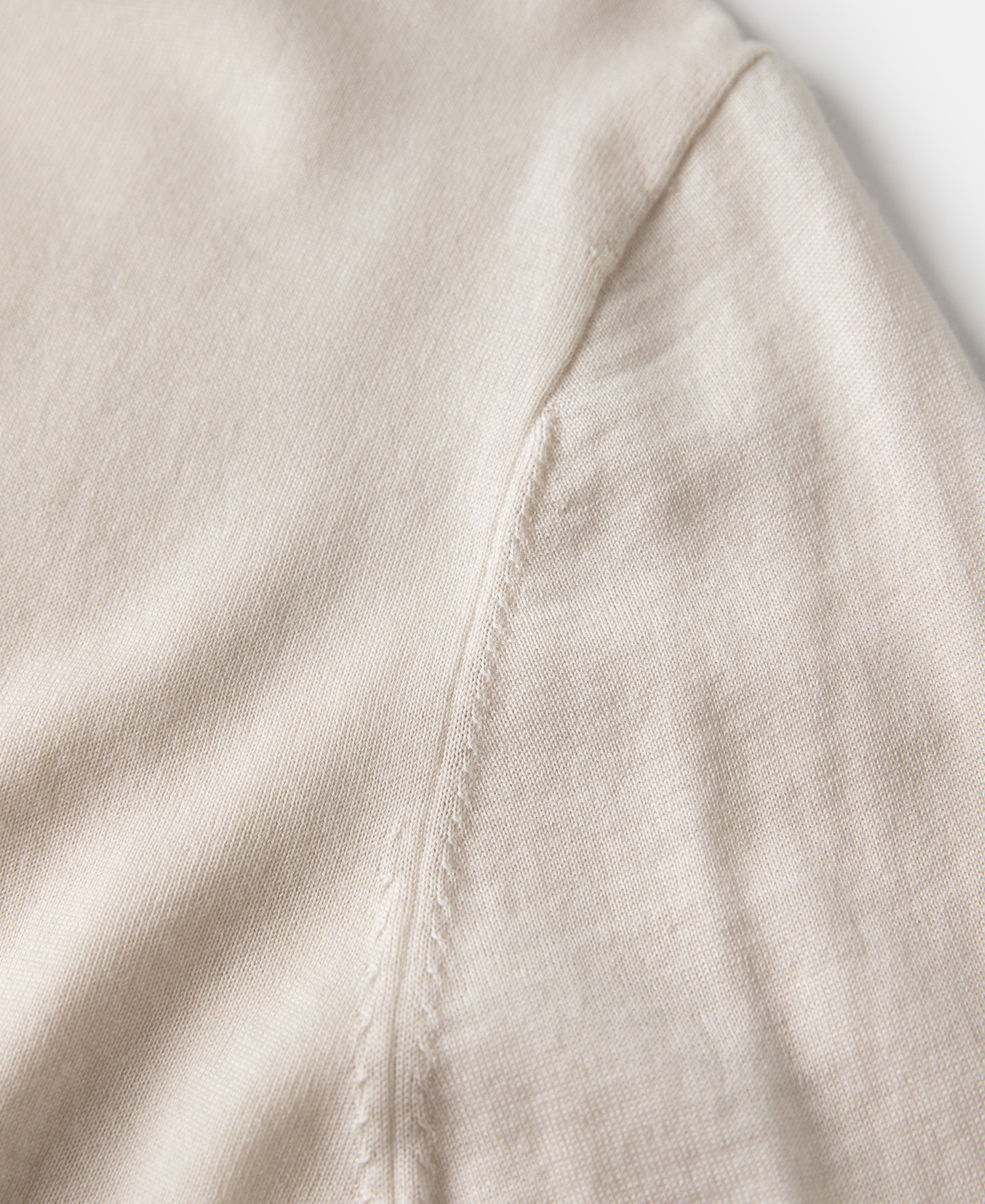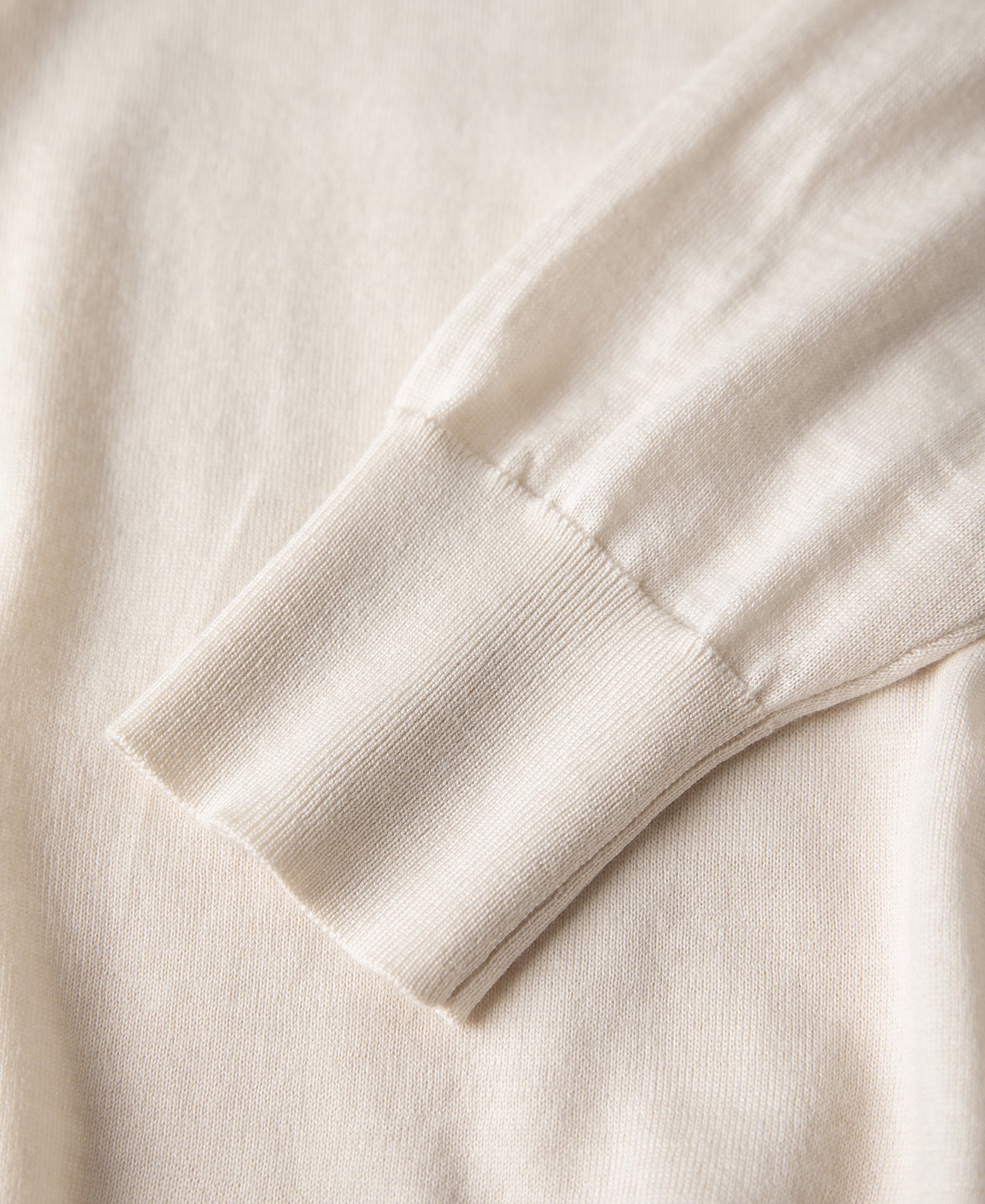 The fibers are processed to smooth the natural scales, so the touch is genuinely non-itch — even at the neck where most wool fails.