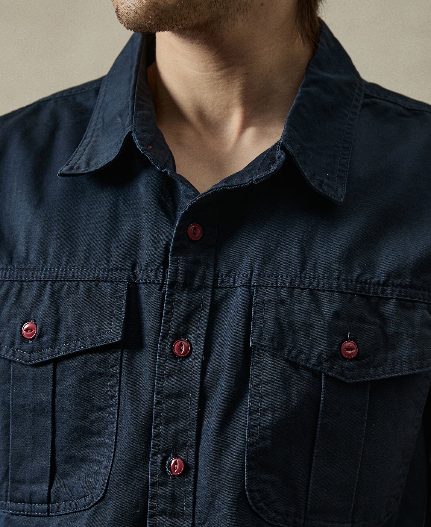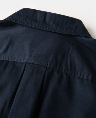 Made from 100% plain weave cotton for a crisp hand feel. It features twin pleated chest pockets and contrast buttons for a subtle visual pop. Designed in a classic straight cut with a curved hem—versatile enough to wear as an overshirt or light shirt jacket. Just pair it with work trousers to complete a timeless look.