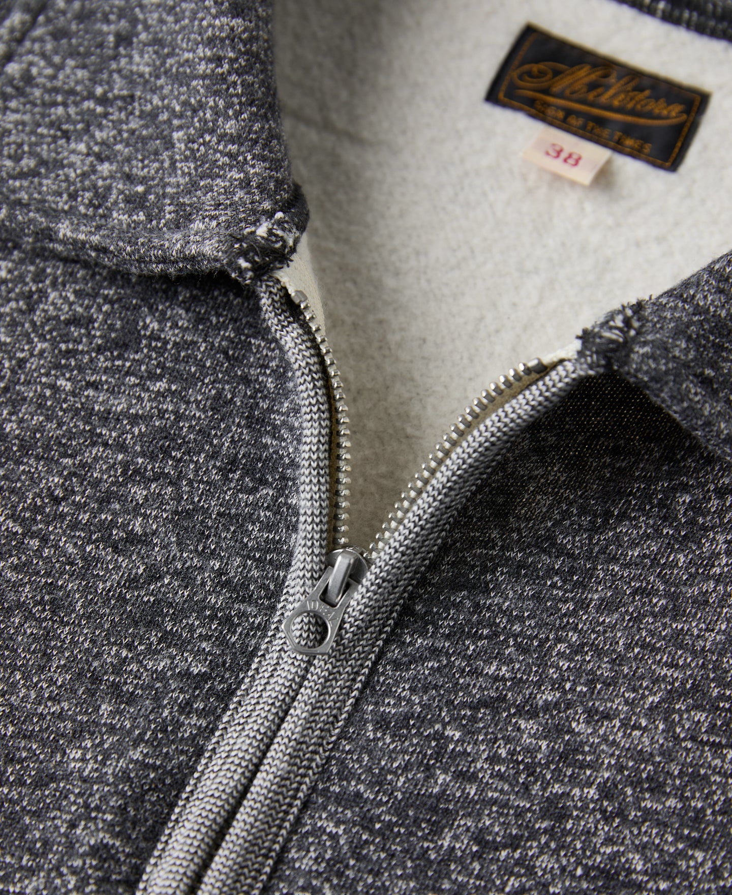 Crafted from 400g deep heather gray cotton fleece with a soft, brushed interior. It features a vintage metal IDEAL zipper and ribbed cuffs and hem.