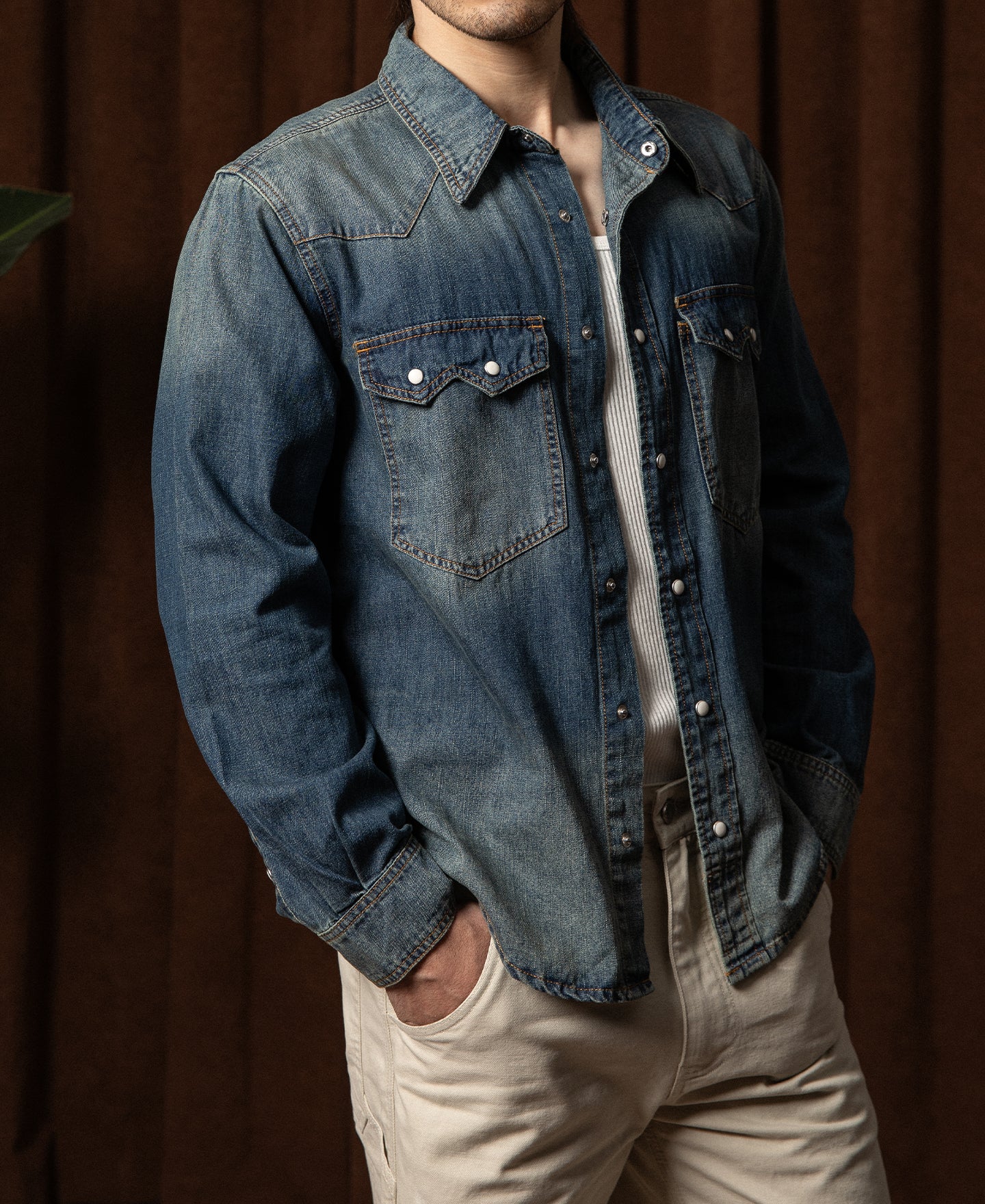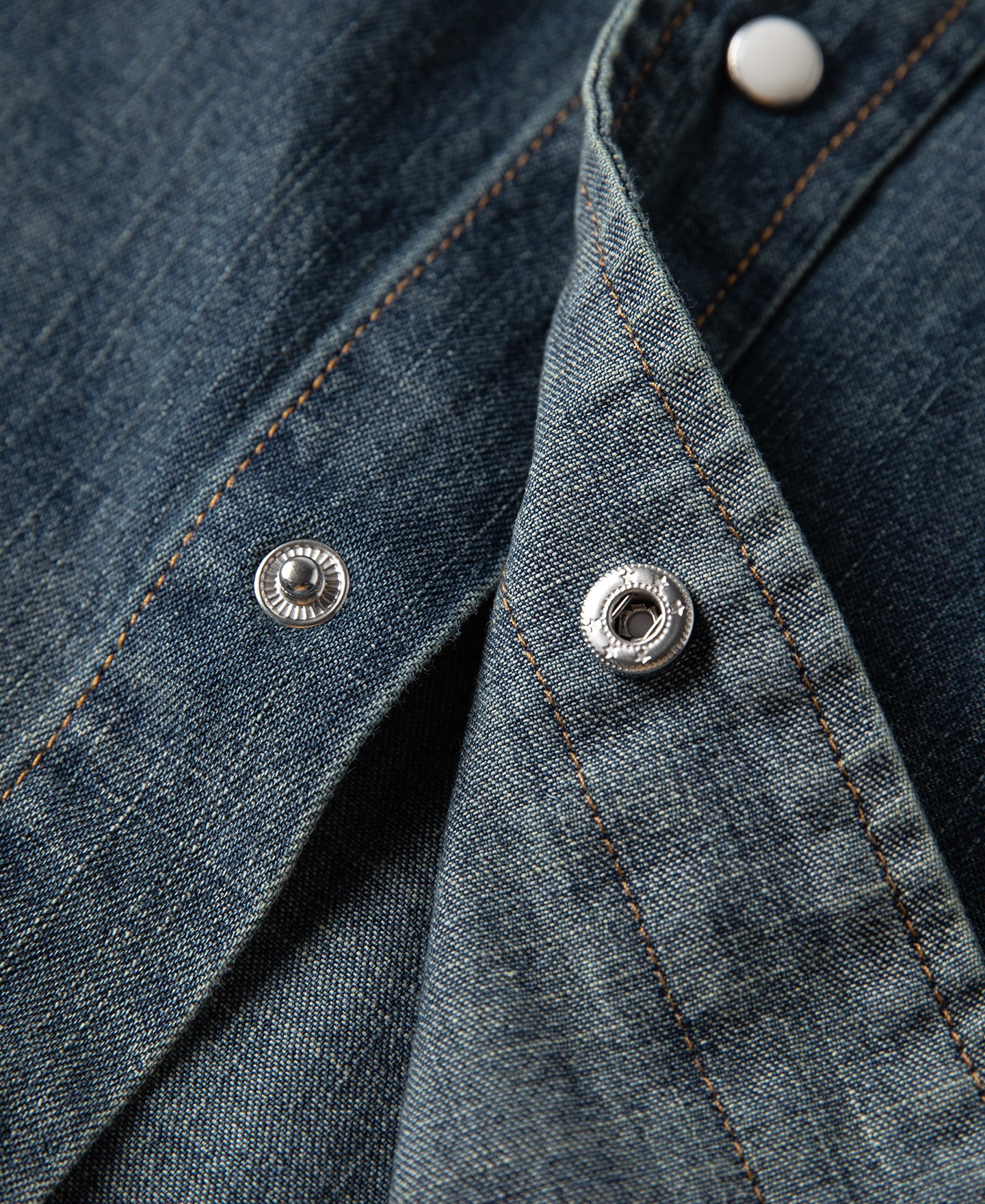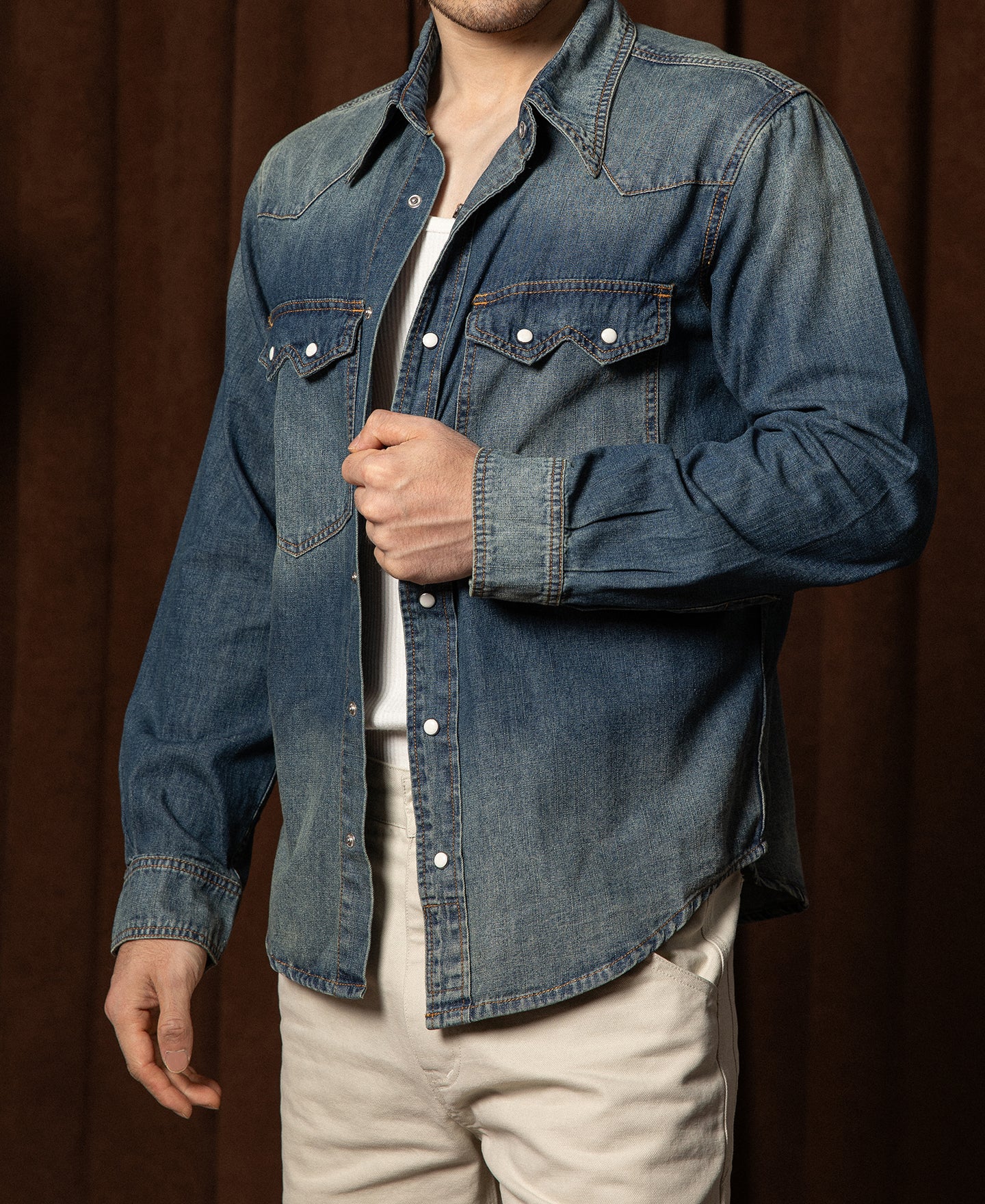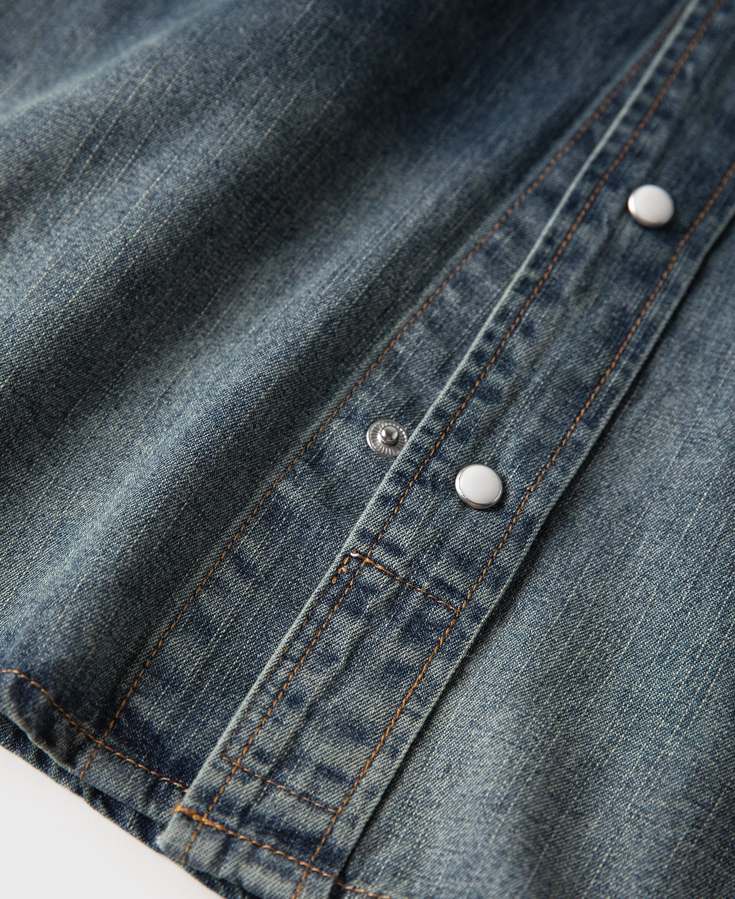 • A classic Western shirt made from soft 210g slub denim. Lightweight and breathable, available in three washes—light wash, heavy wash, and dark indigo. It features signature pointed Western yoke stitching, faux pearl snap buttons, and sawtooth pocket flaps for an authentic vintage cowboy look—minus the embroidery.