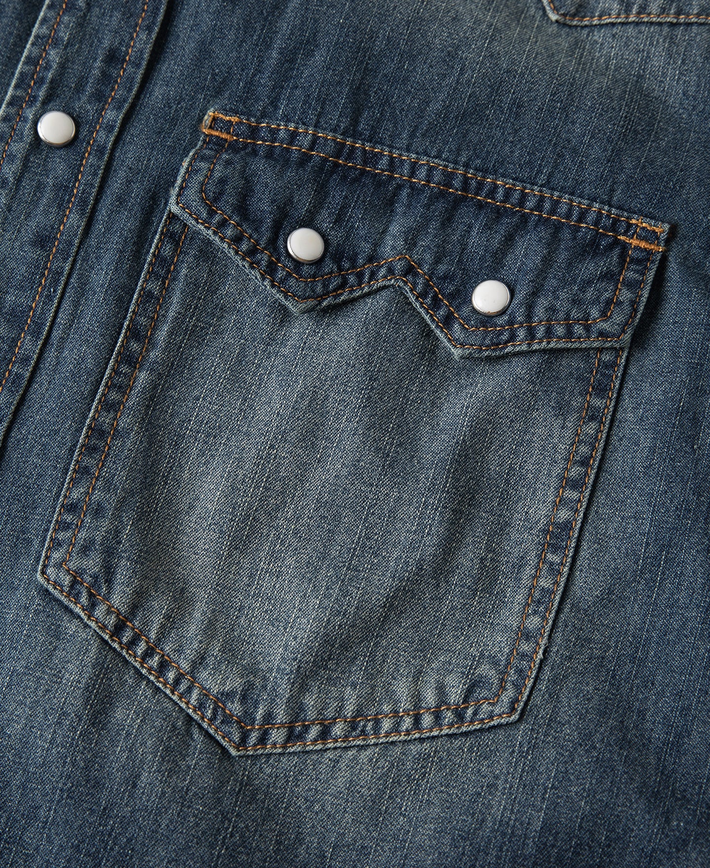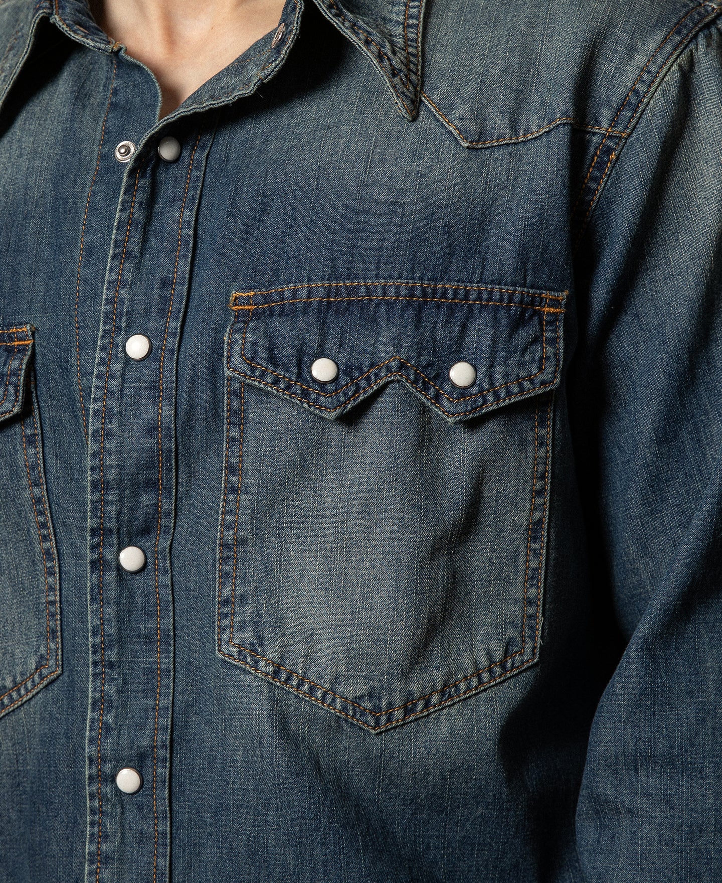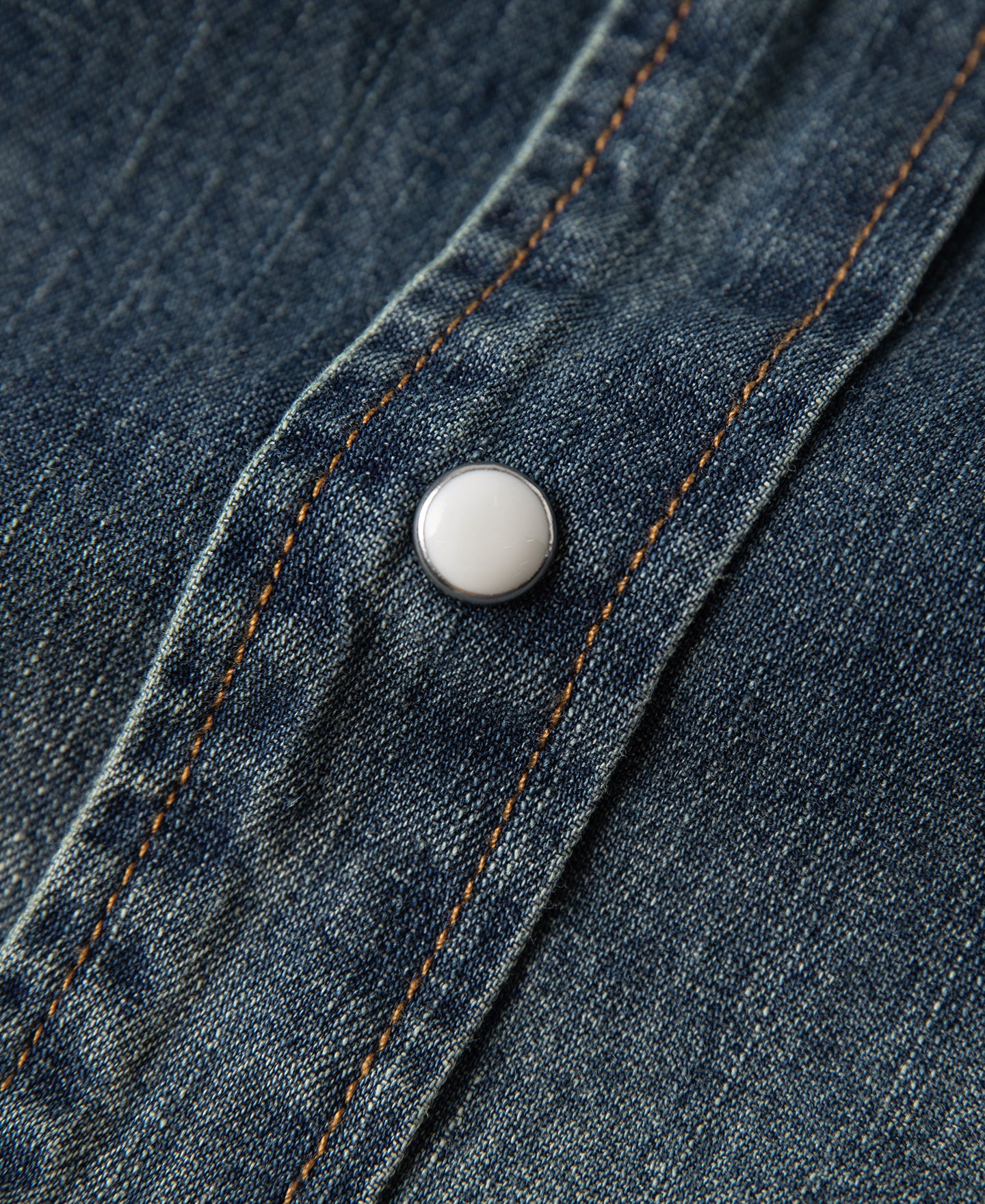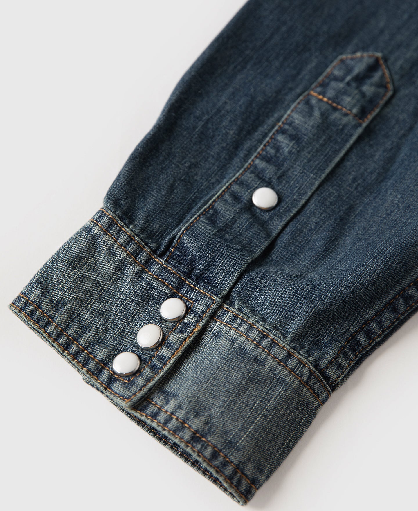• A classic Western shirt made from soft 210g slub denim. Lightweight and breathable, available in three washes—light wash, heavy wash, and dark indigo. It features signature pointed Western yoke stitching, faux pearl snap buttons, and sawtooth pocket flaps for an authentic vintage cowboy look—minus the embroidery.