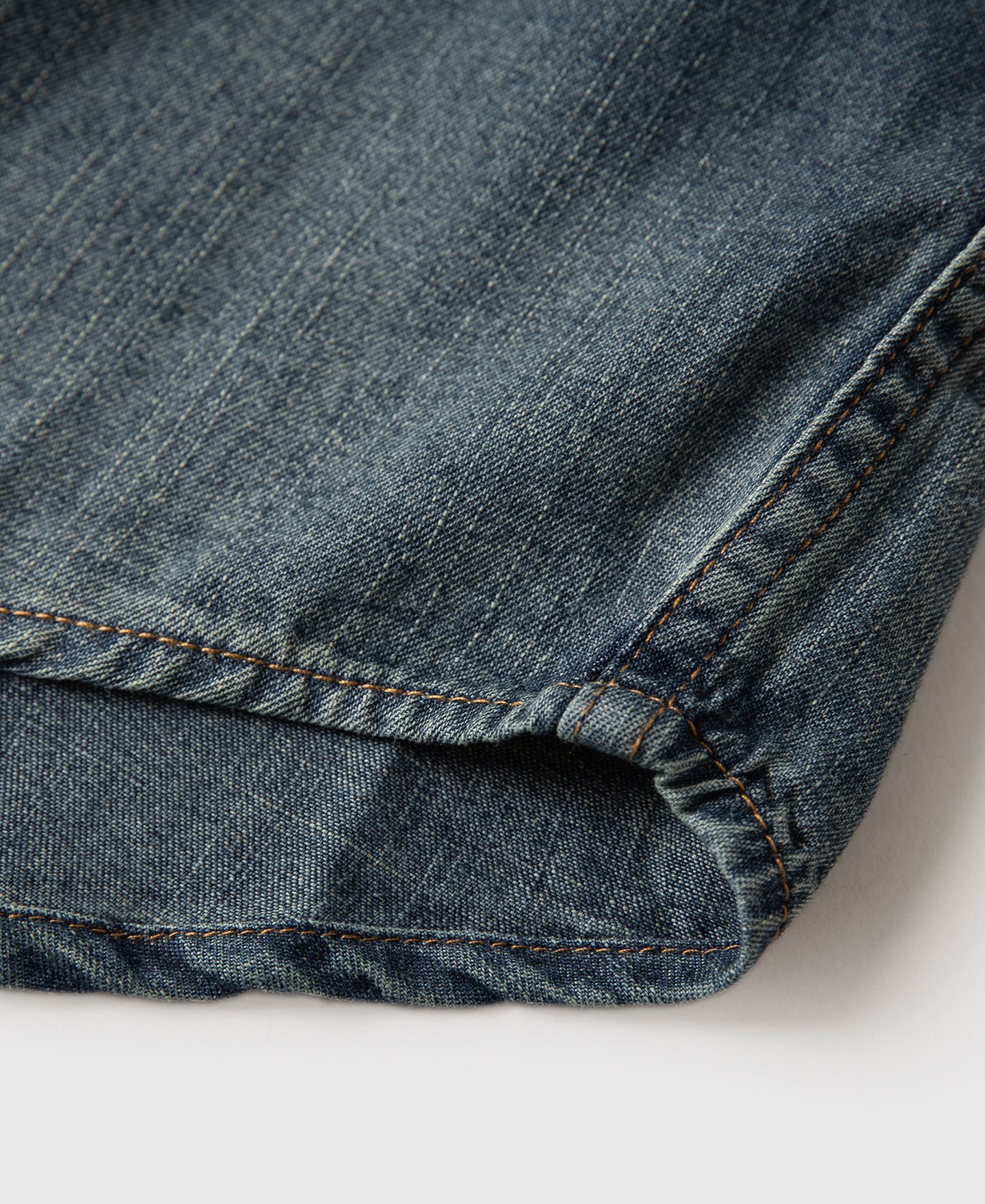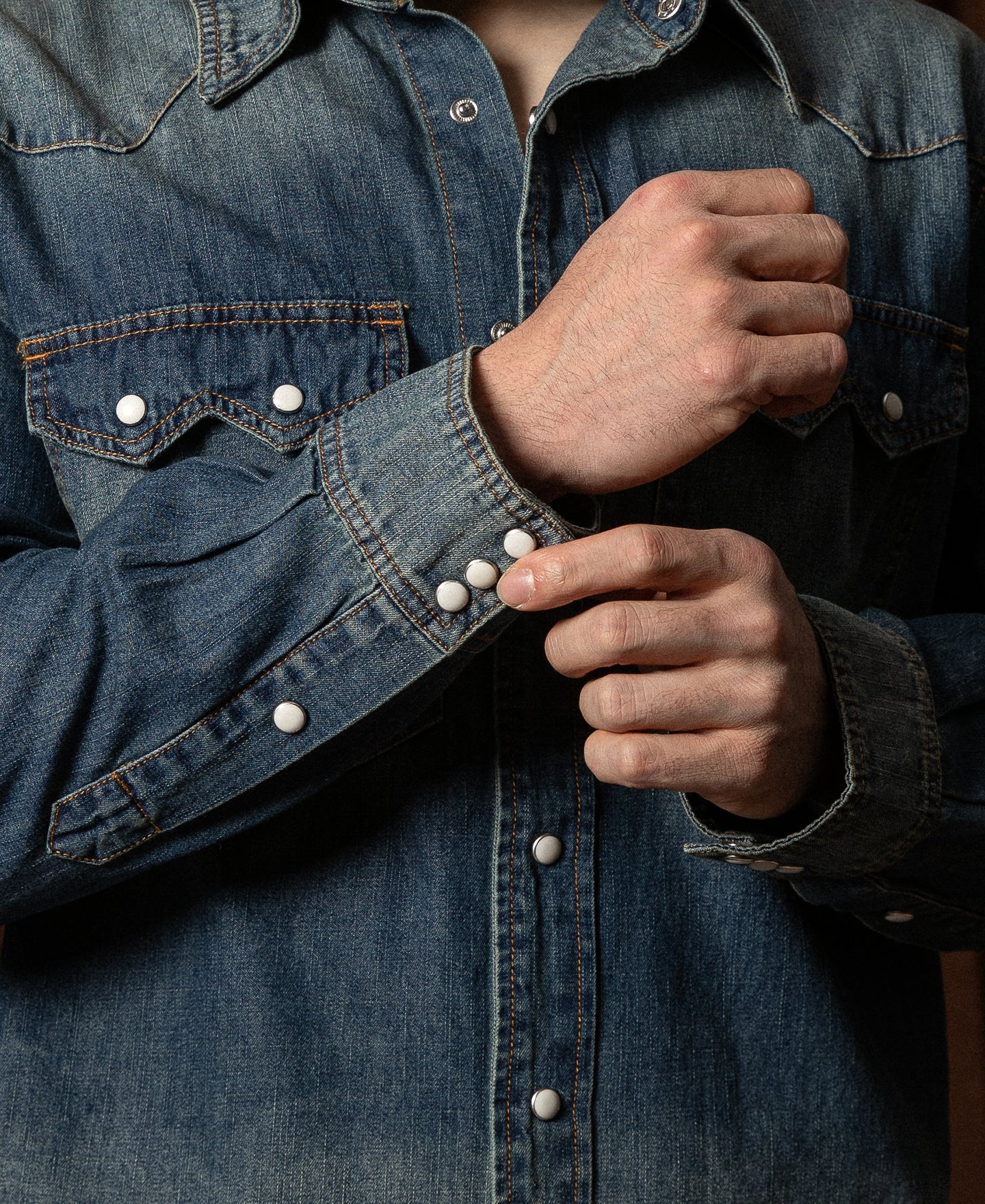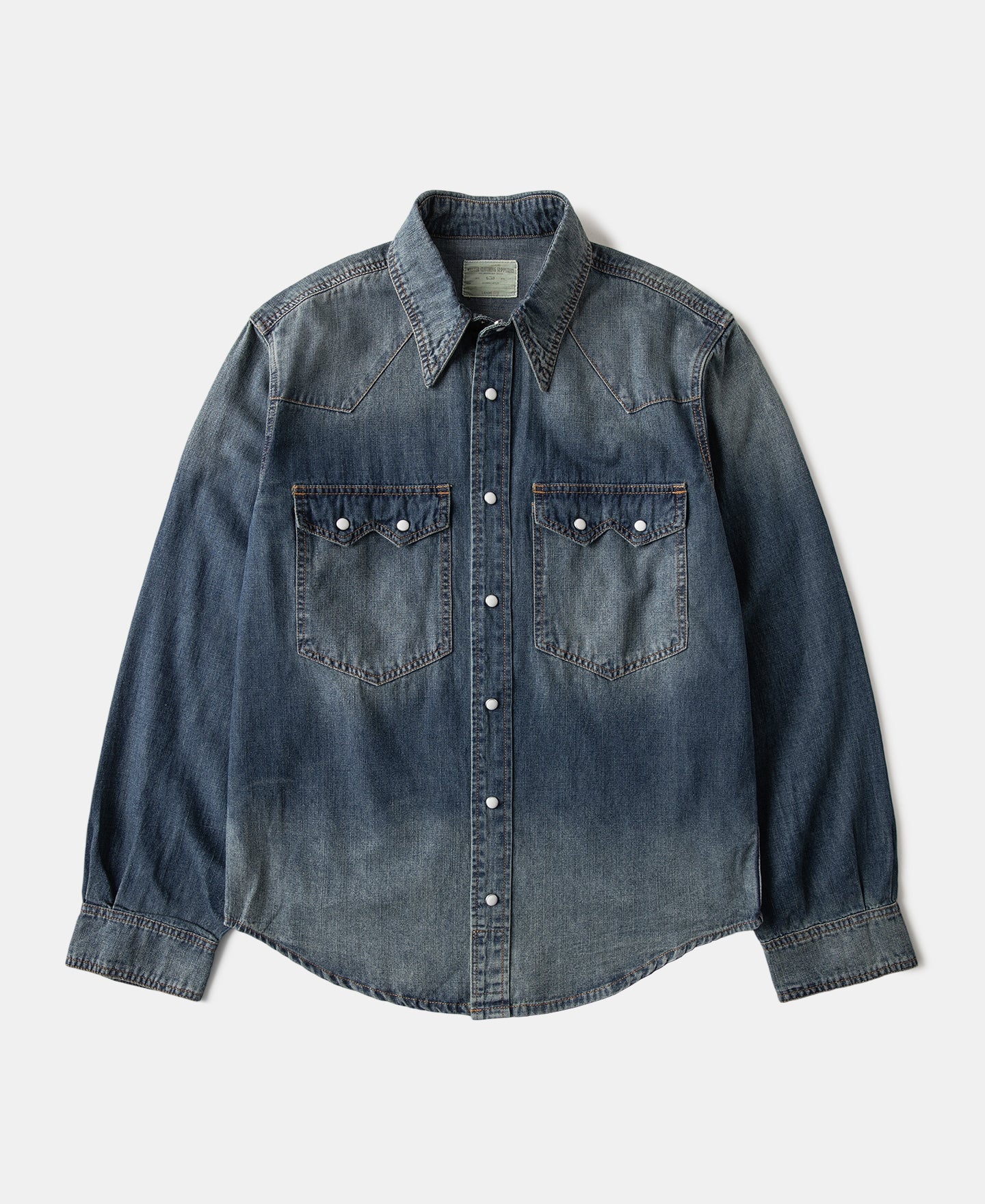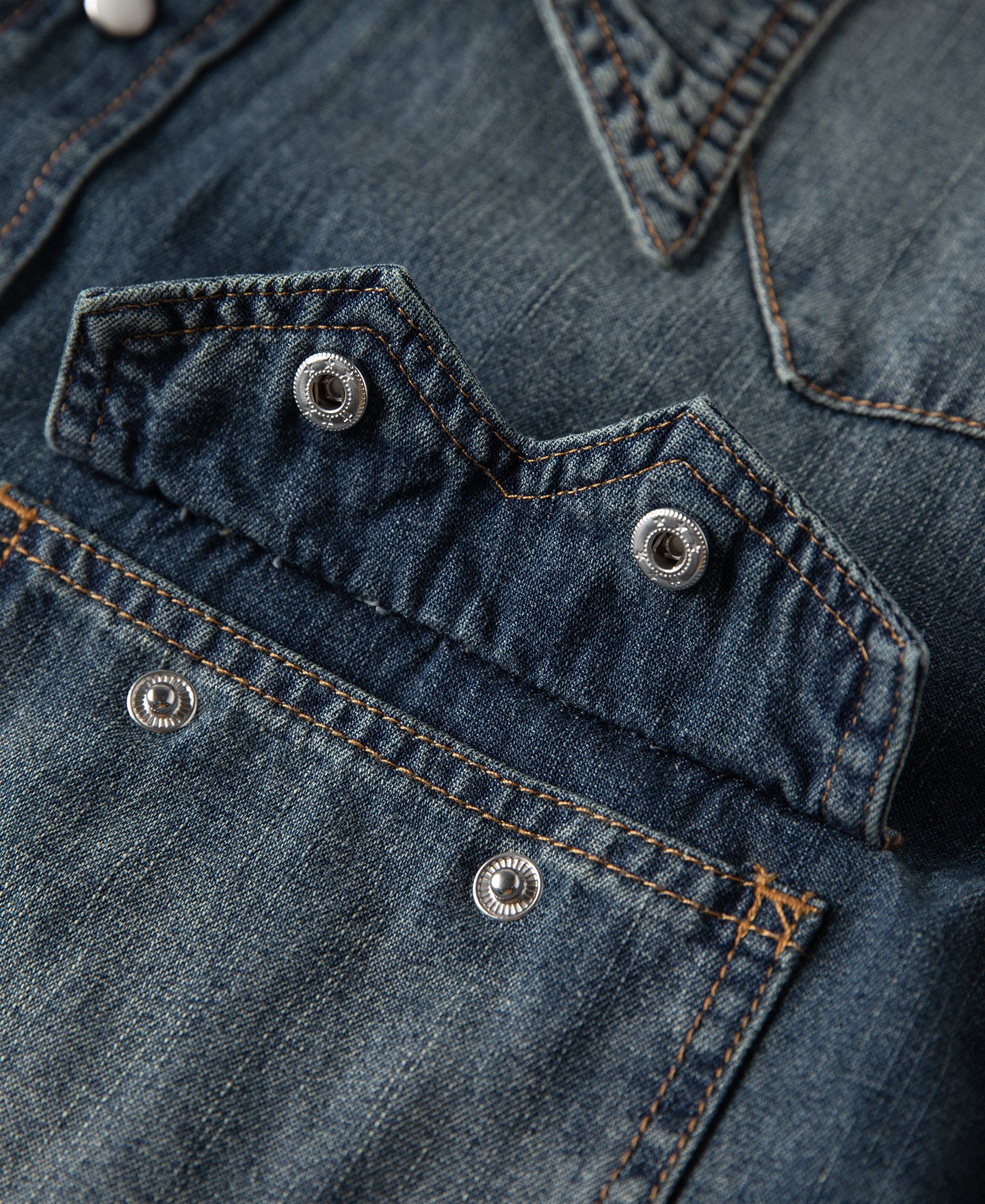 • A classic Western shirt made from soft 210g slub denim. Lightweight and breathable, available in three washes—light wash, heavy wash, and dark indigo. It features signature pointed Western yoke stitching, faux pearl snap buttons, and sawtooth pocket flaps for an authentic vintage cowboy look—minus the embroidery.