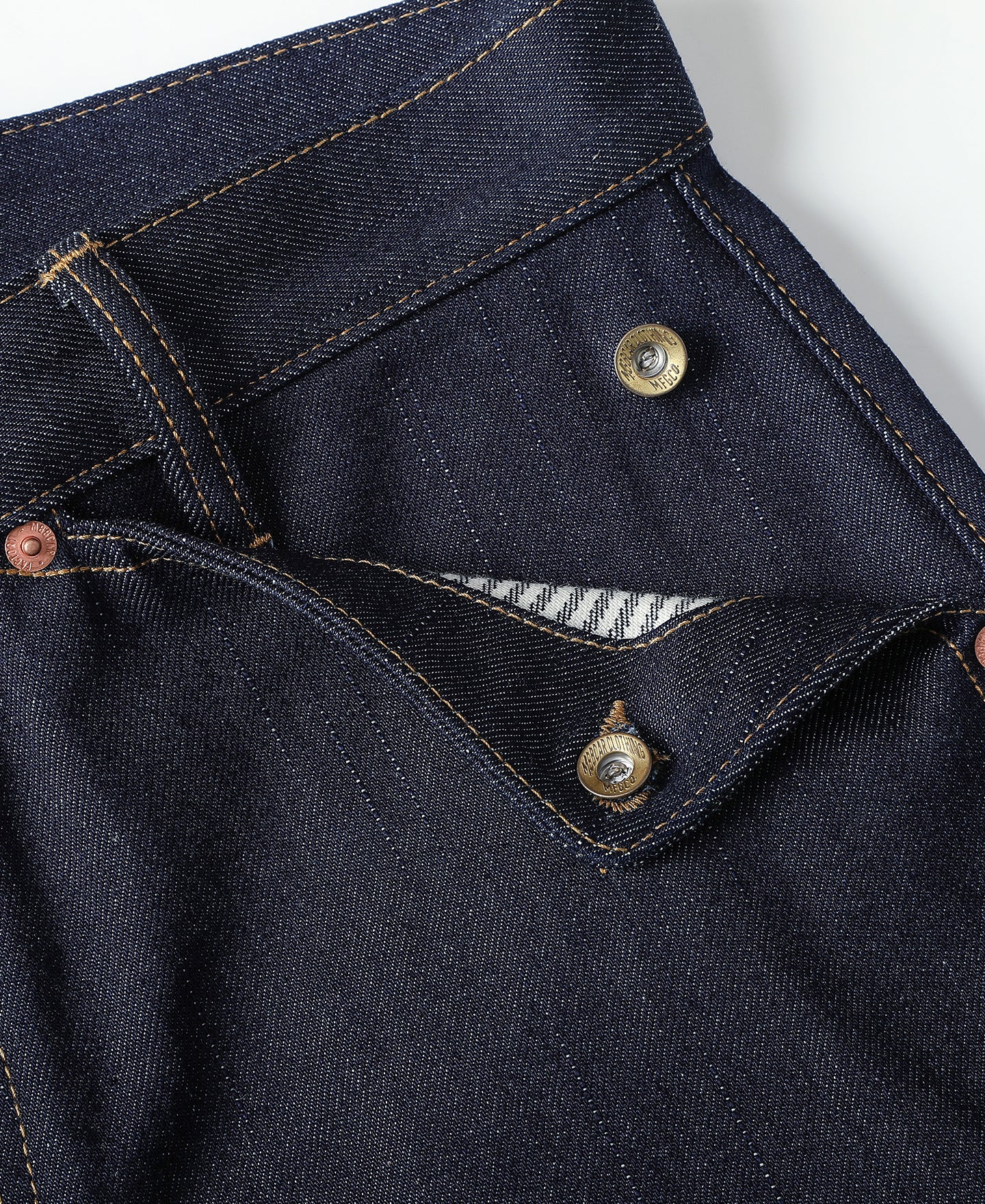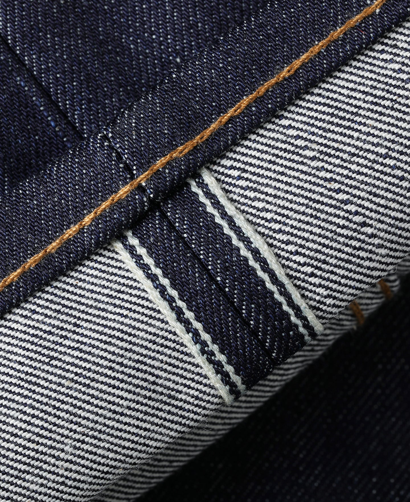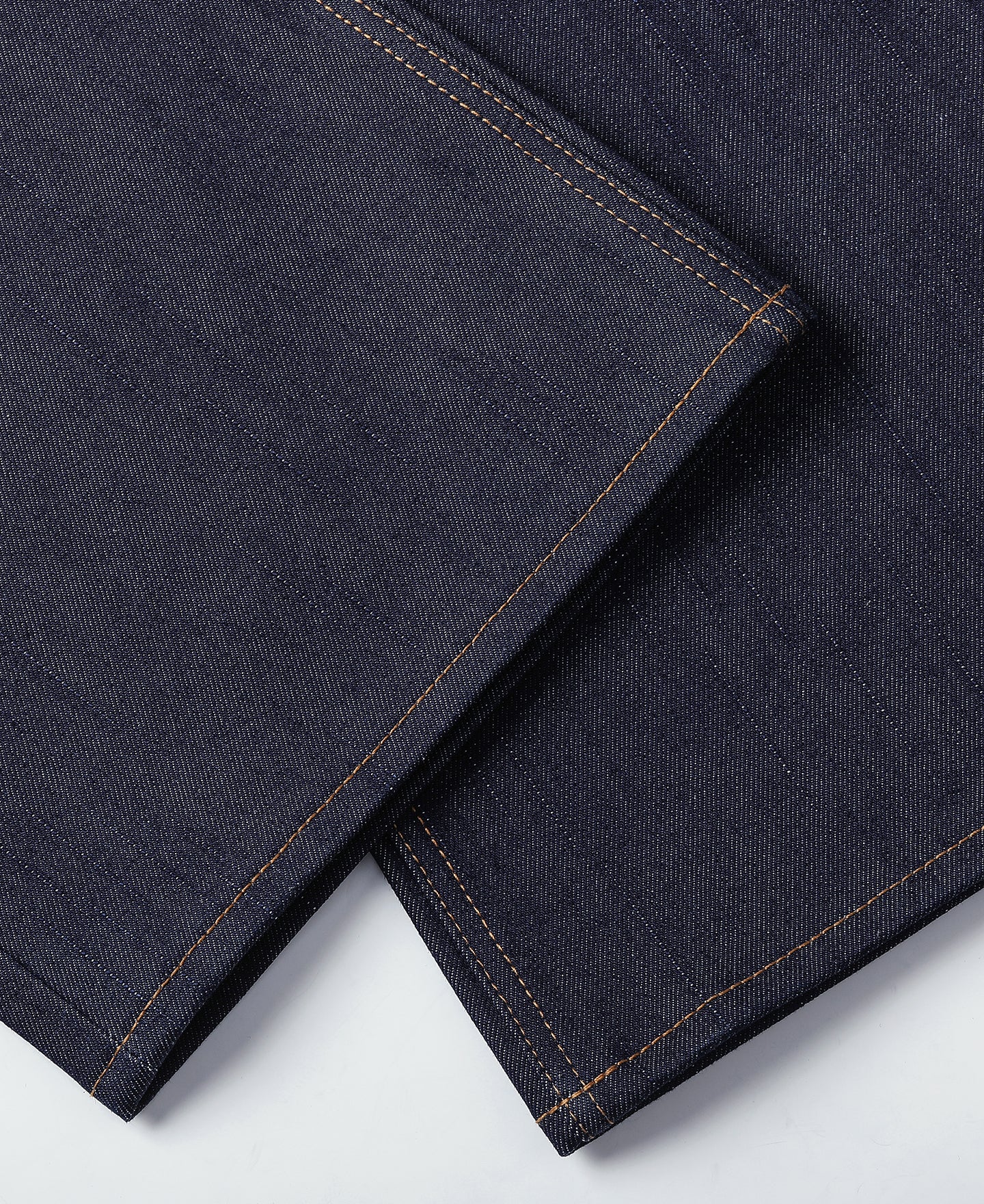 The rope-dyed, high-twist ring-spun yarns give the fabric a clean yet richly layered surface with exceptional durability and depth of color.
