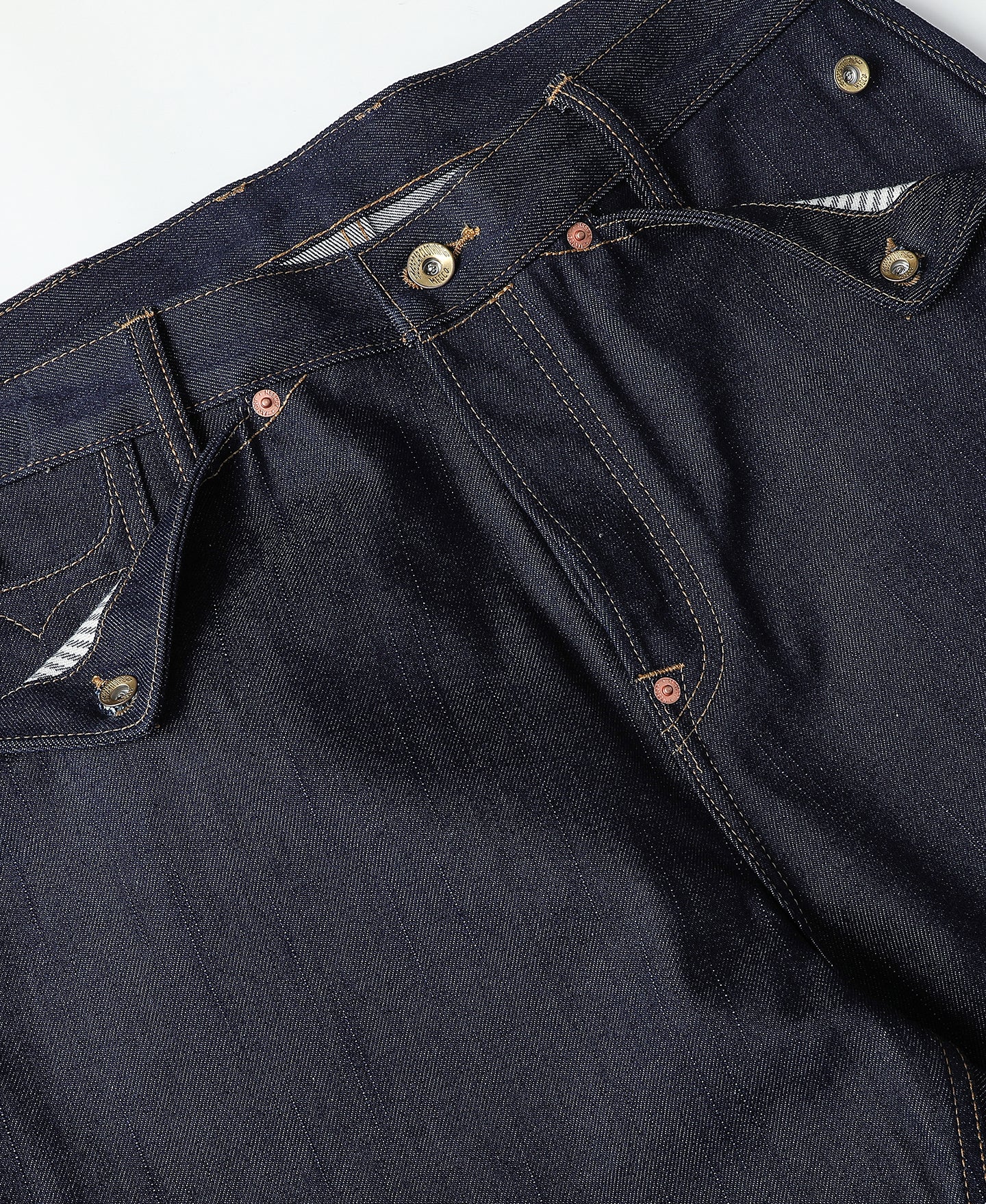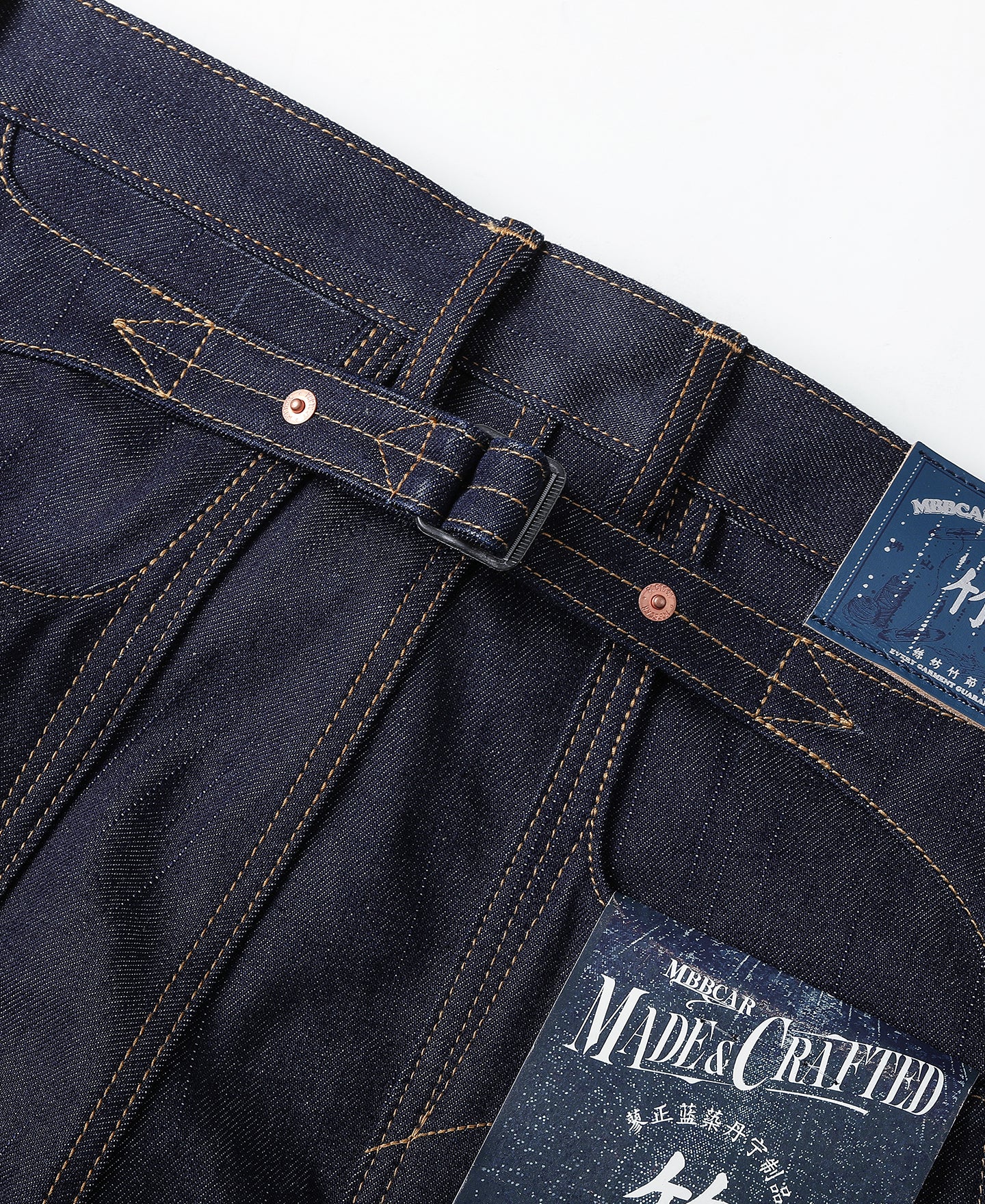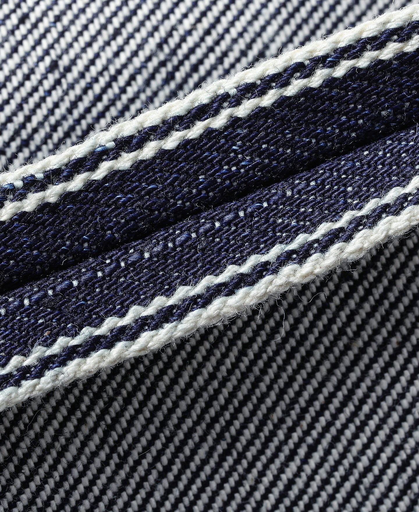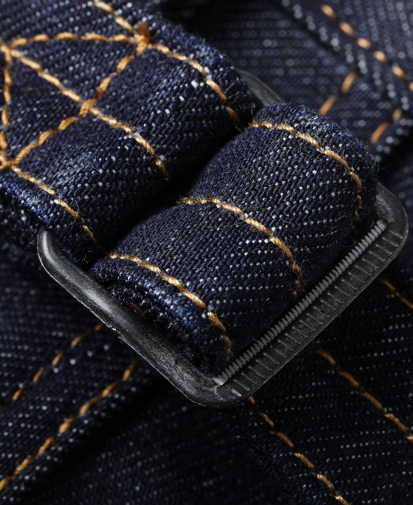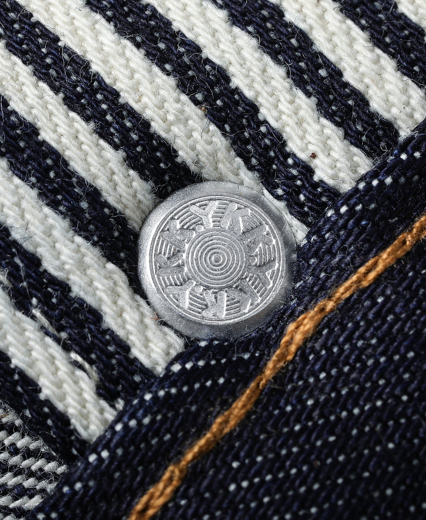 Crafted from 17.7oz kasuri-patterned denim woven on vintage looms, this piece highlights the traditional kasuri technique — a weaving method that creates subtle, irregular patterns for a unique textured look.