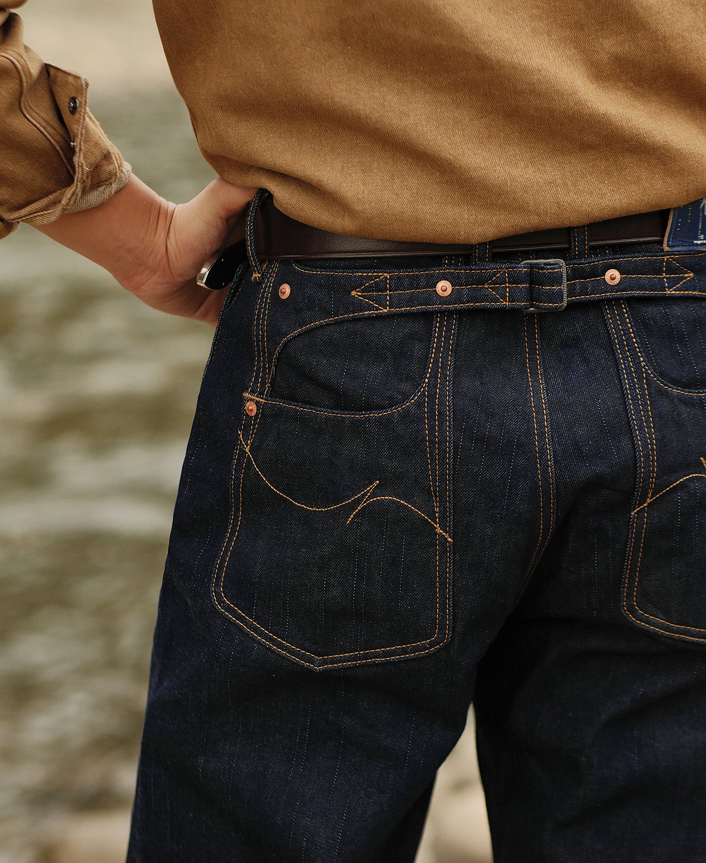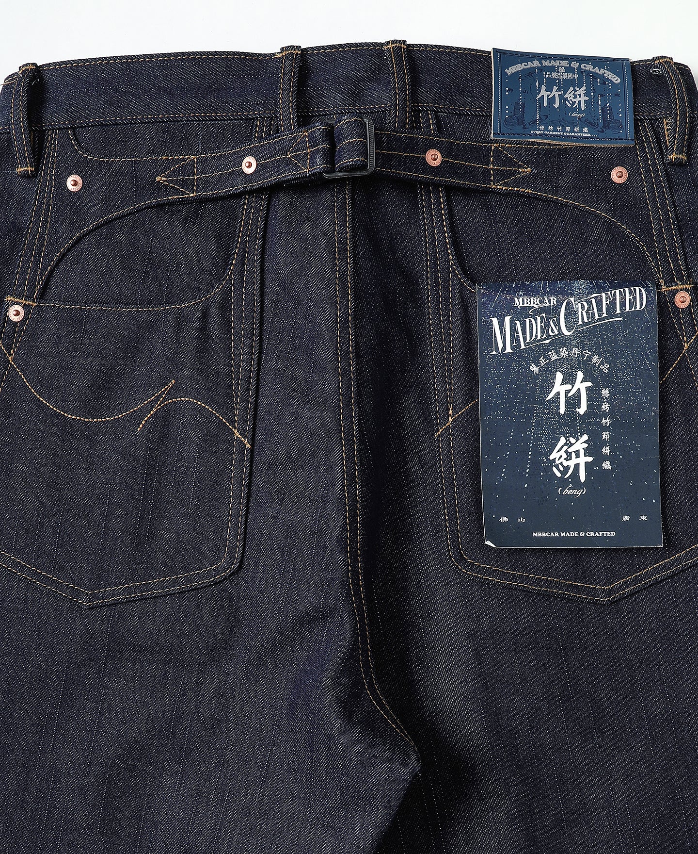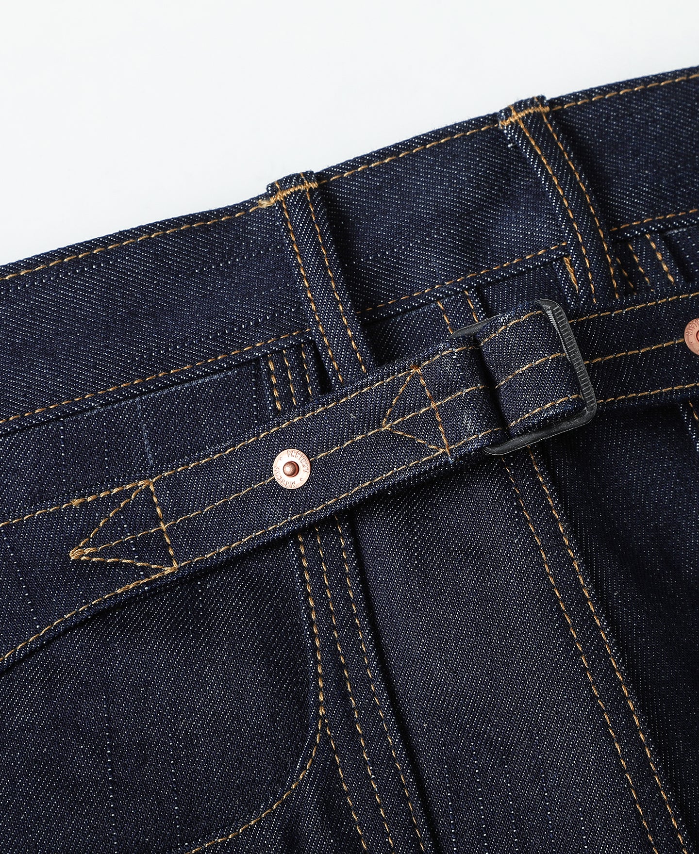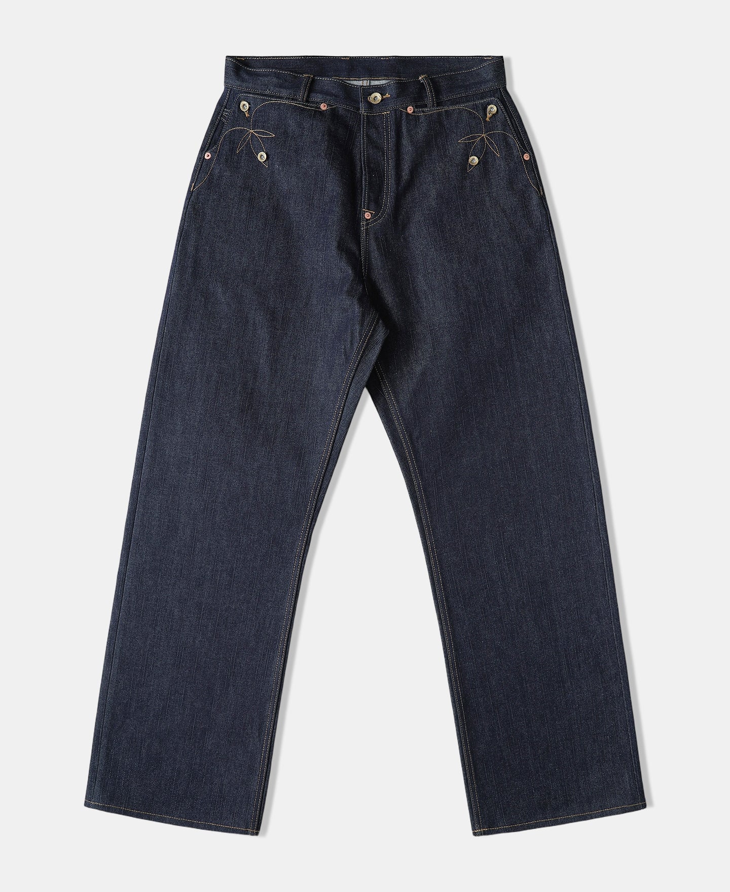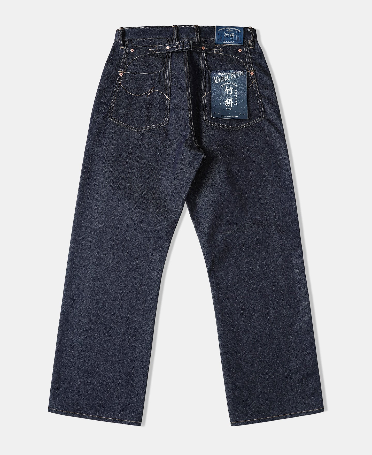 Designed with a high-rise, wide-leg silhouette inspired by early workwear, it features Mule Ear front pockets, a one-piece rear panel with an adjustable widened Paris buckle, and a curved watch pocket.