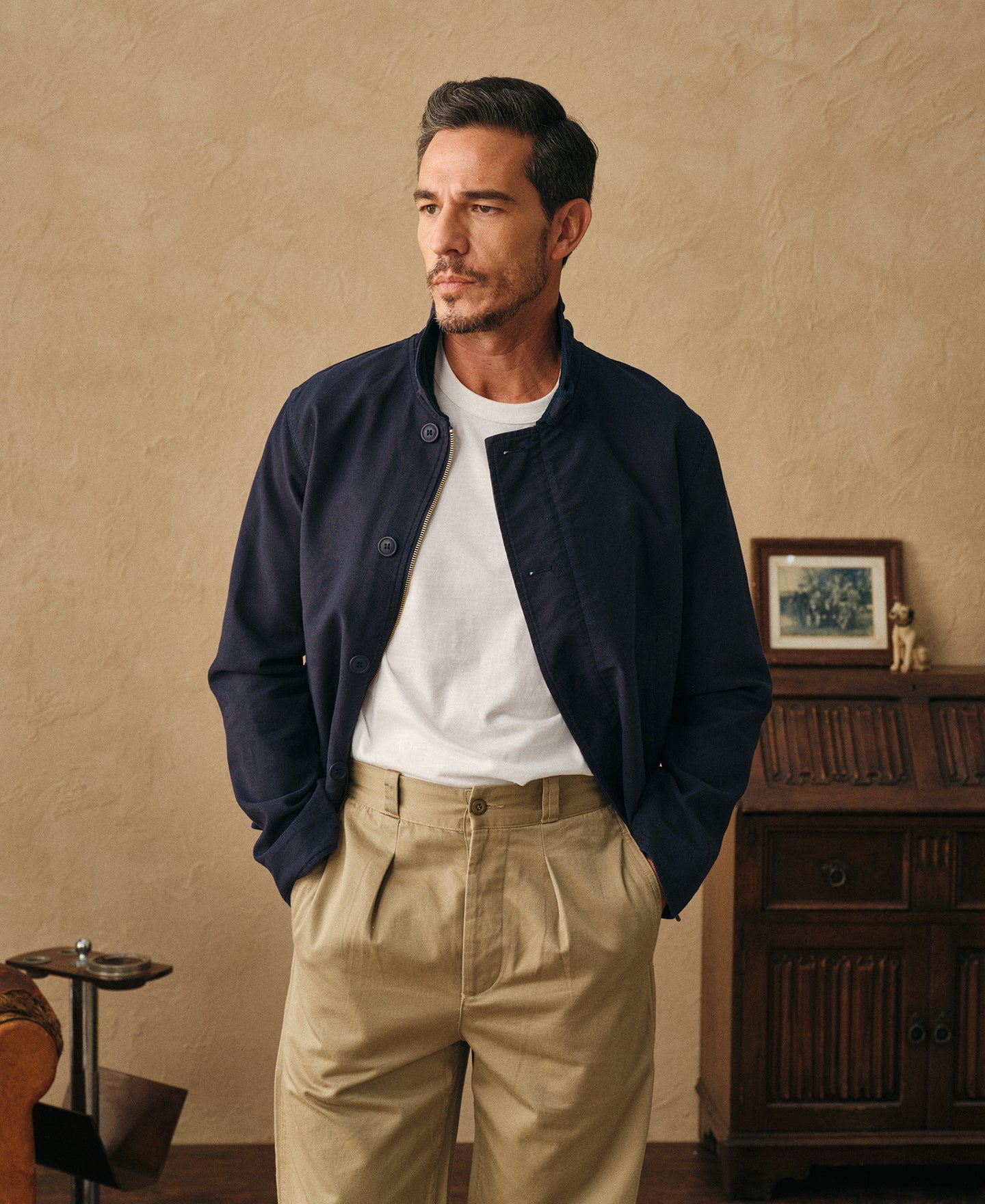 A modern unlined reproduction of the U.S. Navy's iconic N-1 deck jacket, originally introduced in 1943. Crafted from custom 10 oz 100% cotton jungle cloth, it offers durable structure without bulk while preserving the heritage silhouette.