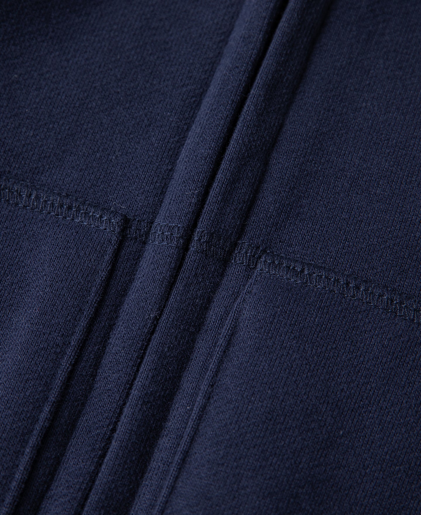 • This 500g heavyweight terry zip-up hoodie is built for durability and structure. The dense fabric feels substantial yet breathable with its loopback interior, avoiding the shedding common in fleece. The hood is reinforced with a double-layer build for shape and coverage. Exposed stitching throughout gives it a sturdy, utilitarian character, while the rib-trimmed pockets add both function and detail.