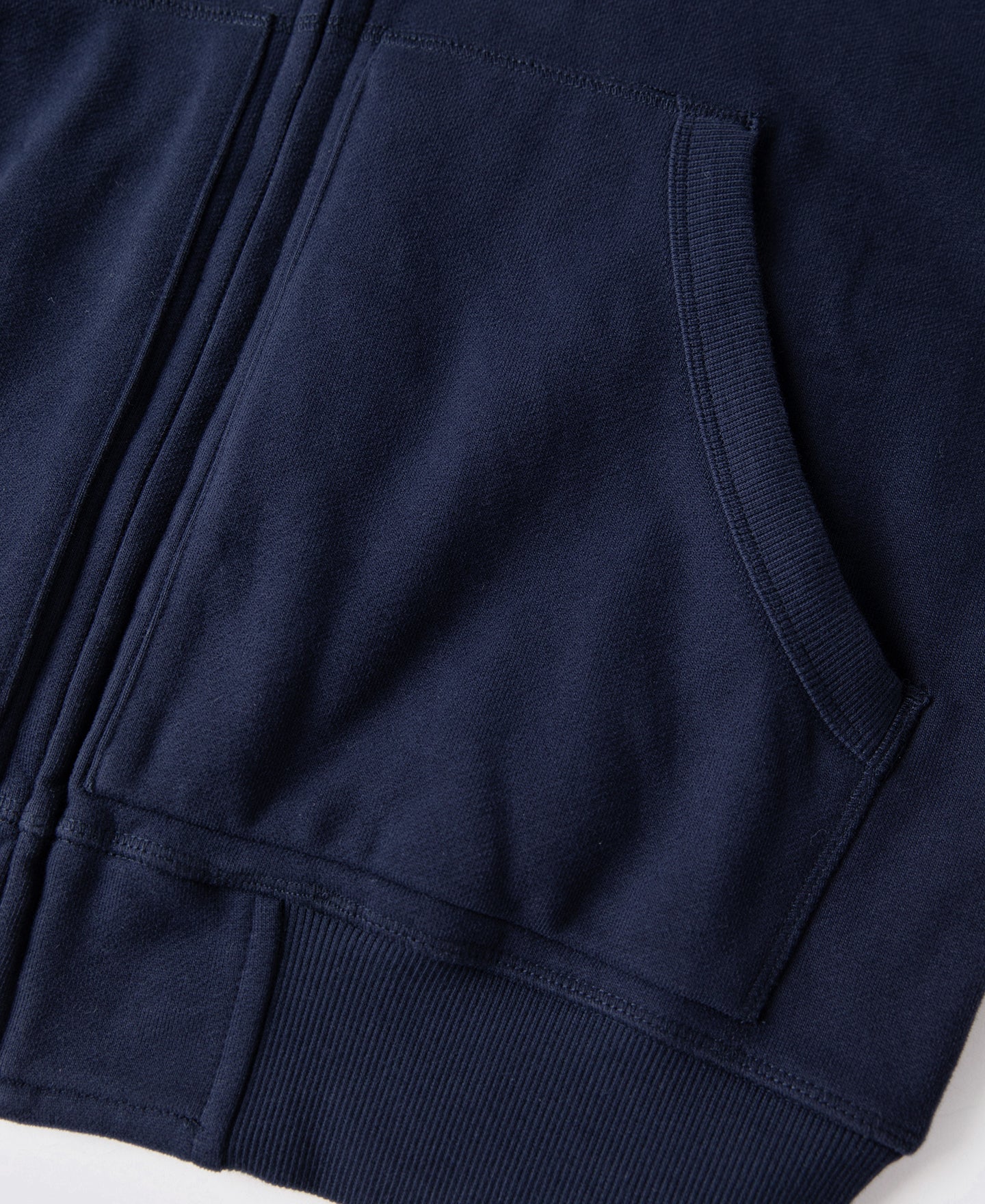 This 500g heavyweight terry zip-up hoodie is built for durability and structure. The dense fabric feels substantial yet breathable with its loopback interior, avoiding the shedding common in fleece. The hood is reinforced with a double-layer build for shape and coverage. Exposed stitching throughout gives it a sturdy, utilitarian character, while the rib-trimmed pockets add both function and detail.