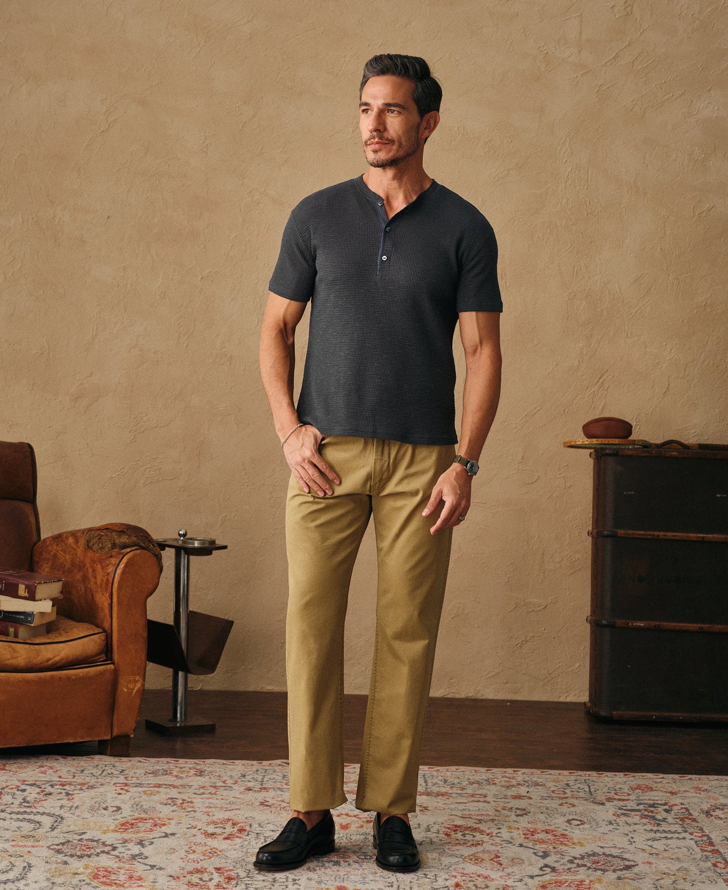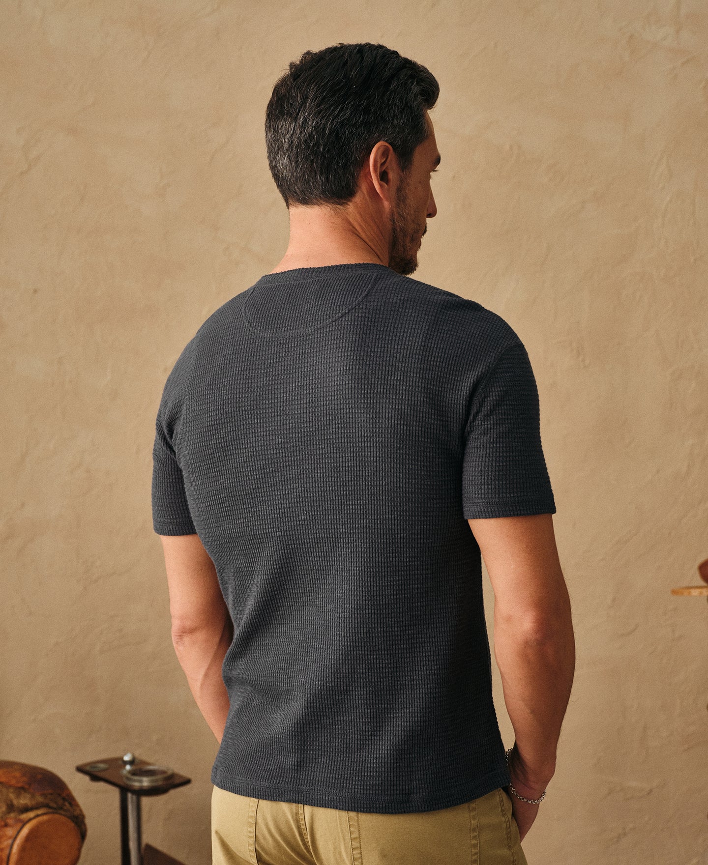 Crafted from a 220 GSM cotton waffle knit—also known as honeycomb for its textured grid pattern—this henley T-shirt combines softness with natural stretch. The raised weave allows for enhanced breathability and comfort, while durable triple-needle stitching ensures a clean, long-lasting finish.