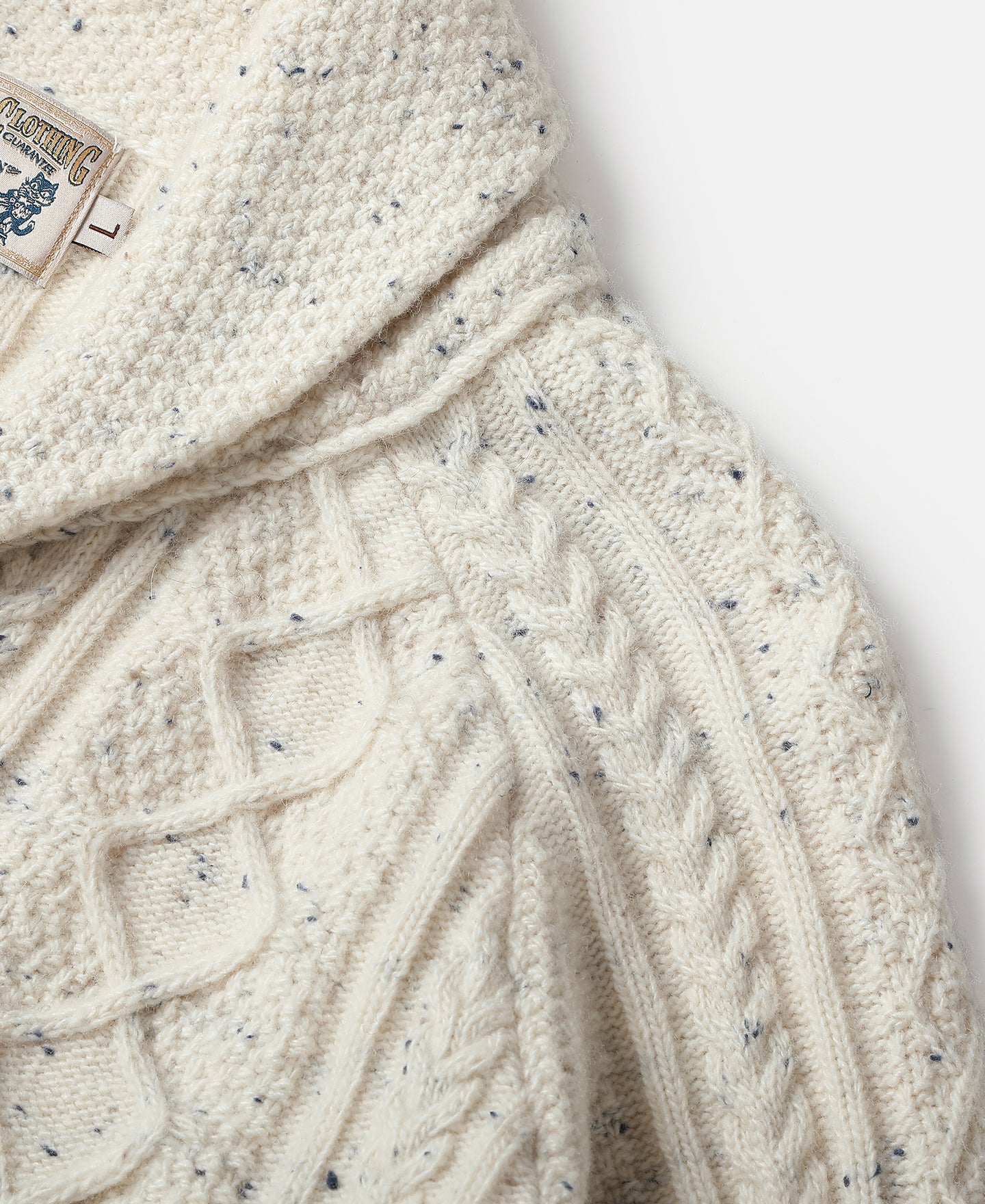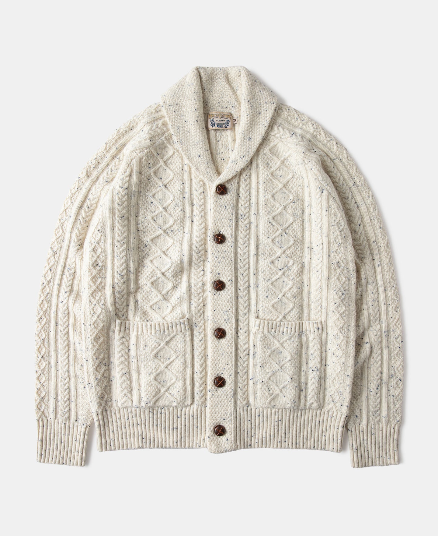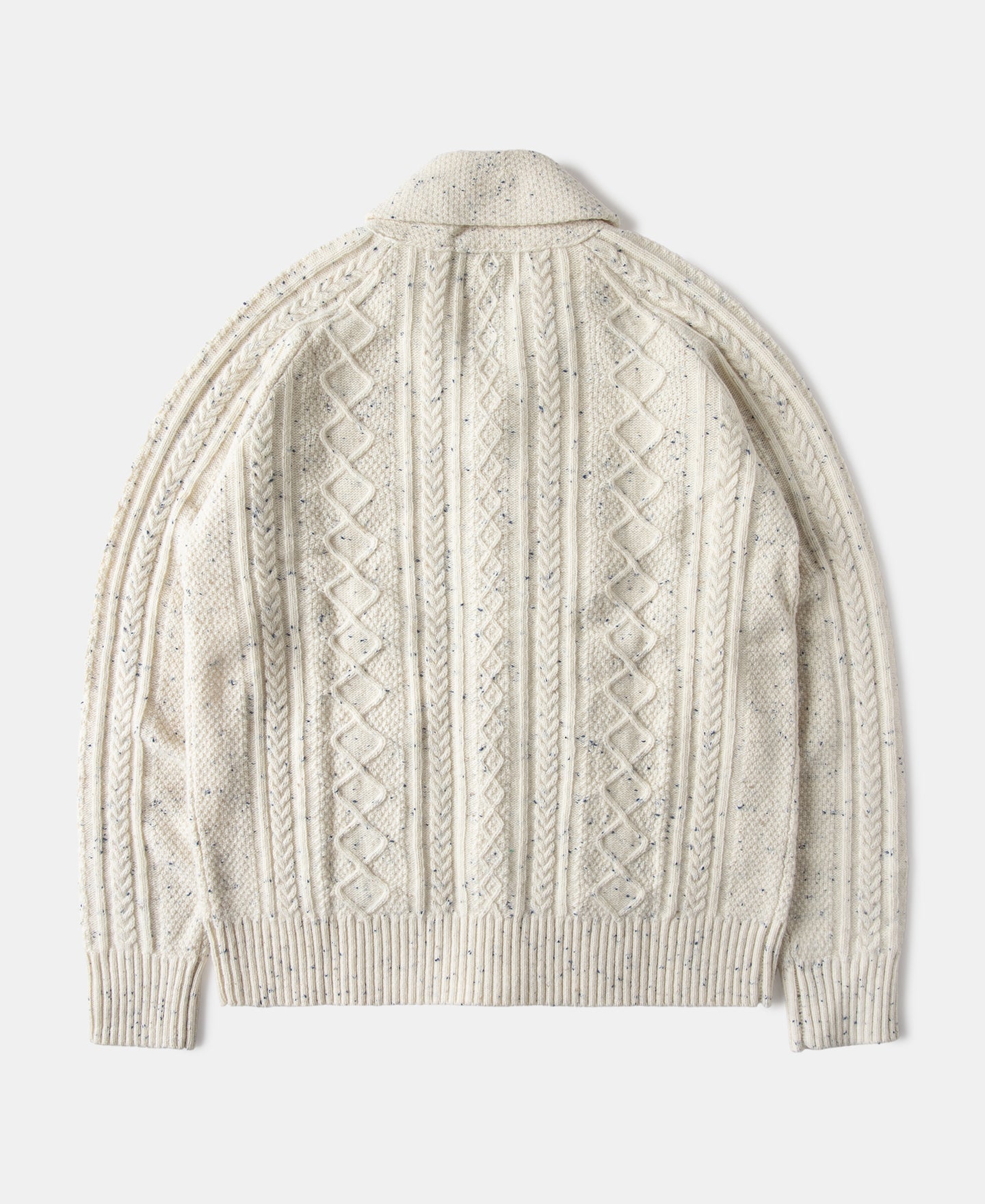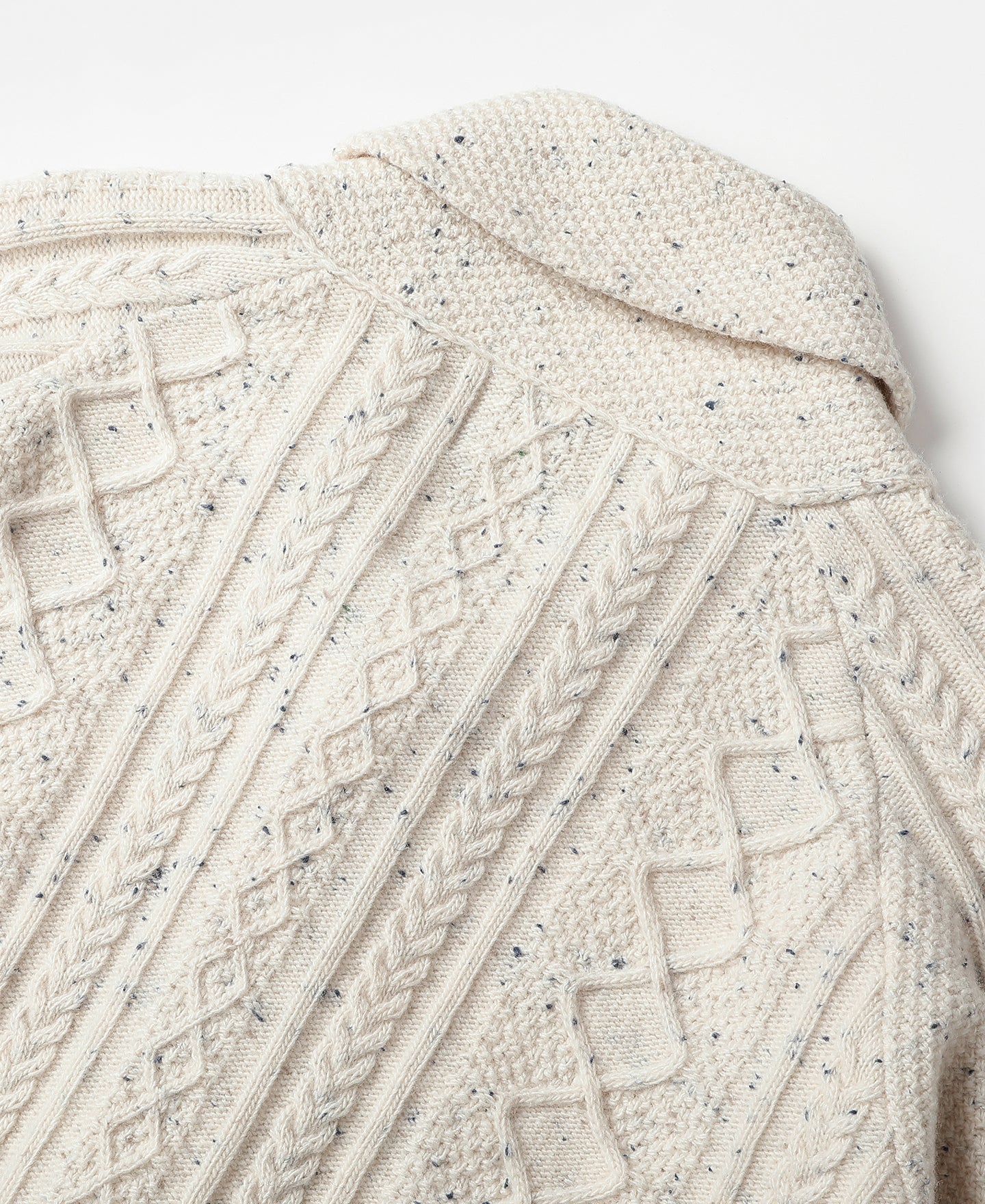 A refined take on rugged knitwear. Crafted from custom 7-gauge yarn spun with a balanced blend of 50% wool and 50% nylon, this cardigan features a subtle nep texture in blue tones. The classic shawl collar silhouette is elevated with a combination of diamond cable and rope twist patterns for timeless appeal. Its slightly relaxed fit is easy to layer, with a length that’s neither too short nor overly long — just right for versatile styling.