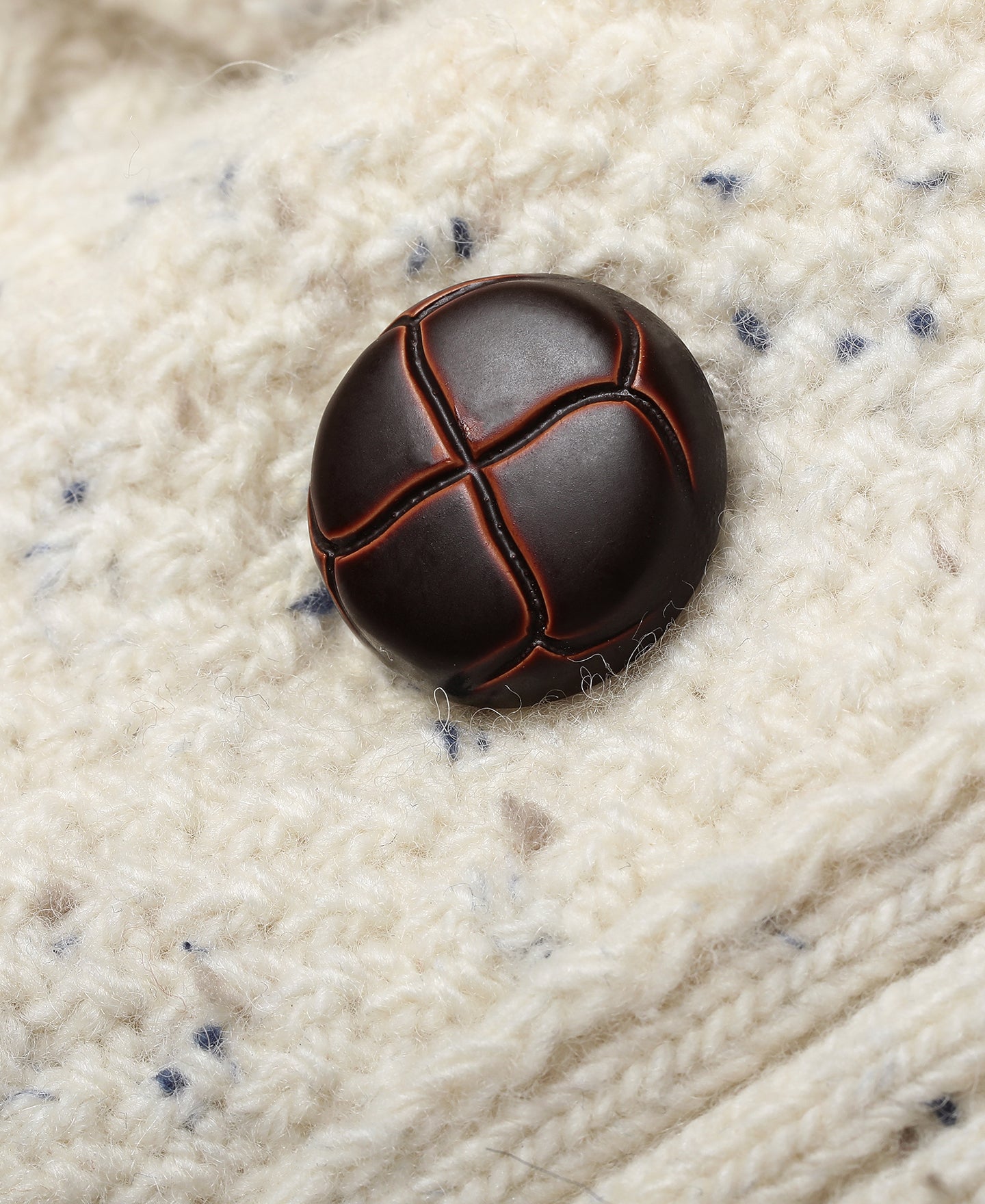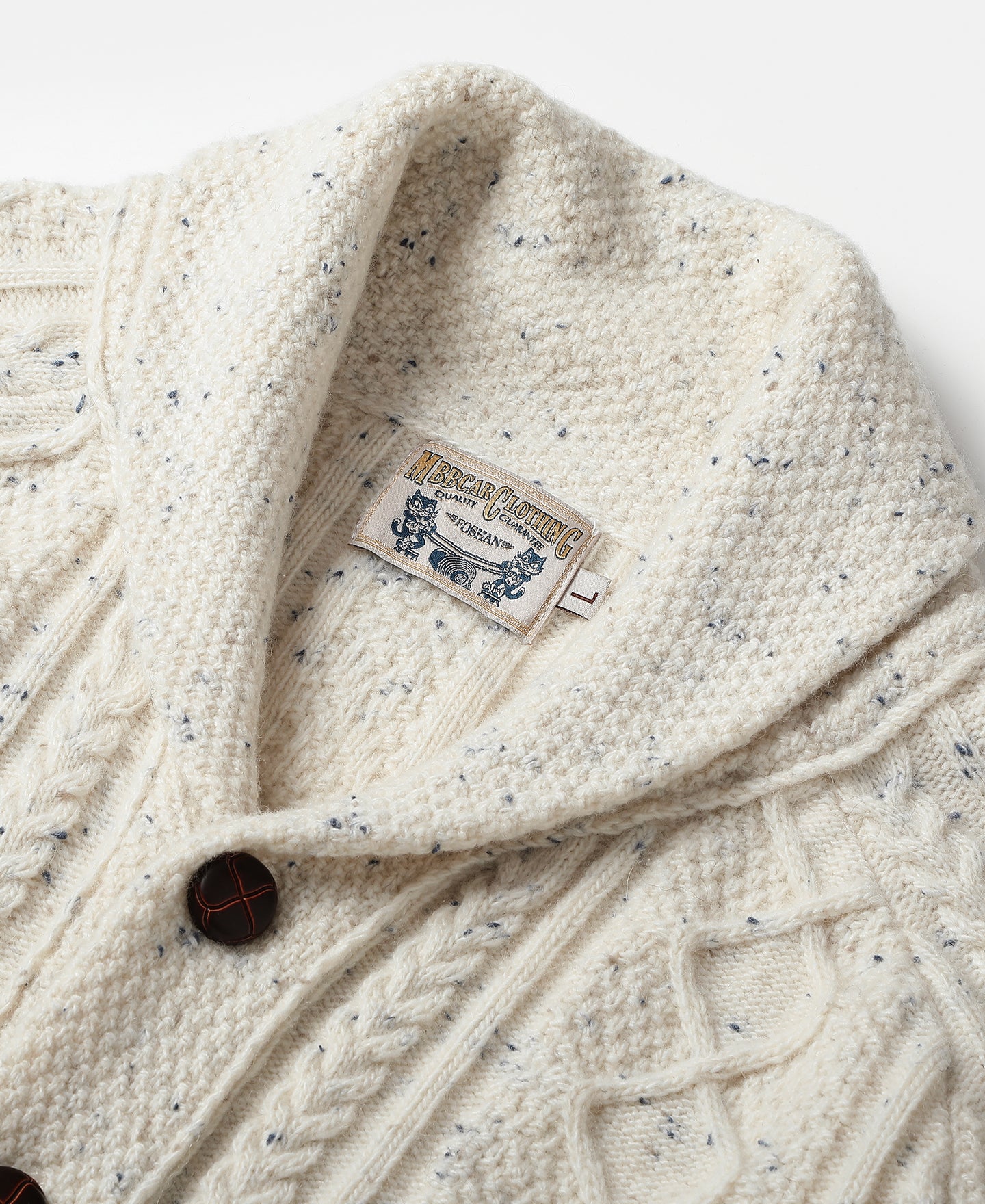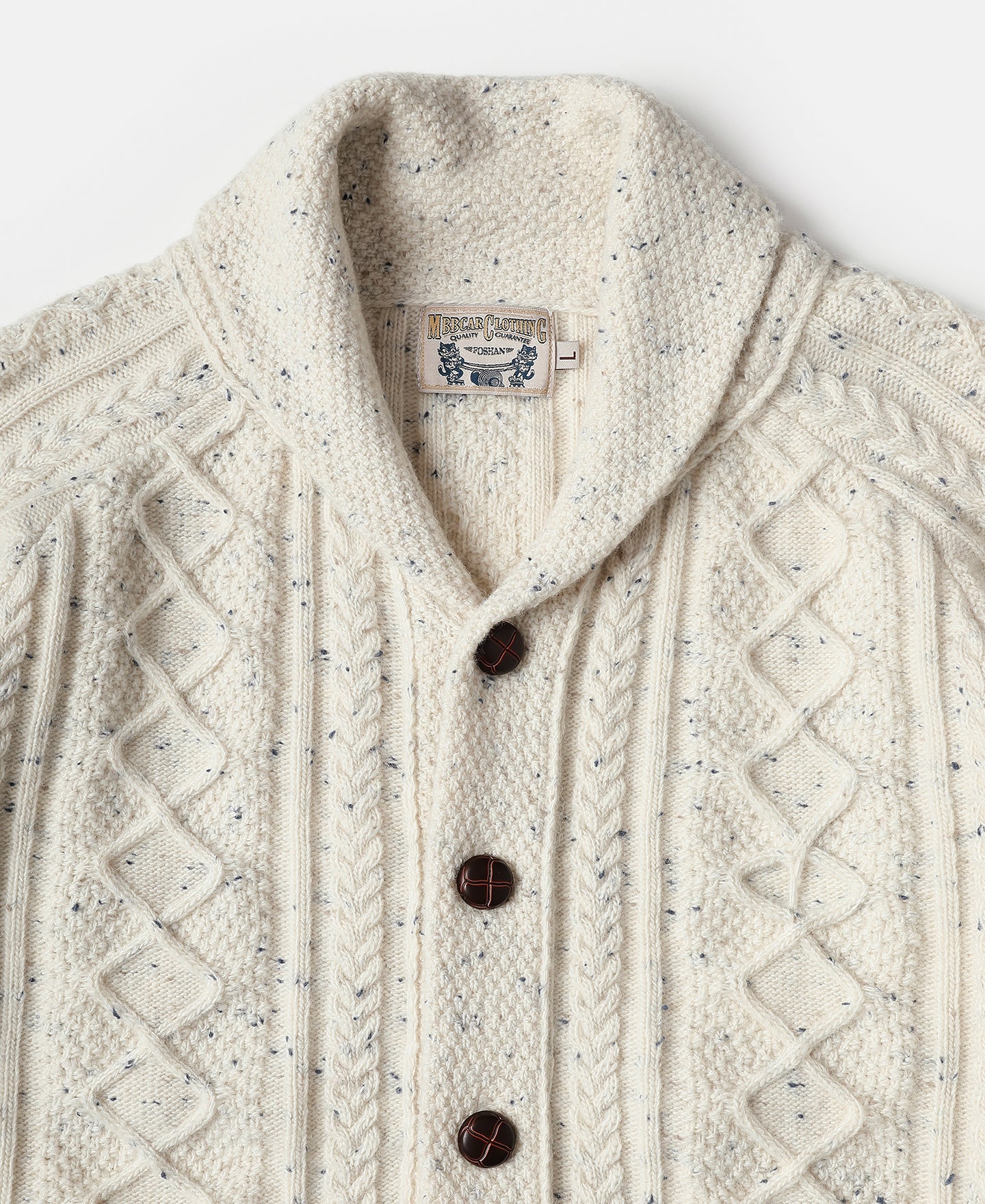A refined take on rugged knitwear. Crafted from custom 7-gauge yarn spun with a balanced blend of 50% wool and 50% nylon, this cardigan features a subtle nep texture in blue tones. The classic shawl collar silhouette is elevated with a combination of diamond cable and rope twist patterns for timeless appeal. Its slightly relaxed fit is easy to layer, with a length that’s neither too short nor overly long — just right for versatile styling.
