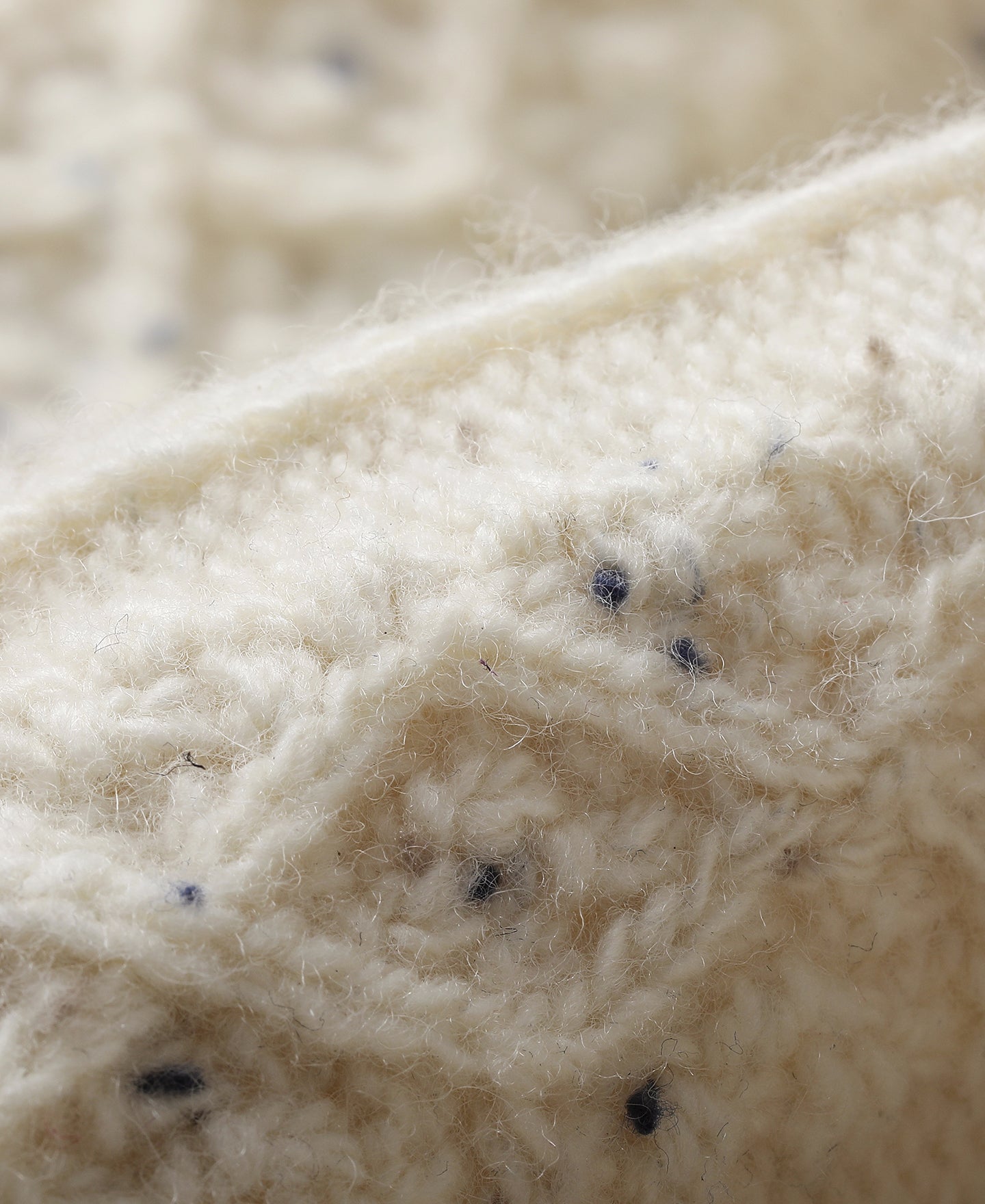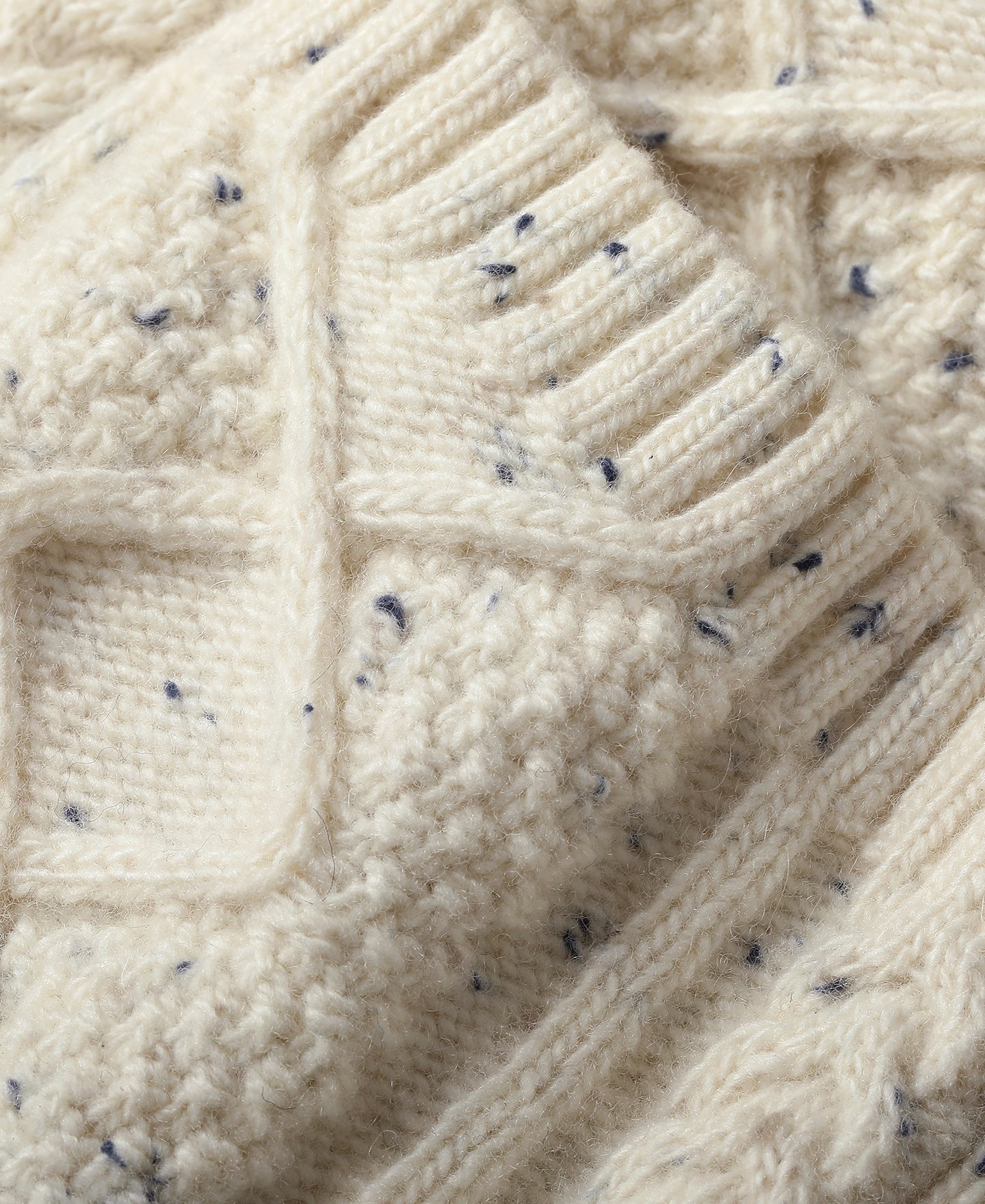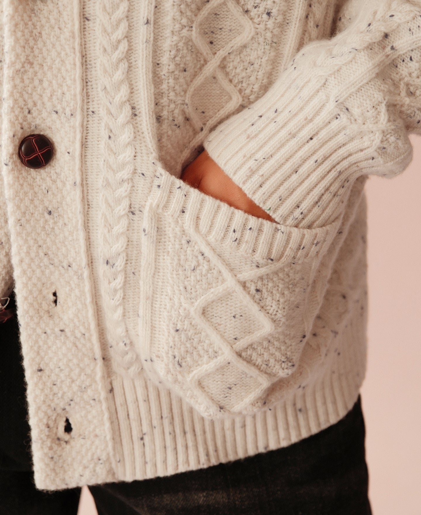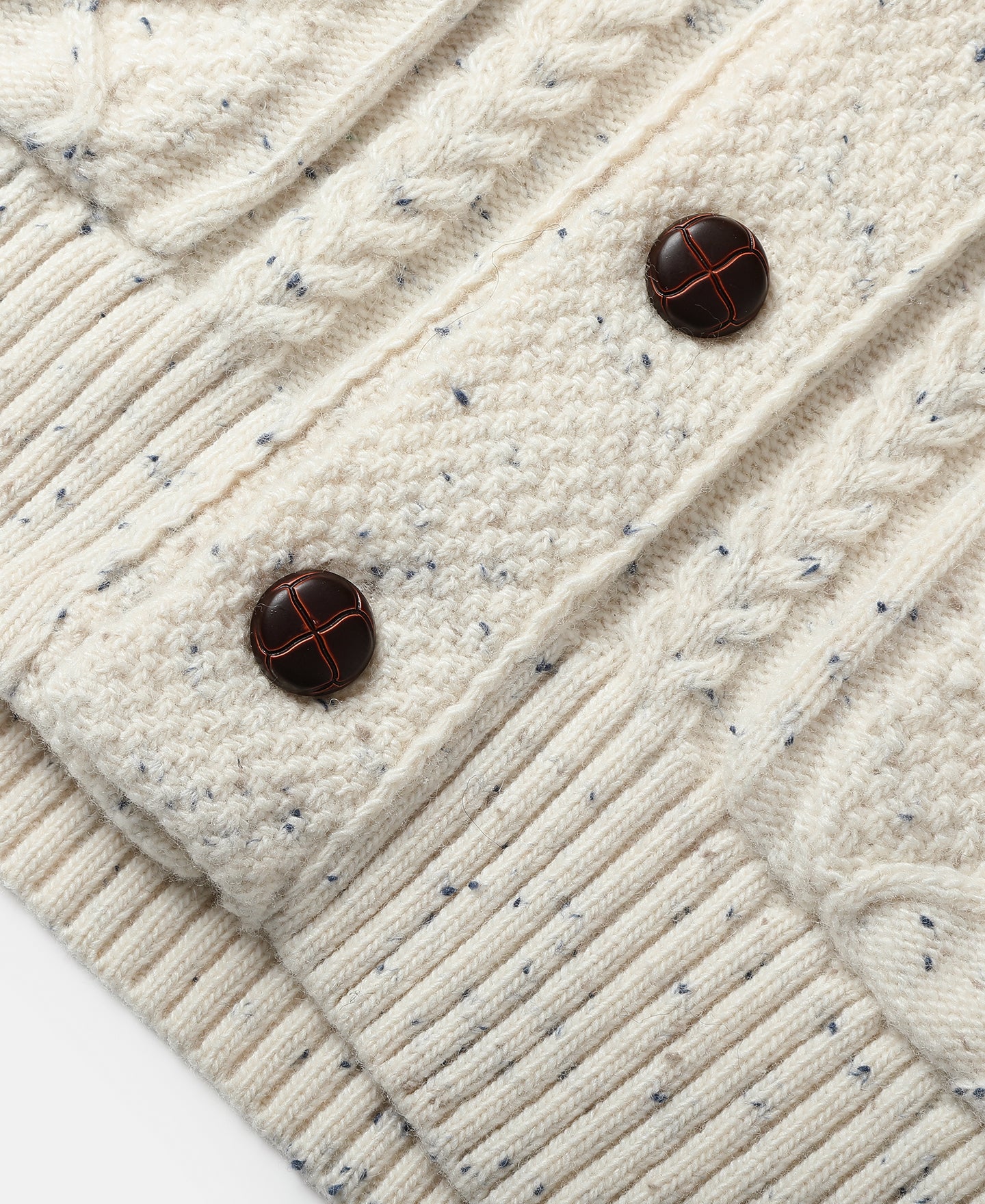 A refined take on rugged knitwear. Crafted from custom 7-gauge yarn spun with a balanced blend of 50% wool and 50% nylon, this cardigan features a subtle nep texture in blue tones. The classic shawl collar silhouette is elevated with a combination of diamond cable and rope twist patterns for timeless appeal. Its slightly relaxed fit is easy to layer, with a length that’s neither too short nor overly long — just right for versatile styling.