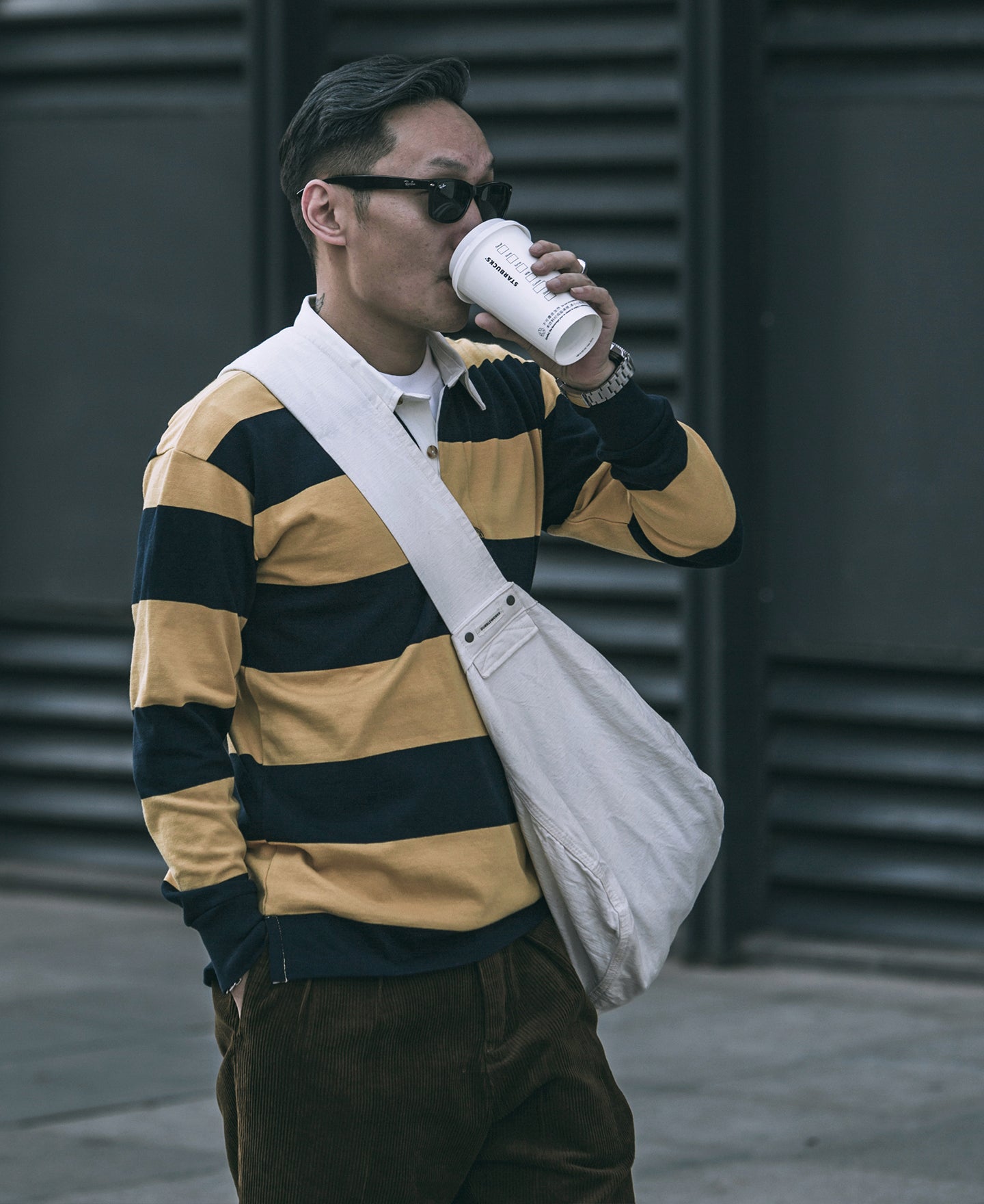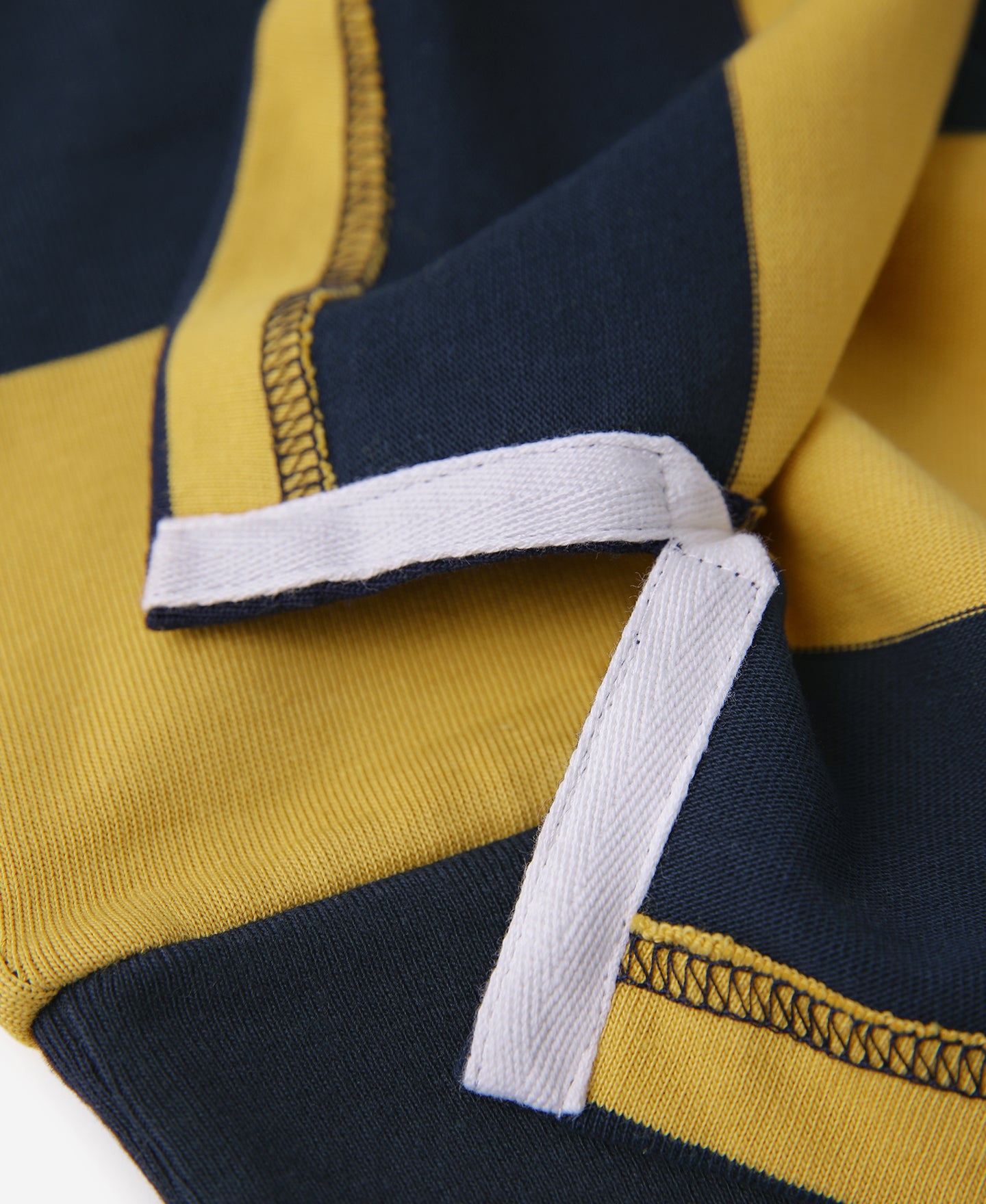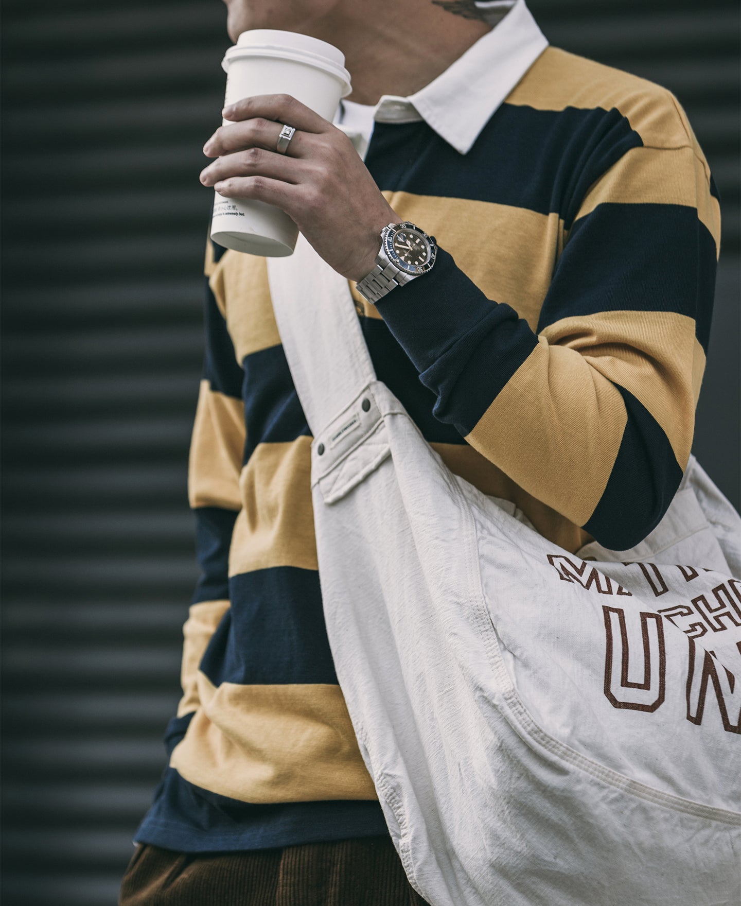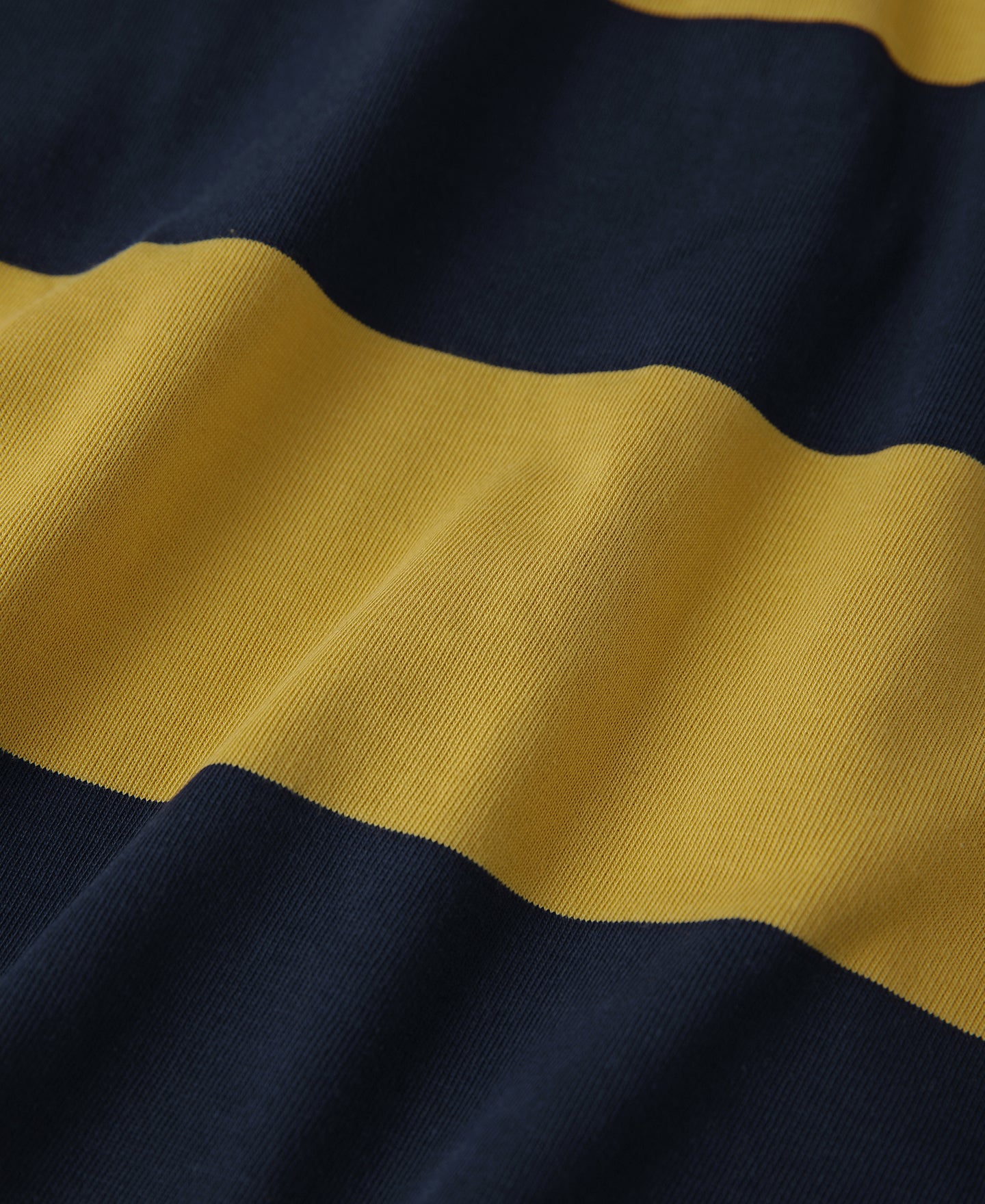 Dieses Rugby-Shirt besteht aus 10 oz. Der garngefärbte Baumwollstoff fängt mit sportlichen Details und klassischem Design den adretten und dennoch sportlichen Sinn ein.