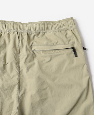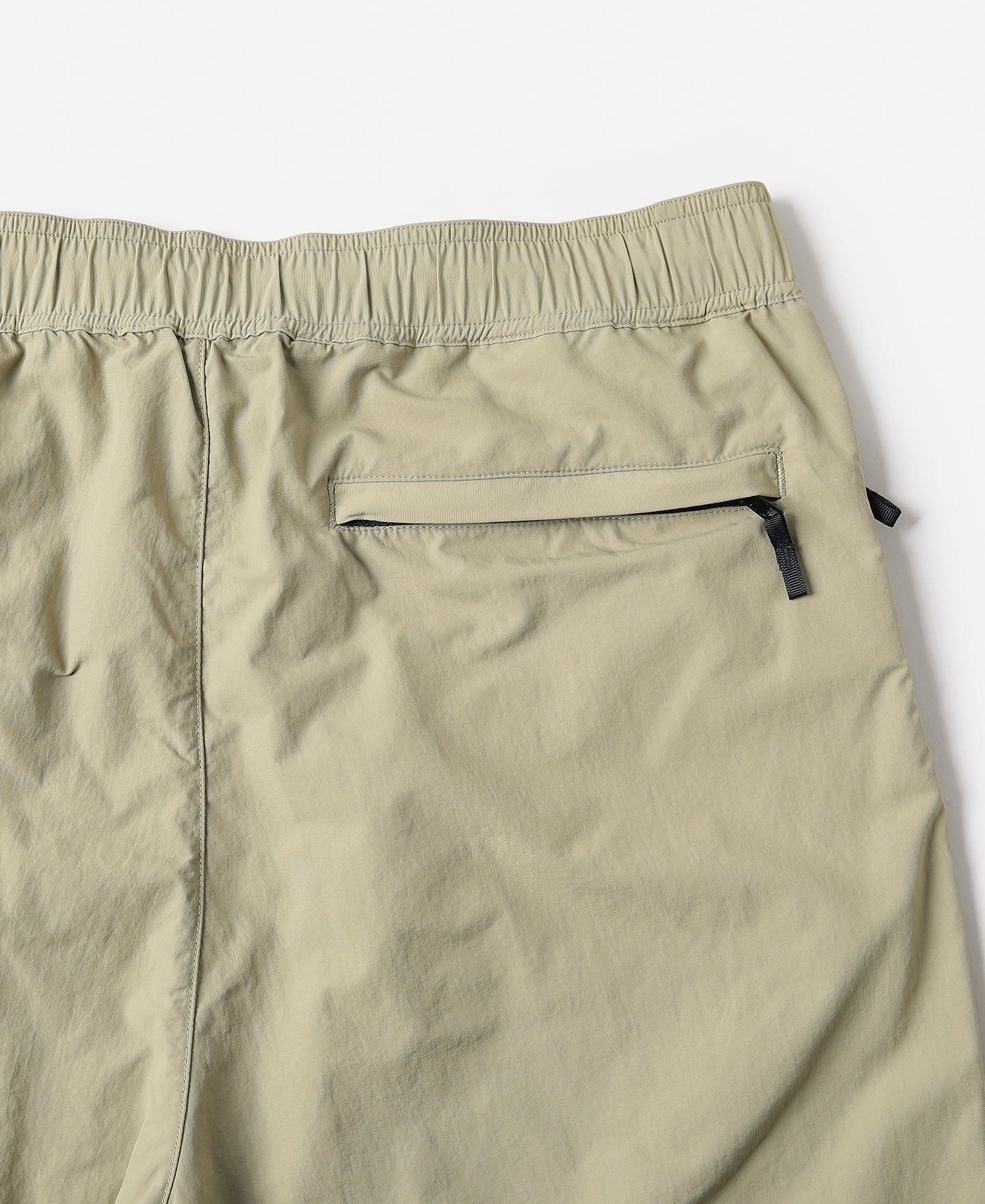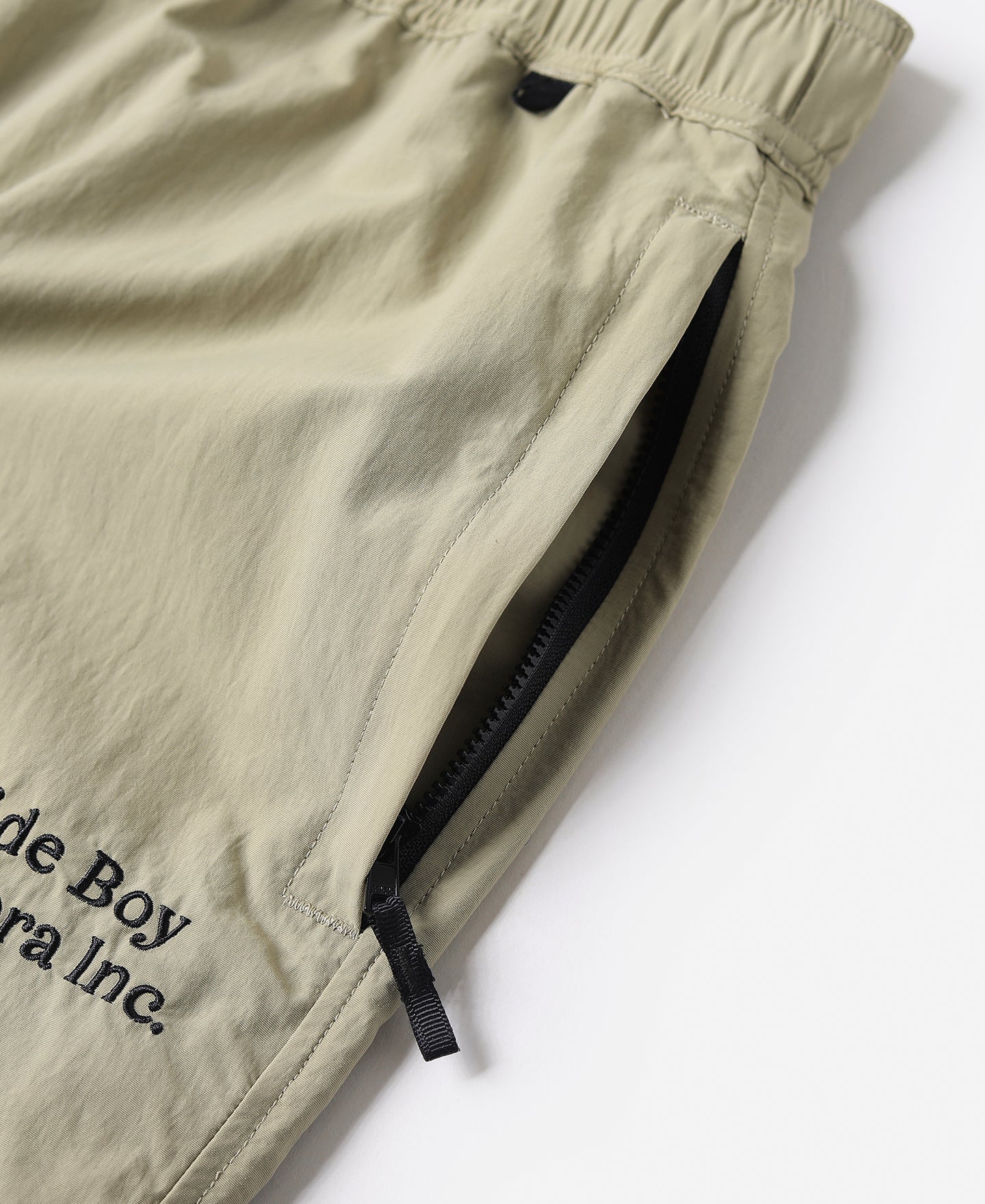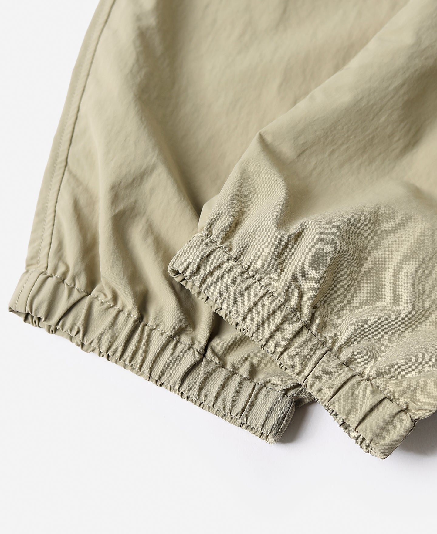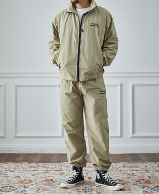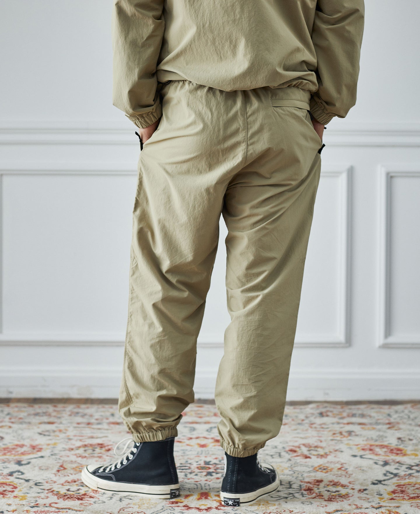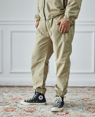 Die Hose setzt die schlichte Eleganz des Oberteils fort und verfügt nur über zwei Seitentaschen mit Reißverschluss und eine Gesäßtasche. Der Bund ist sowohl mit Gummi als auch mit Kordelzug verstellbar, um eine individuelle Passform zu gewährleisten, während die Knöchelbündchen mit elastischen Bändern ausgestattet sind.