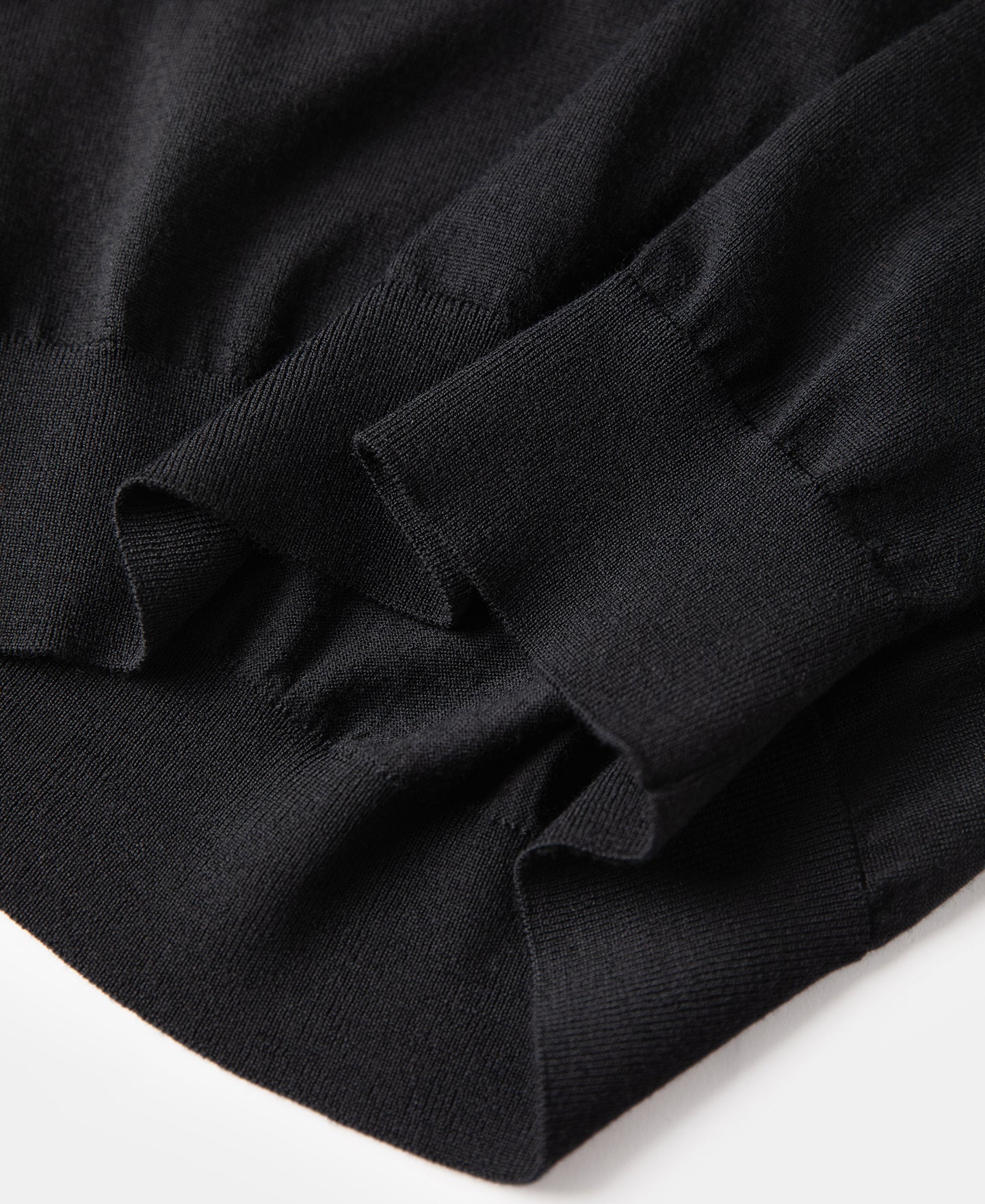 The fibers are processed to smooth the natural scales, so the touch is genuinely non-itch — even at the neck where most wool fails.