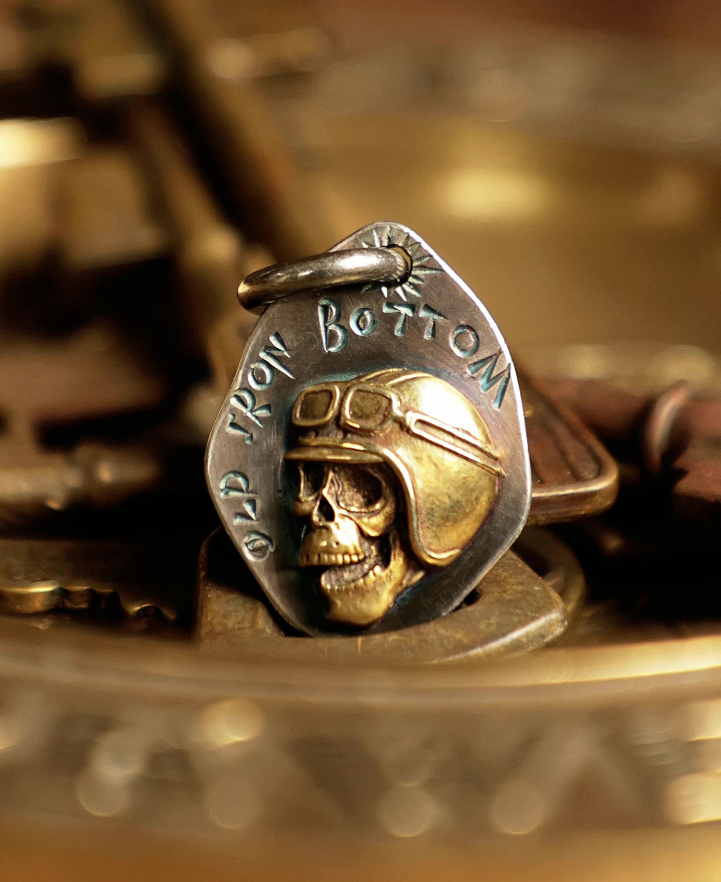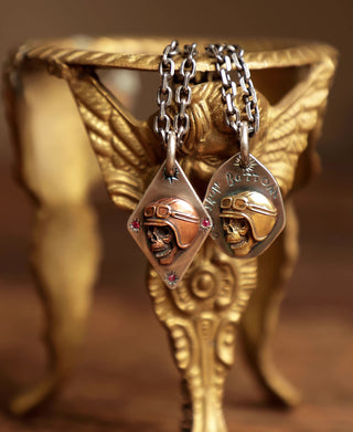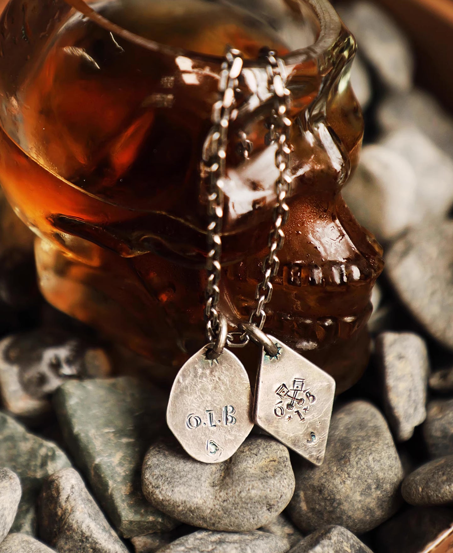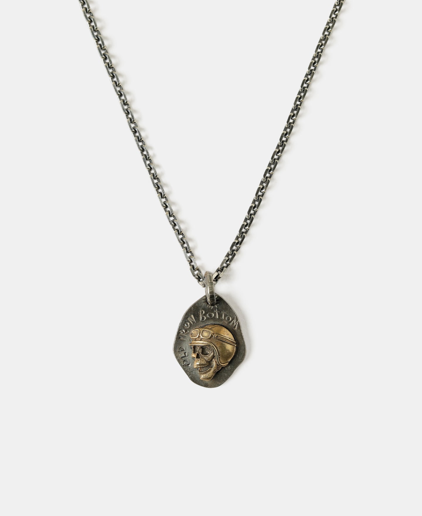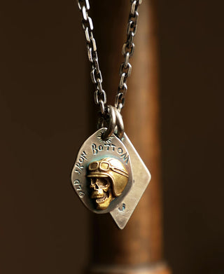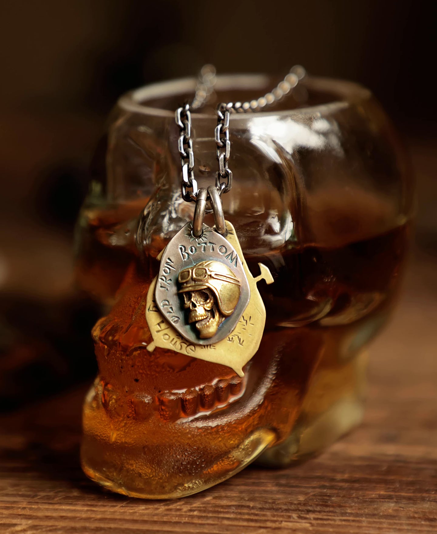 Entdecken Sie diese Totenkopf-Halskette im Biker-Stil, die die Handwerkskunst aus 925er Silber nahtlos mit einem markanten Totenkopf aus Messing verbindet. Jedes Stück wird während des Herstellungsprozesses individuell markiert, um eine authentische Note zu gewährleisten. Die Halskette strahlt mit ihrem oxidierten Finish einen rebellischen Charme aus.