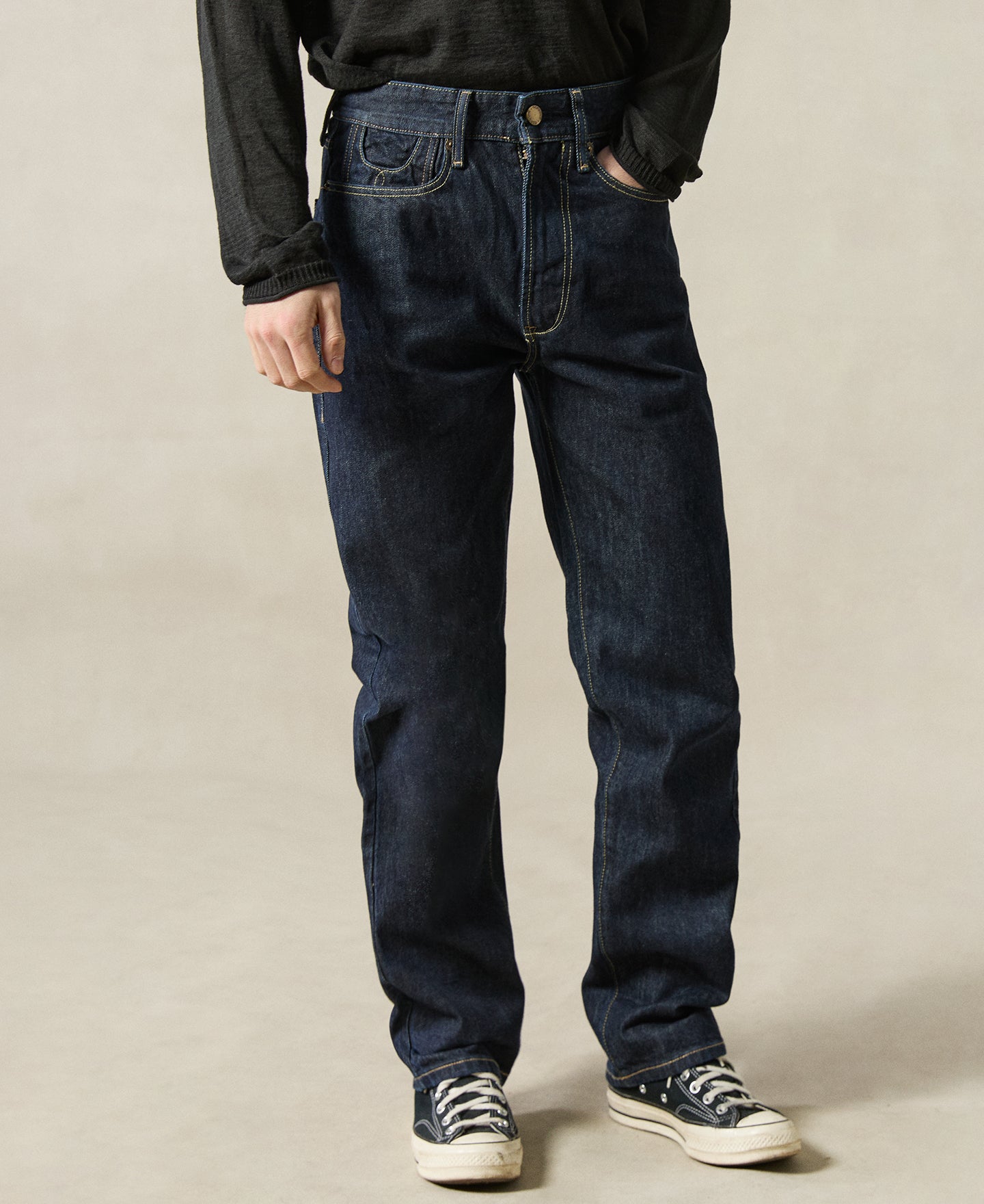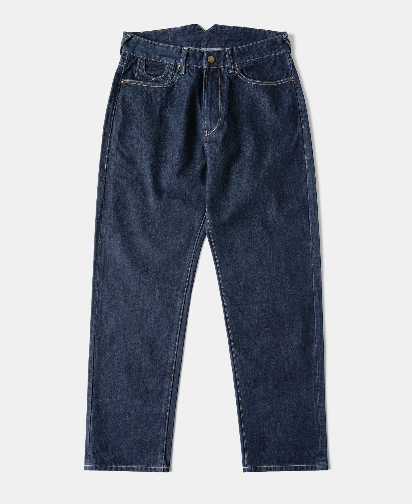 Crafted from raw 14.75oz selvedge denim that desizes to 15–15.5oz, these jeans are built for daily wear with clean lines and a relaxed silhouette. Simplified detailing keeps the look understated while preserving classic workwear durability.