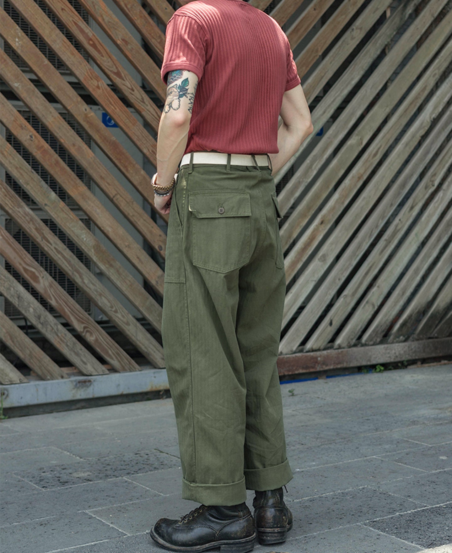 The 838A Fatigue Utility Pants were issued in 1947, featuring the OD7 color and made from Herringbone Twill (HBT) fabric, which was widely used during World War II. They came with either brown urea buttons or 13-star buttons. The 838A Fatigue Utility Pants are prototypes of the OG107 Fatigue Utility Pants, with the only differences being in fabric and color. Additionally, there is an HBT jacket (shirt) and 838 pants to match, serving as the prototype for the OG107 long-sleeved jacket.