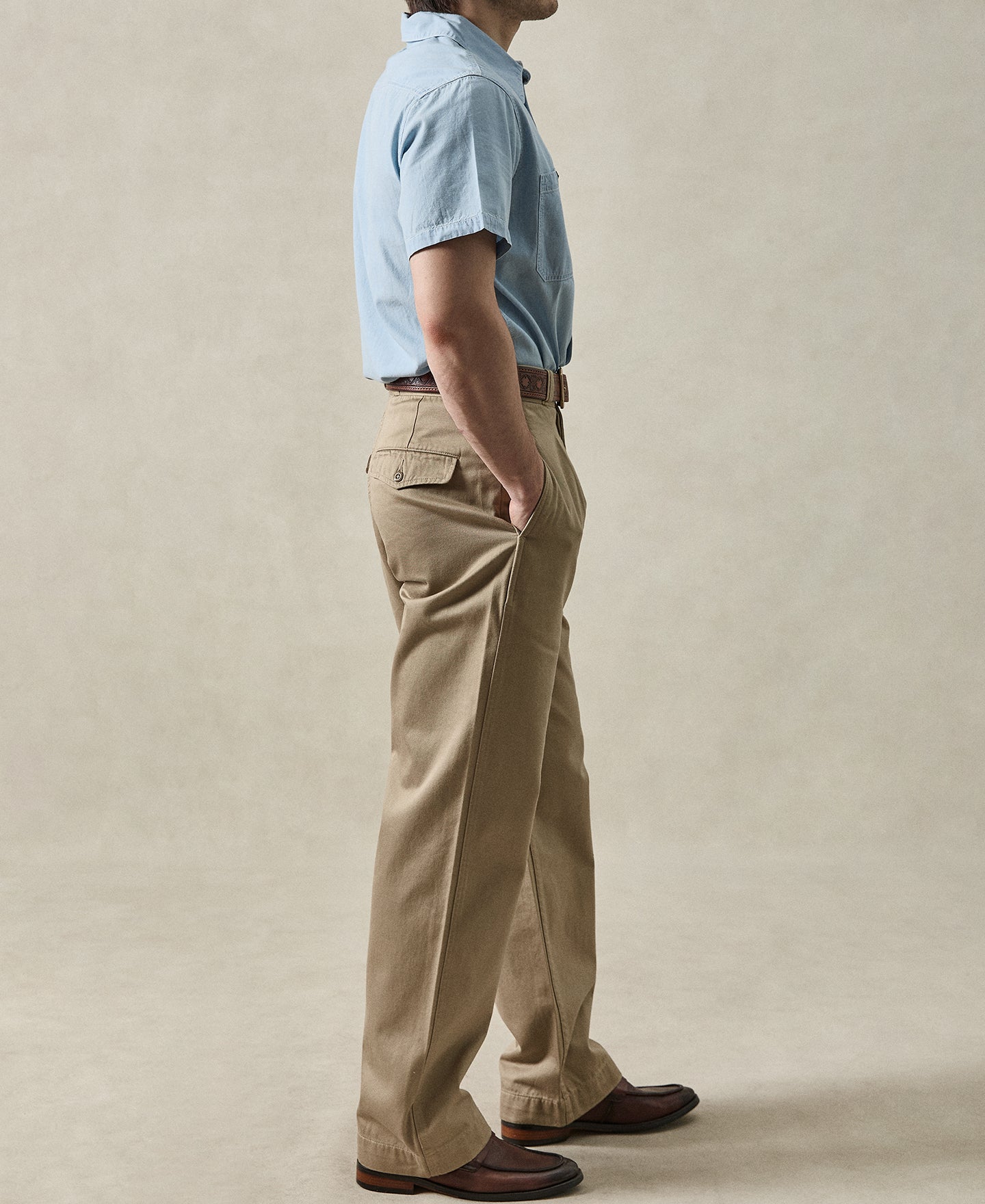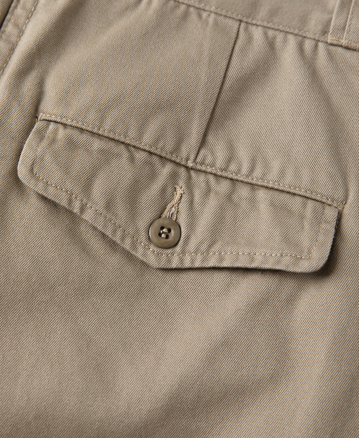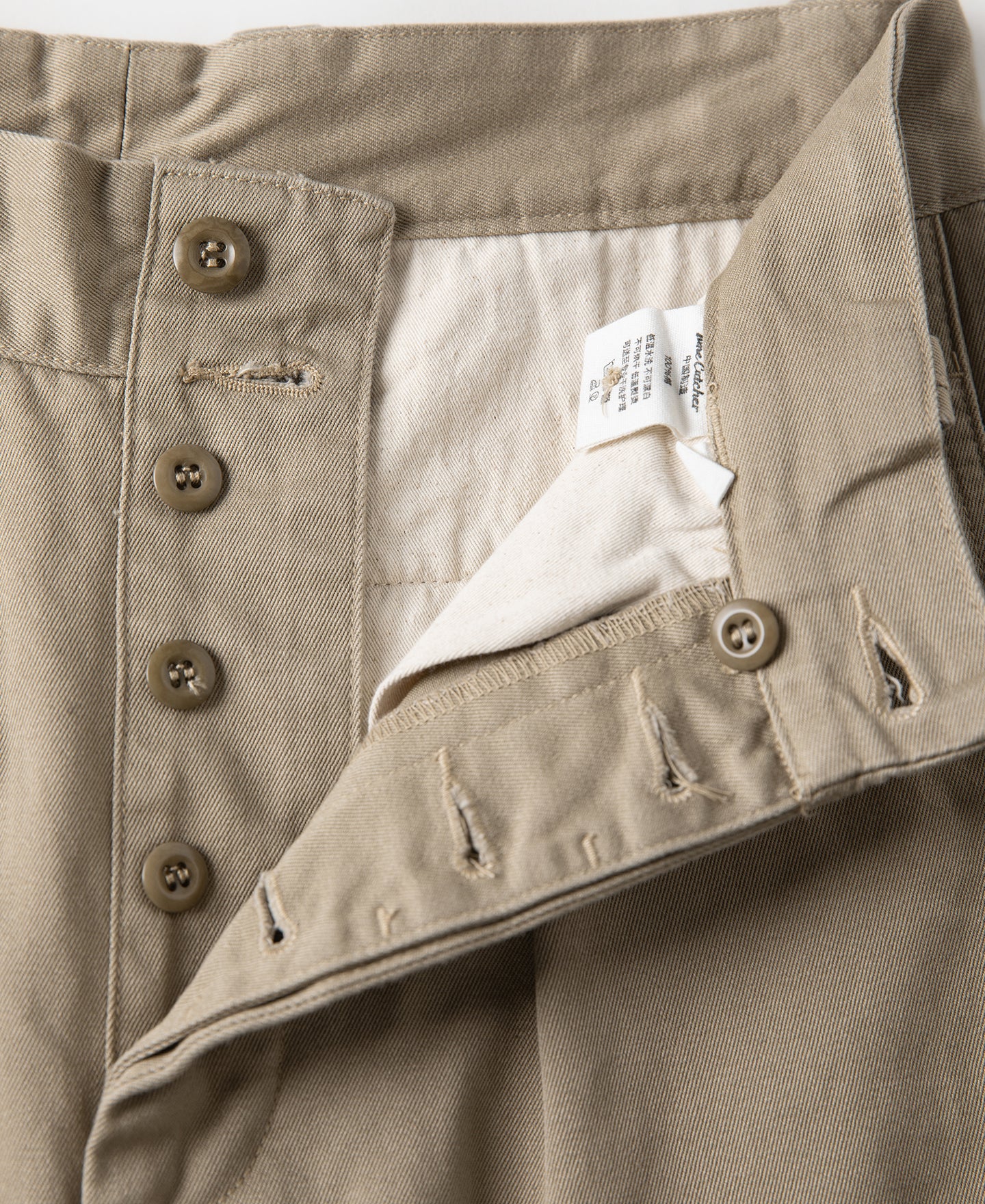 This pair is a reproduction of the rare single-pleated version of the French Army M-1952 Chino Trousers. Crafted from 10.5 oz high-density cotton twill fabric, it features a button fly, two side on-seam pockets, and two buttoned pockets at the back. The overall structure presents a high waist and straight leg shape. The design and details of this pair precisely replicate the original version. It has undergone a garment wash to give it a lived-in feel. Time Catcher stands behind the quality and authenticity of this product. -