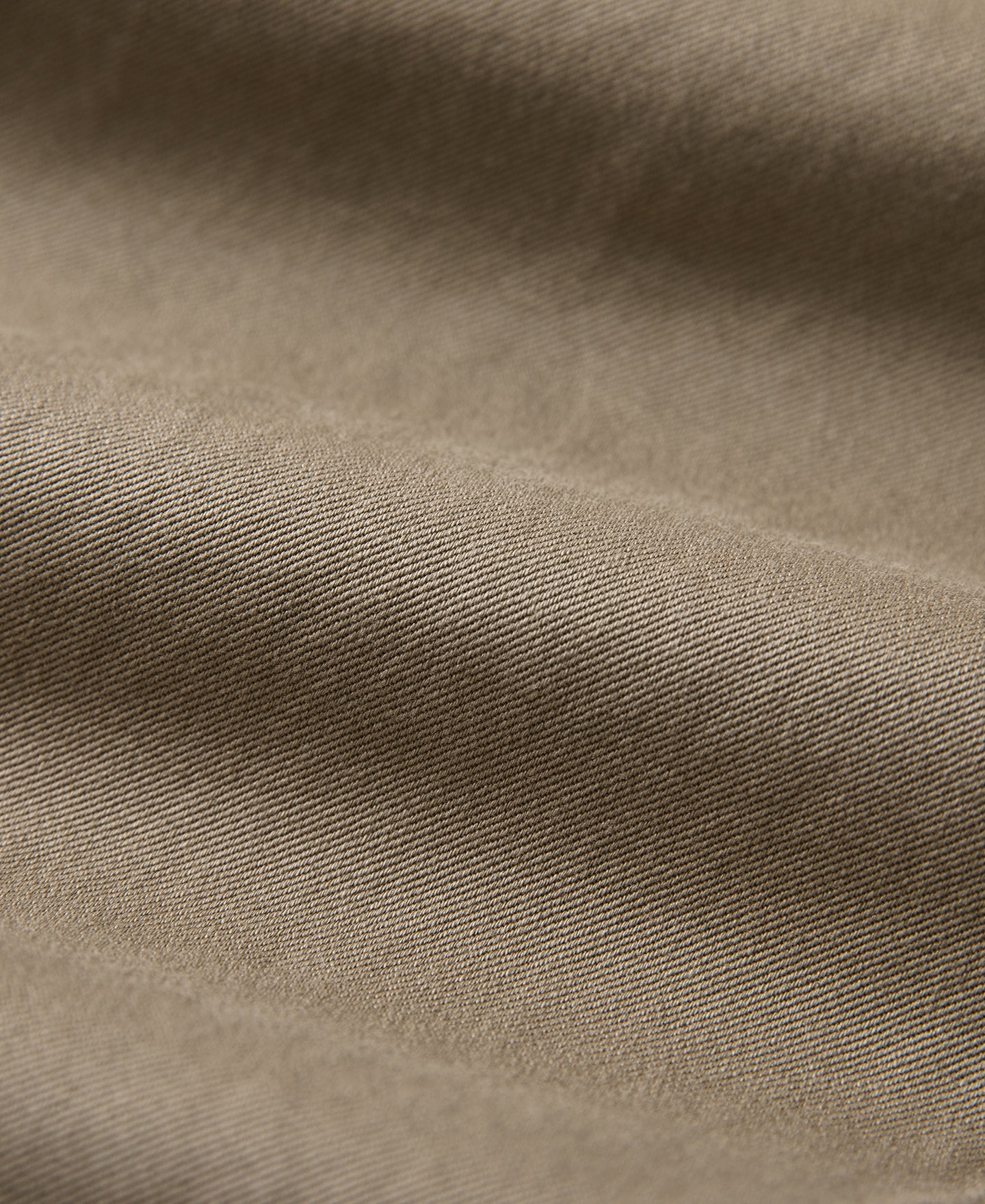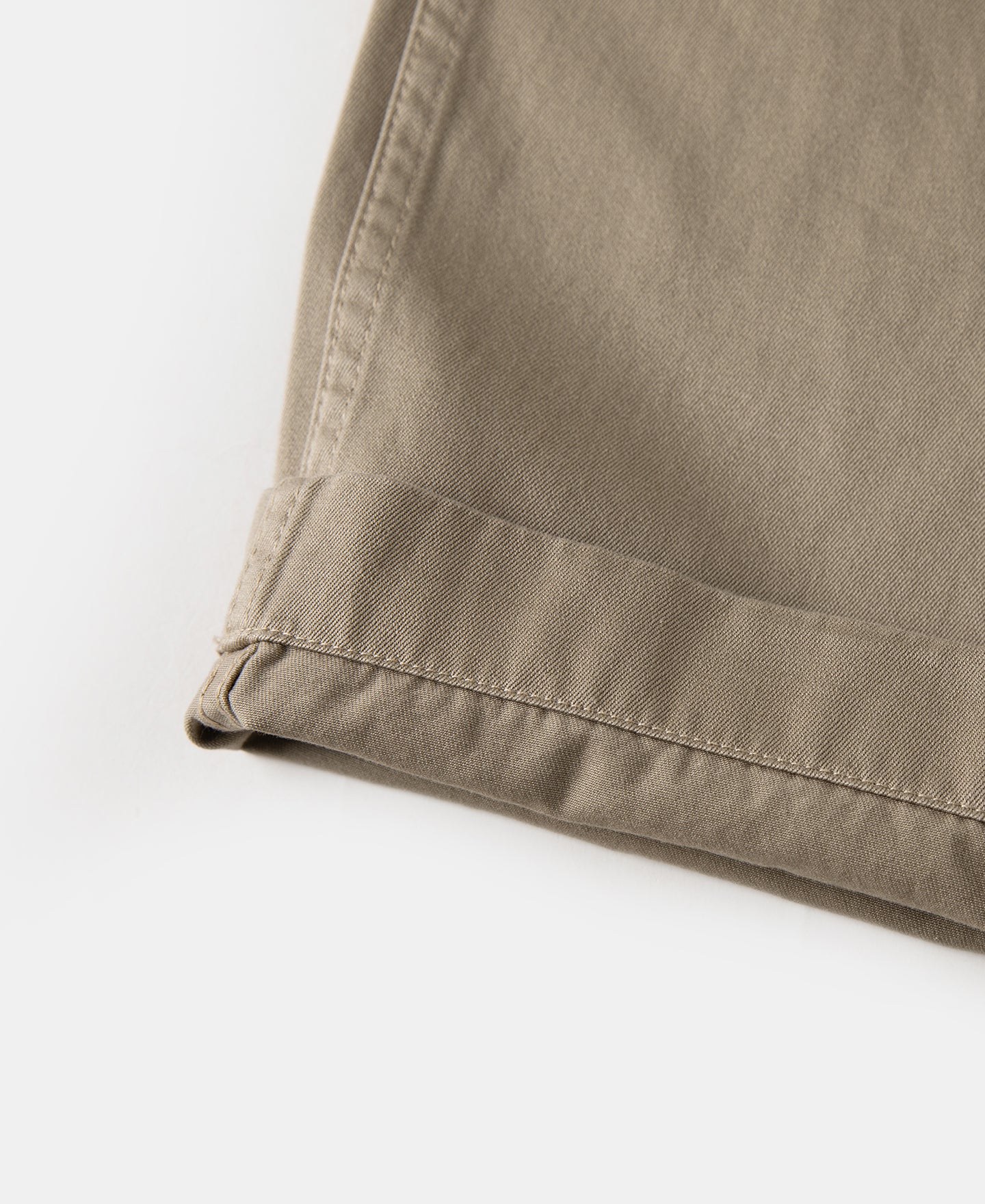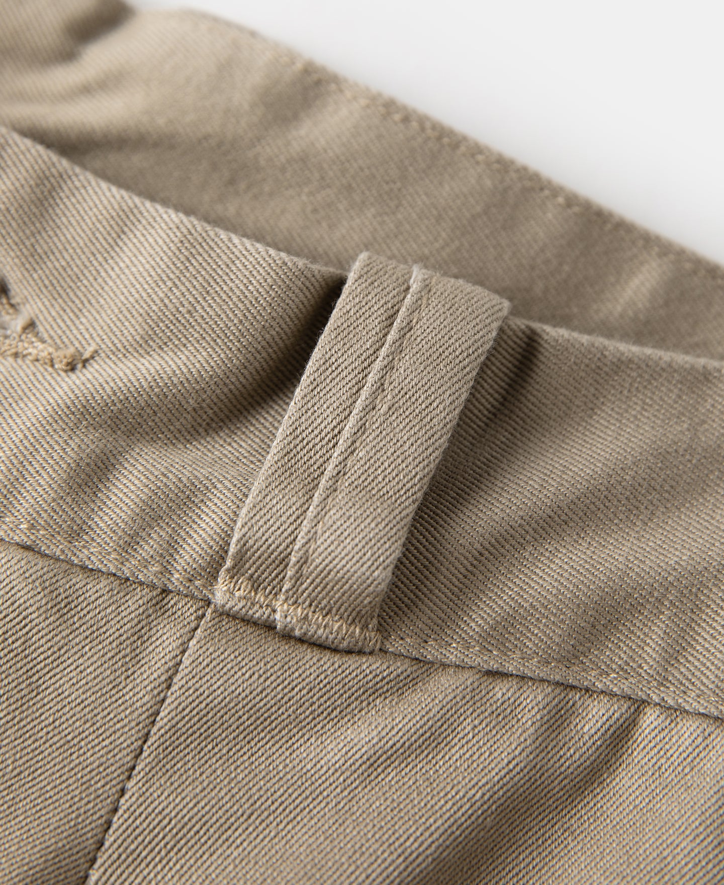This pair is a reproduction of the rare single-pleated version of the French Army M-1952 Chino Trousers. Crafted from 10.5 oz high-density cotton twill fabric, it features a button fly, two side on-seam pockets, and two buttoned pockets at the back. The overall structure presents a high waist and straight leg shape. The design and details of this pair precisely replicate the original version. It has undergone a garment wash to give it a lived-in feel. Time Catcher stands behind the quality and authenticity of this product. -