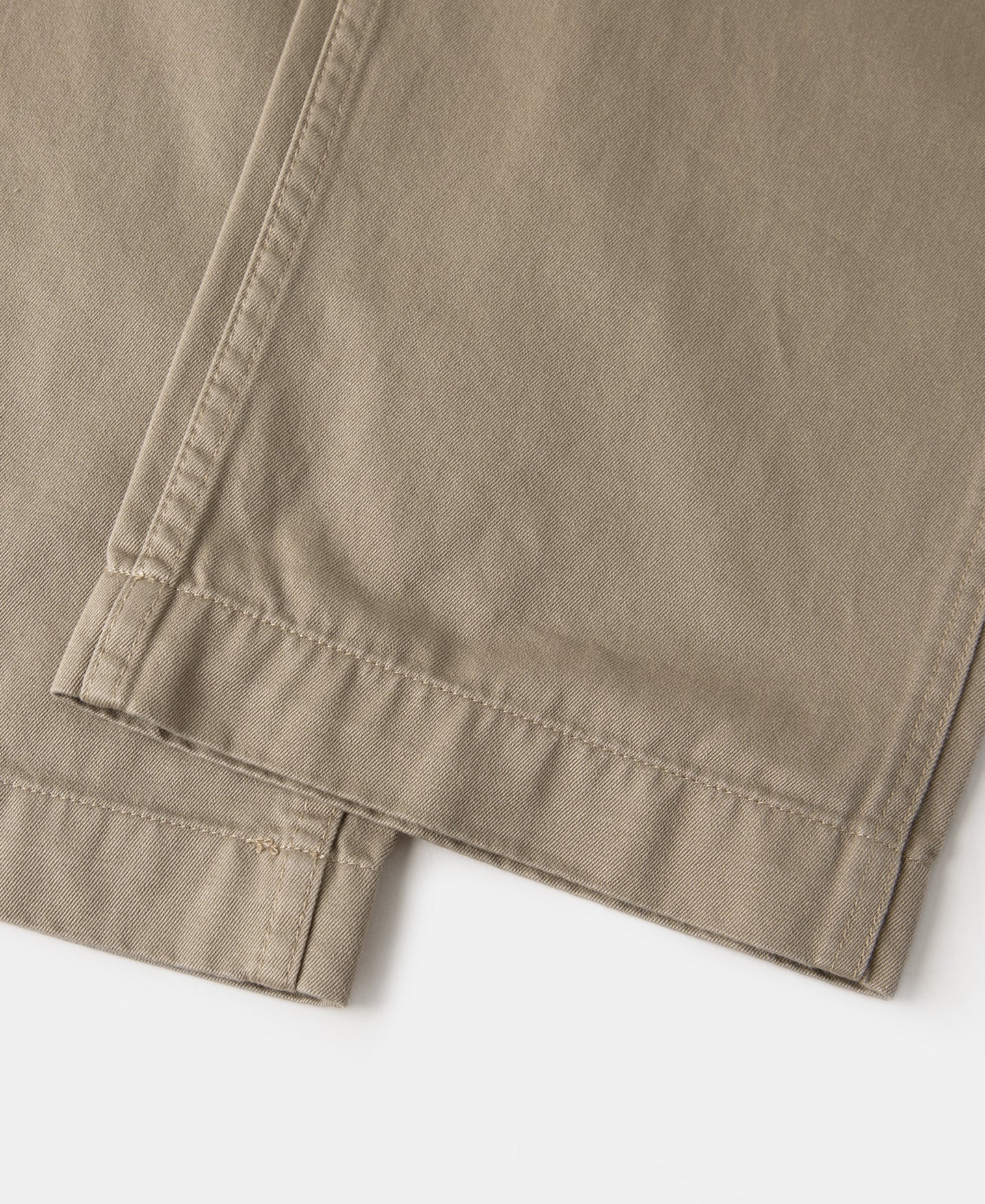 This pair is a reproduction of the rare single-pleated version of the French Army M-1952 Chino Trousers. Crafted from 10.5 oz high-density cotton twill fabric, it features a button fly, two side on-seam pockets, and two buttoned pockets at the back. The overall structure presents a high waist and straight leg shape. The design and details of this pair precisely replicate the original version. It has undergone a garment wash to give it a lived-in feel. Time Catcher stands behind the quality and authenticity of this product.