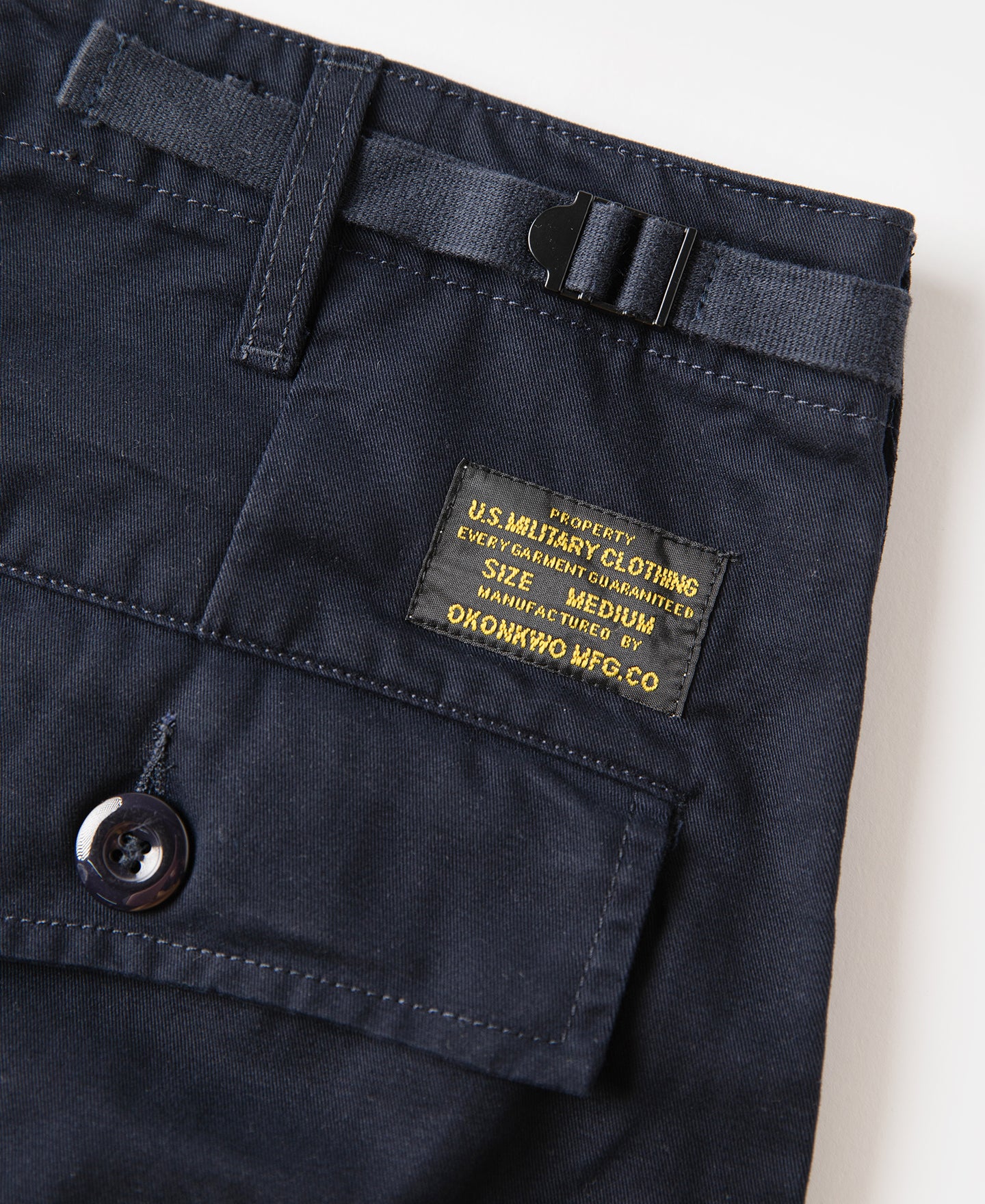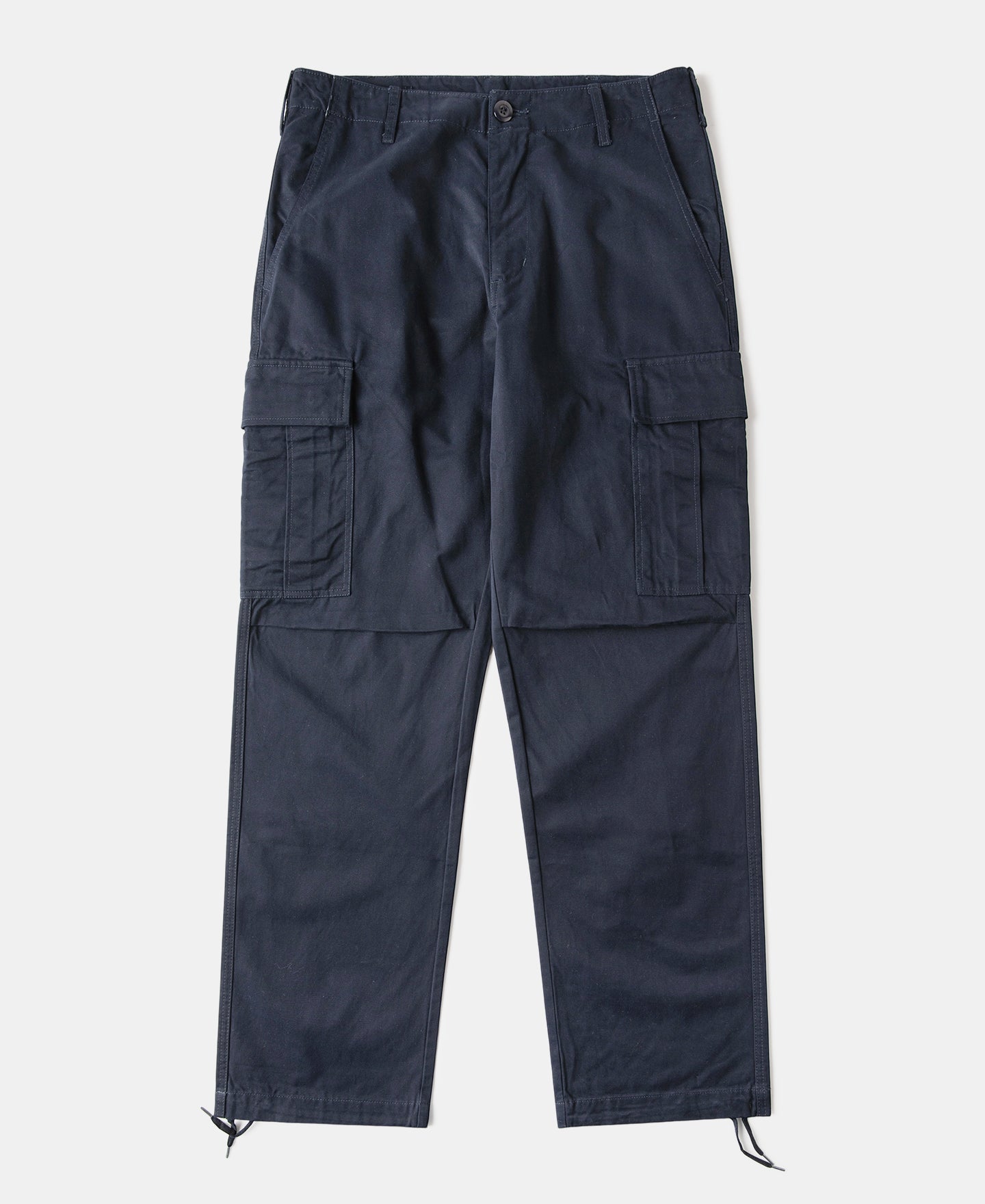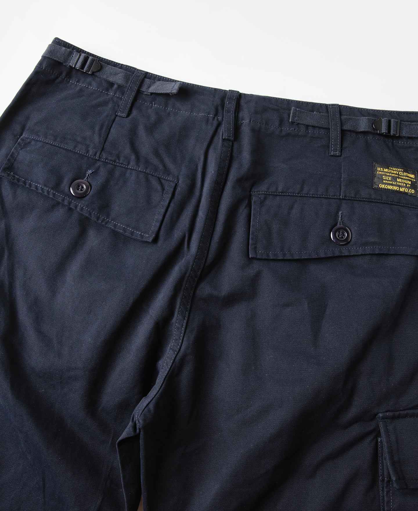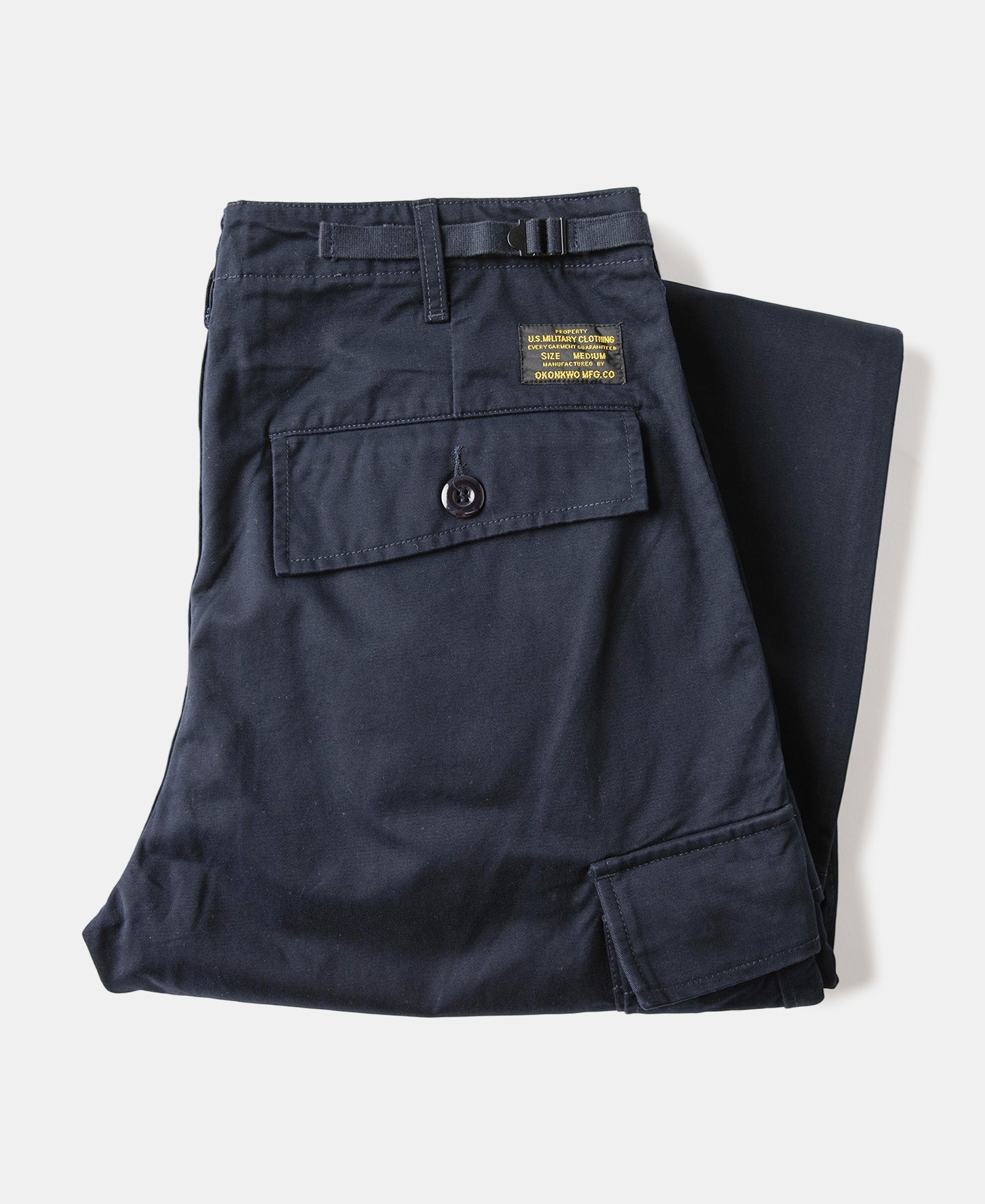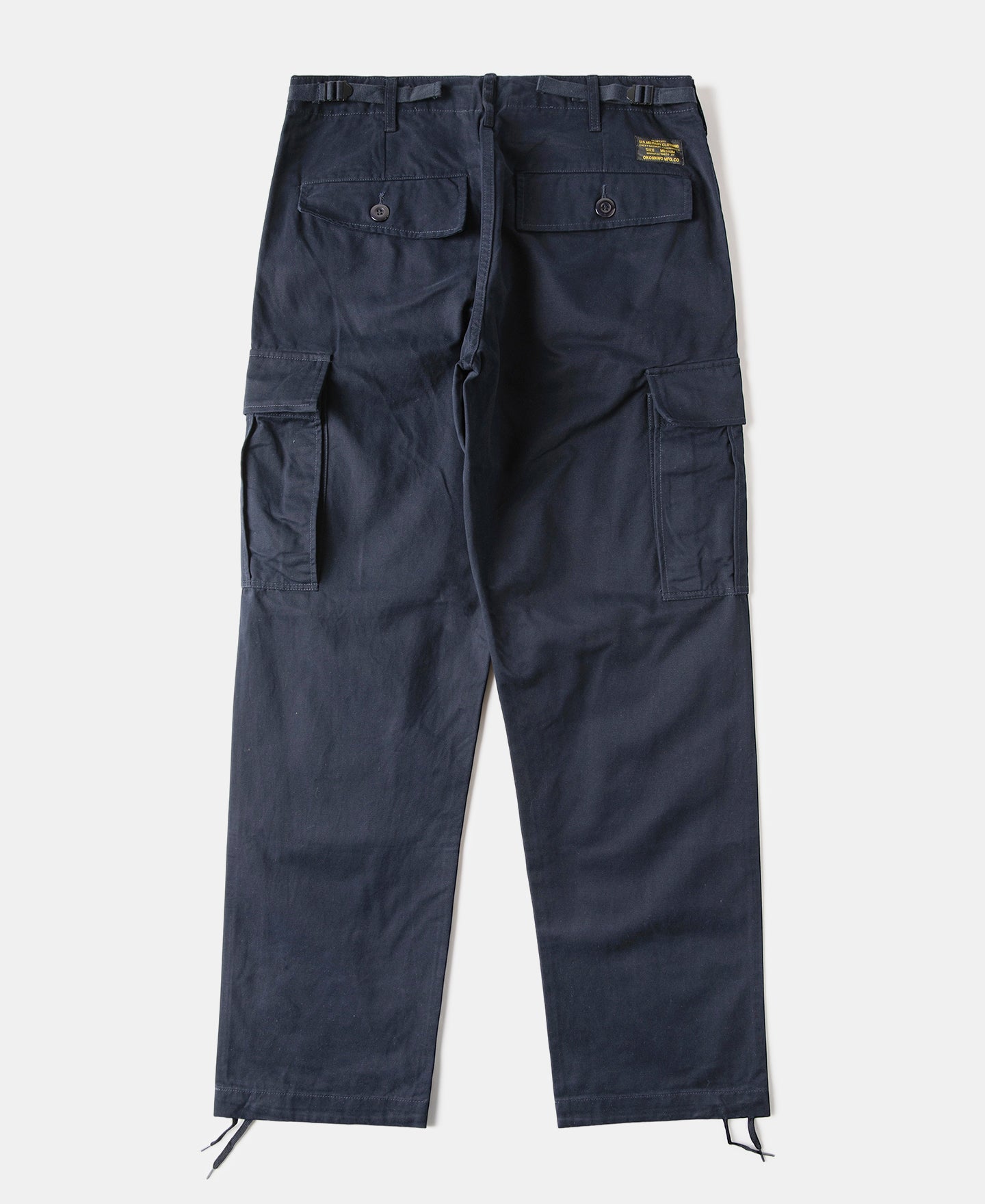 • The Okonkwo Modified M-65 Cargo Pants reimagine the classic US Army M-65 field trousers with a modern fit. The silhouette has been slimmed down from the original oversized cut, making it more versatile for daily wear. Iconic details such as adjustable waist tabs and drawstring hems are retained, while the front pockets are streamlined without flaps. Rear pockets feature angled flaps for added depth, and the side cargo pockets conceal an extra compartment for storing small essentials like a lighter.