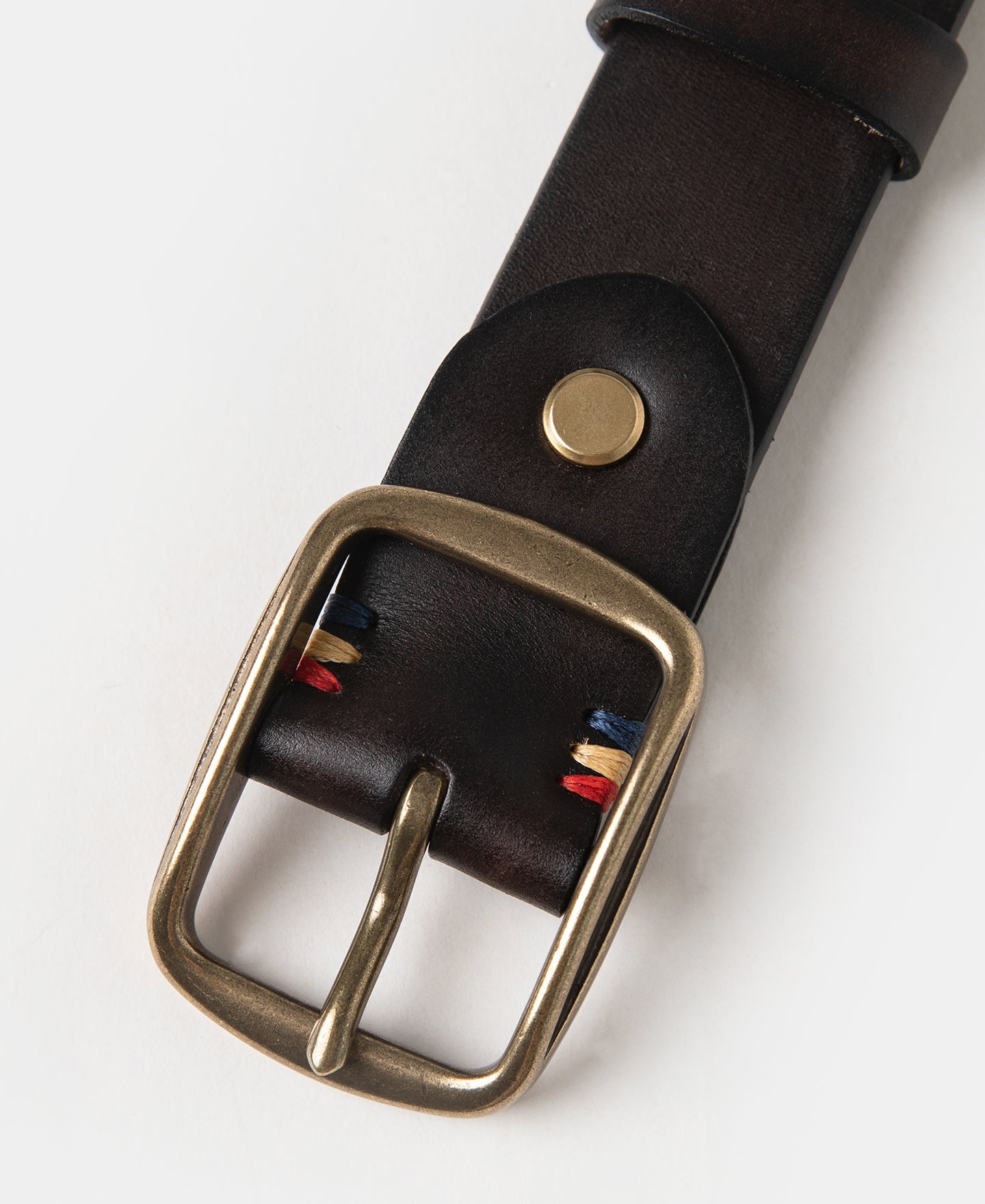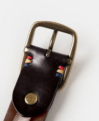 Handcrafted from Italian top-grain vegetable-tanned cowhide leather, this wide belt features a distressed brass square buckle and is stitched with vibrant-colored threads.