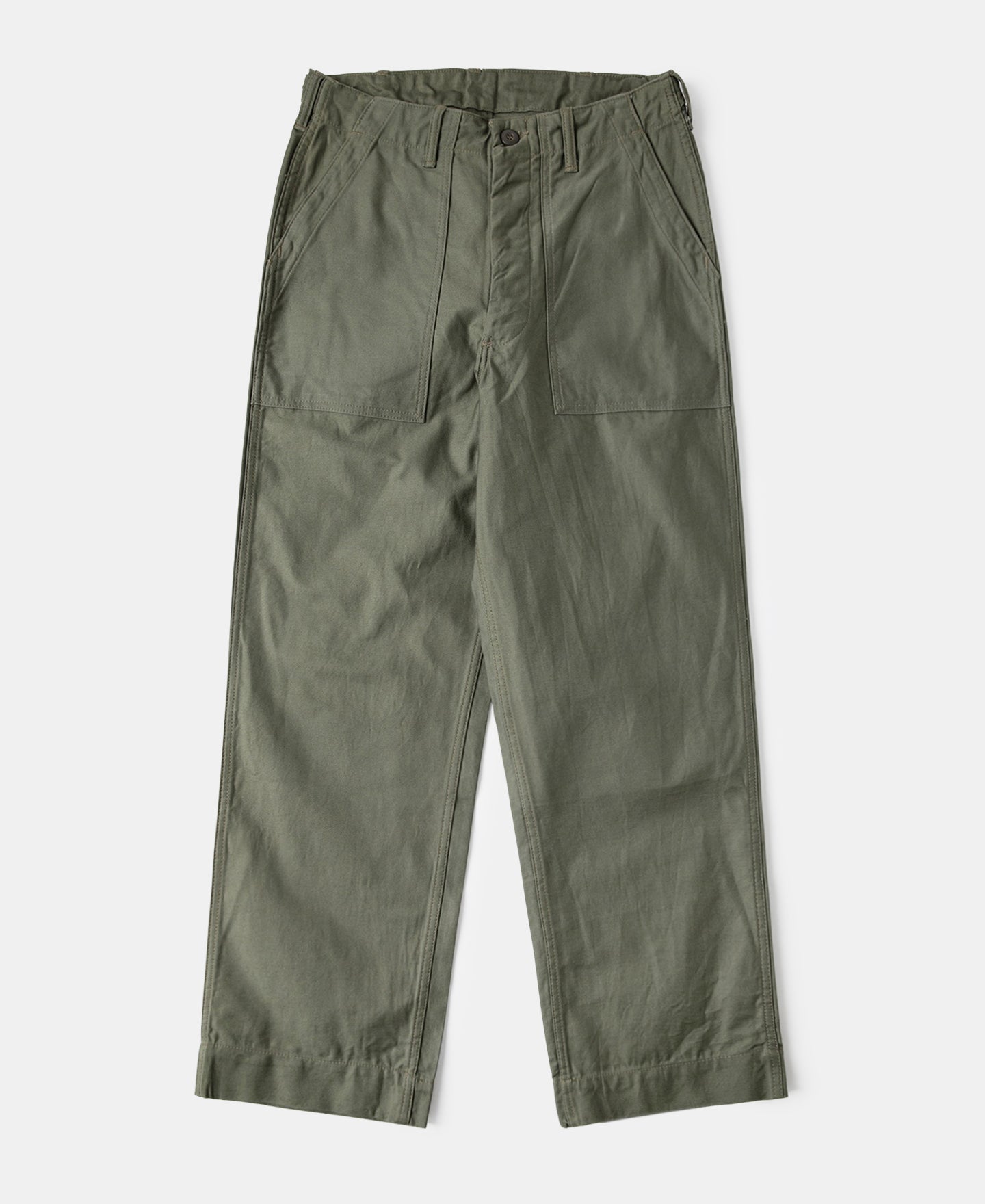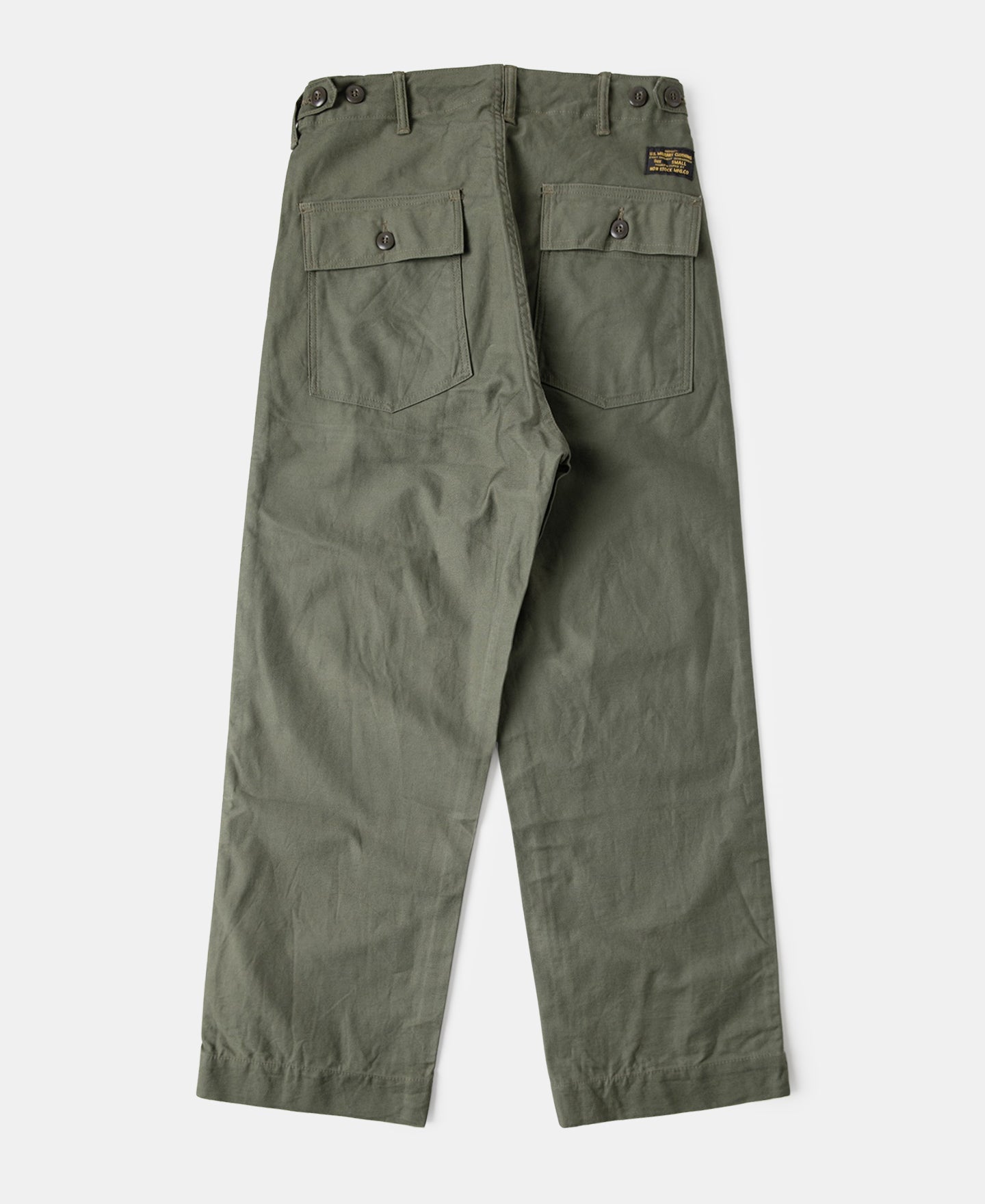 Made from 11 oz cotton sateen fabric, these pants feature a high-rise, relaxed straight-leg fit for comfort and an authentic vintage silhouette. The color is standard OG-107. They come with two side pockets and two button-fastened rear pockets, finished with classic urea buttons. -