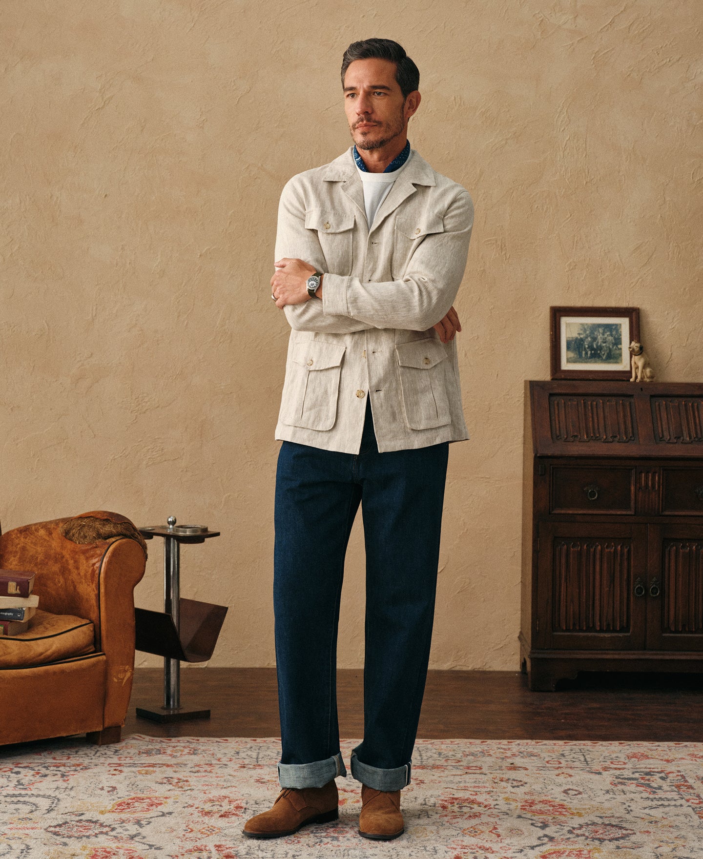 Inspired by the classic British military jackets worn in the late 19th century. By the 1930s, the term "safari" had become associated with the iconic four-pocket field jacket.