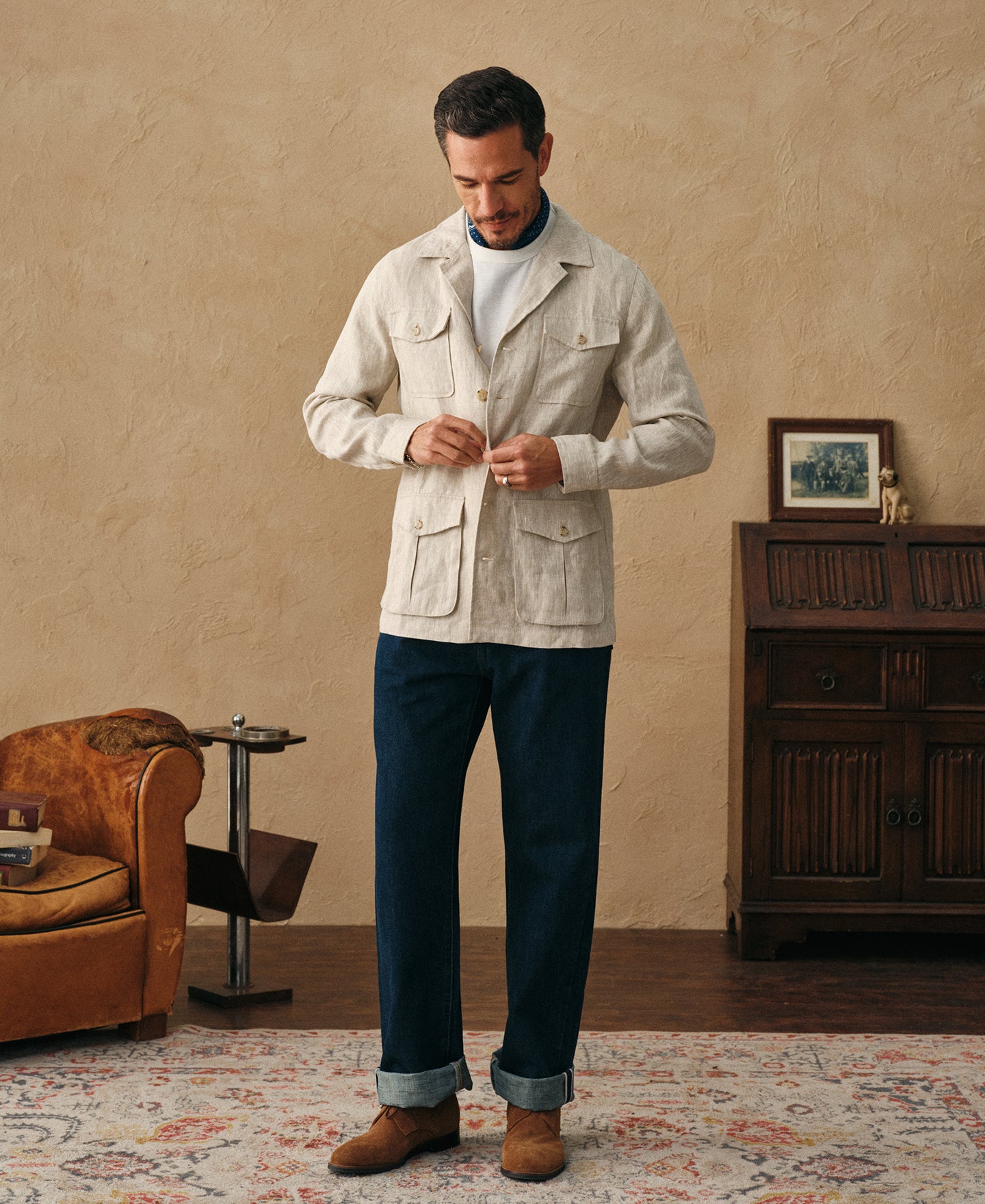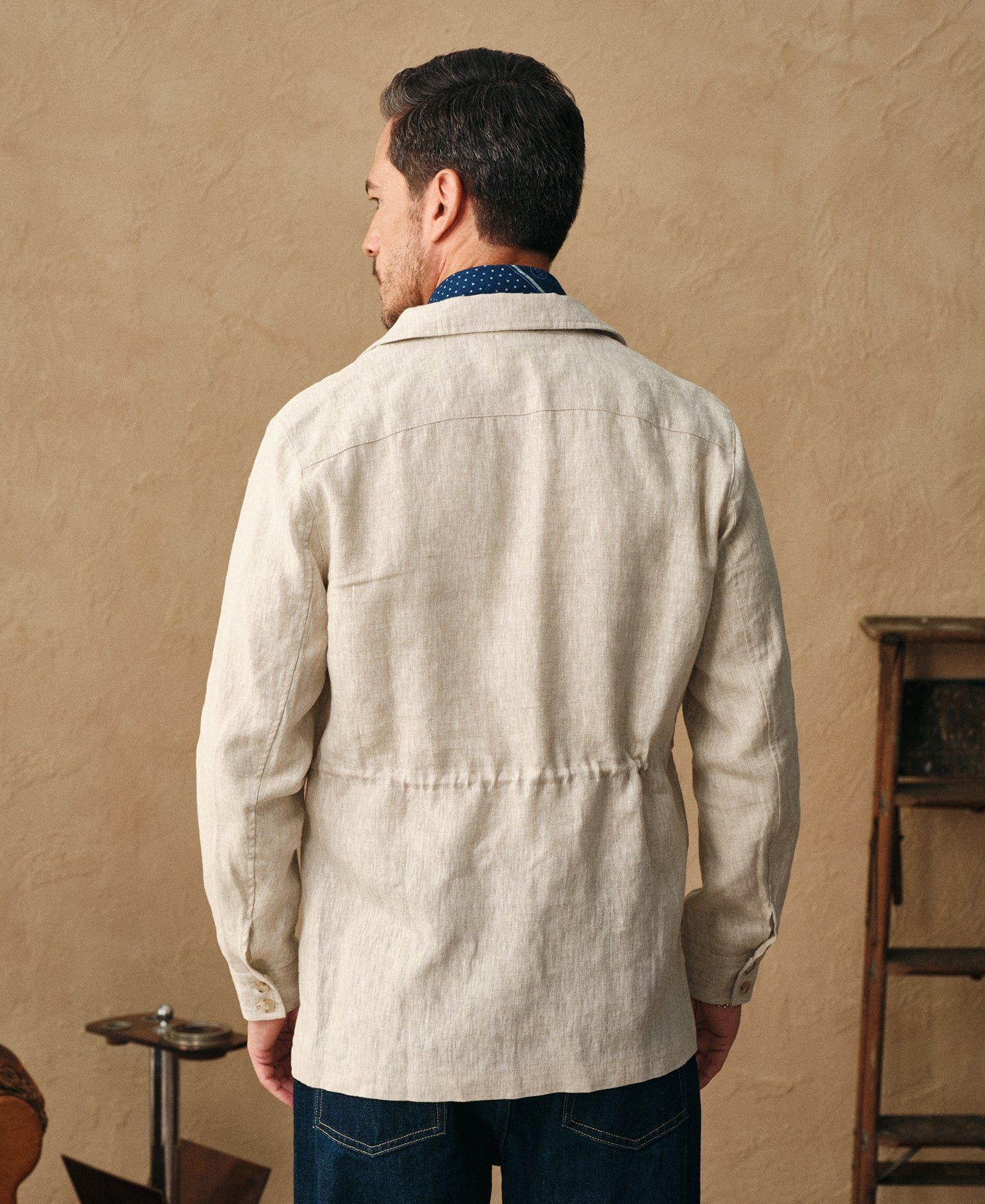 Crafted from 240 GSM pure linen in a natural tone, this jacket features a classic safari silhouette with a point collar and button-front closure. Lightweight yet structured, it offers a timeless, rugged character.