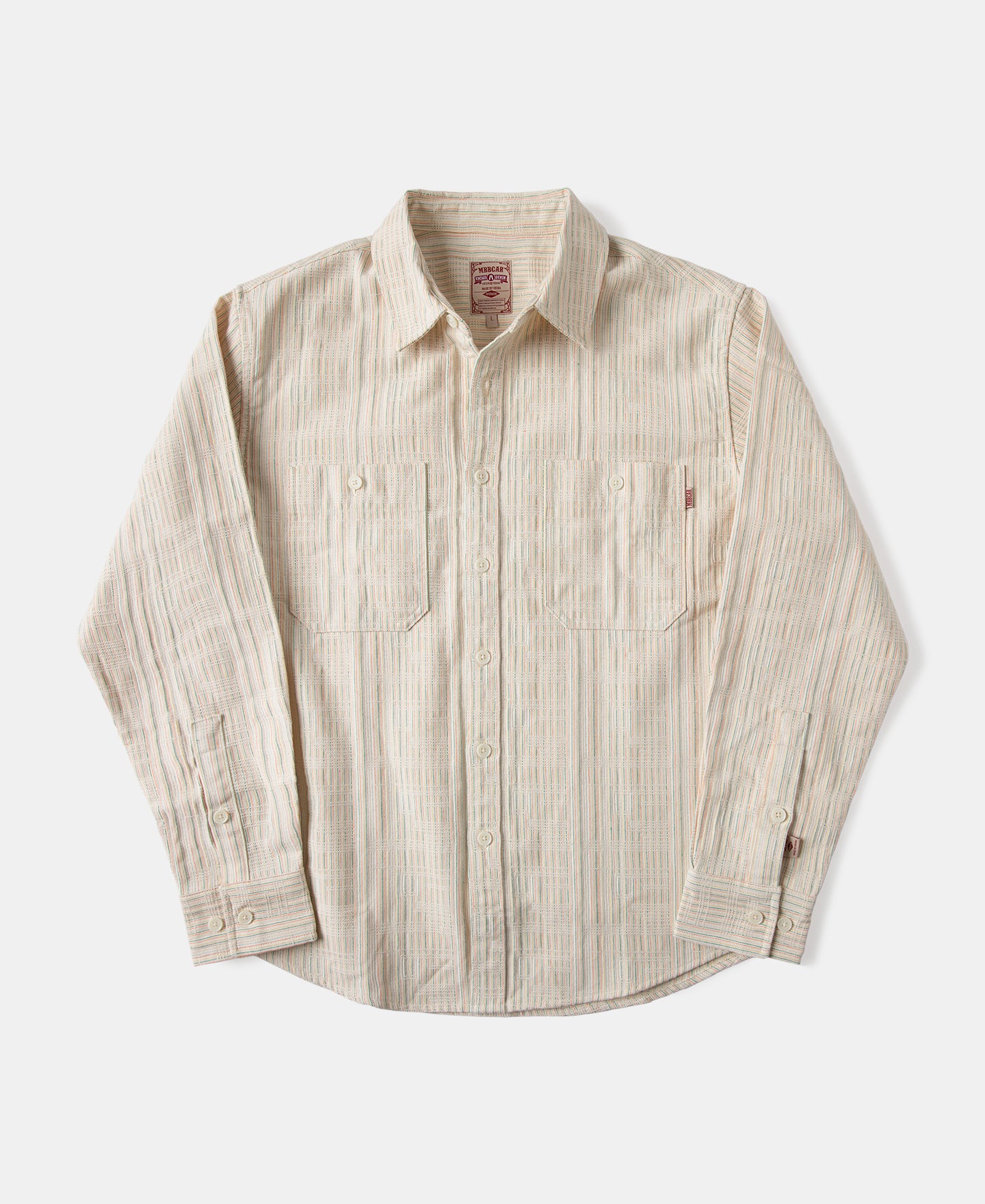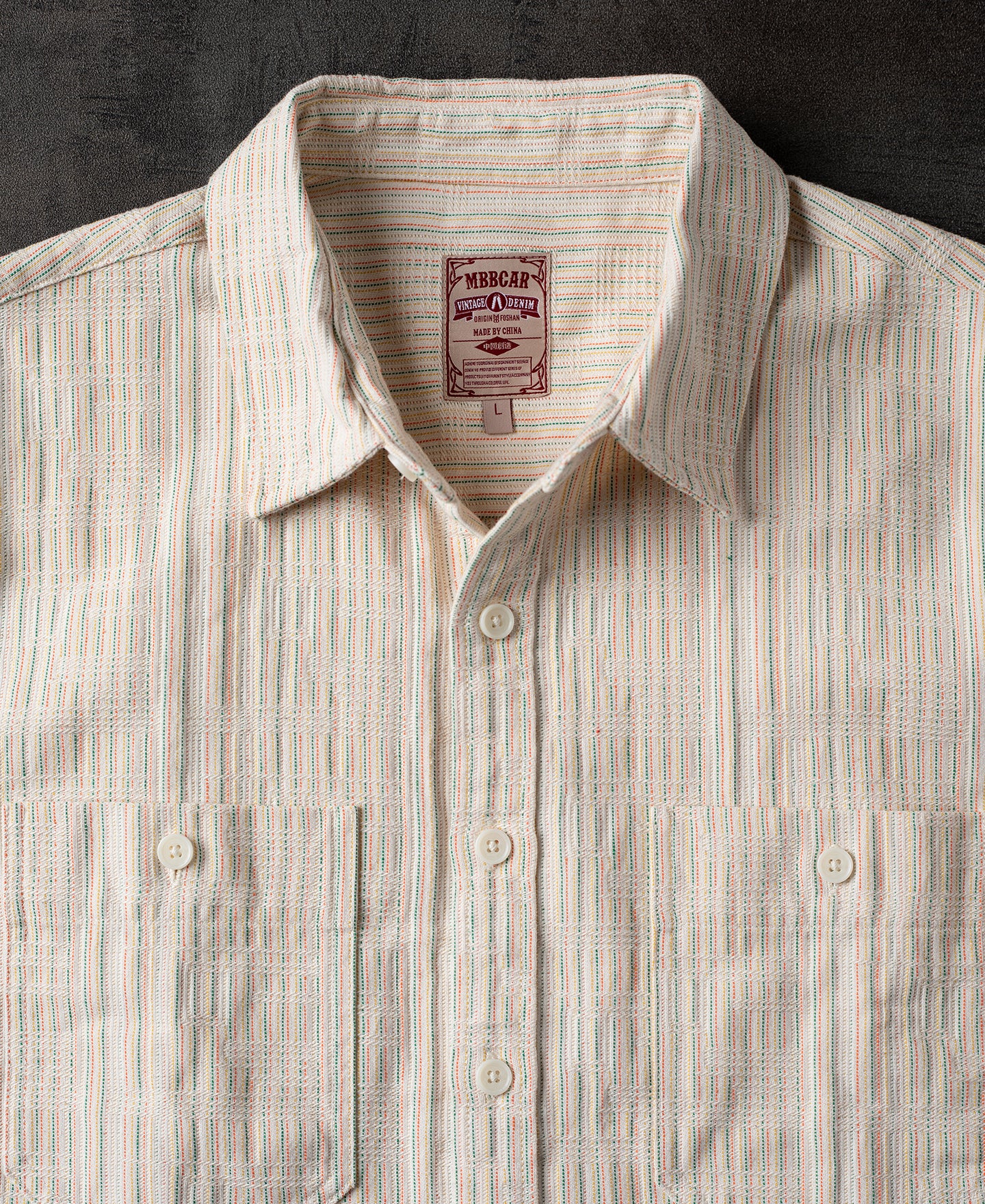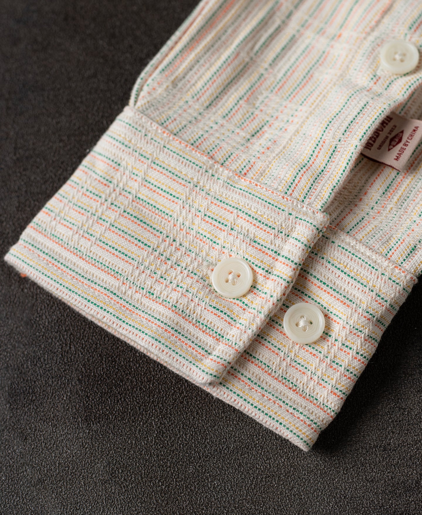 Designed in a classic workwear silhouette, this shirt is made from a custom-woven 300g pure cotton fabric with a unique texture. Beneath the cream surface, red, green, and yellow threads are intricately interwoven, creating a subtle yet rich layered look. The detailed texture offers a distinctly vintage and premium feel. Perfect for pairing with denim jeans for a vintage yet refined look.