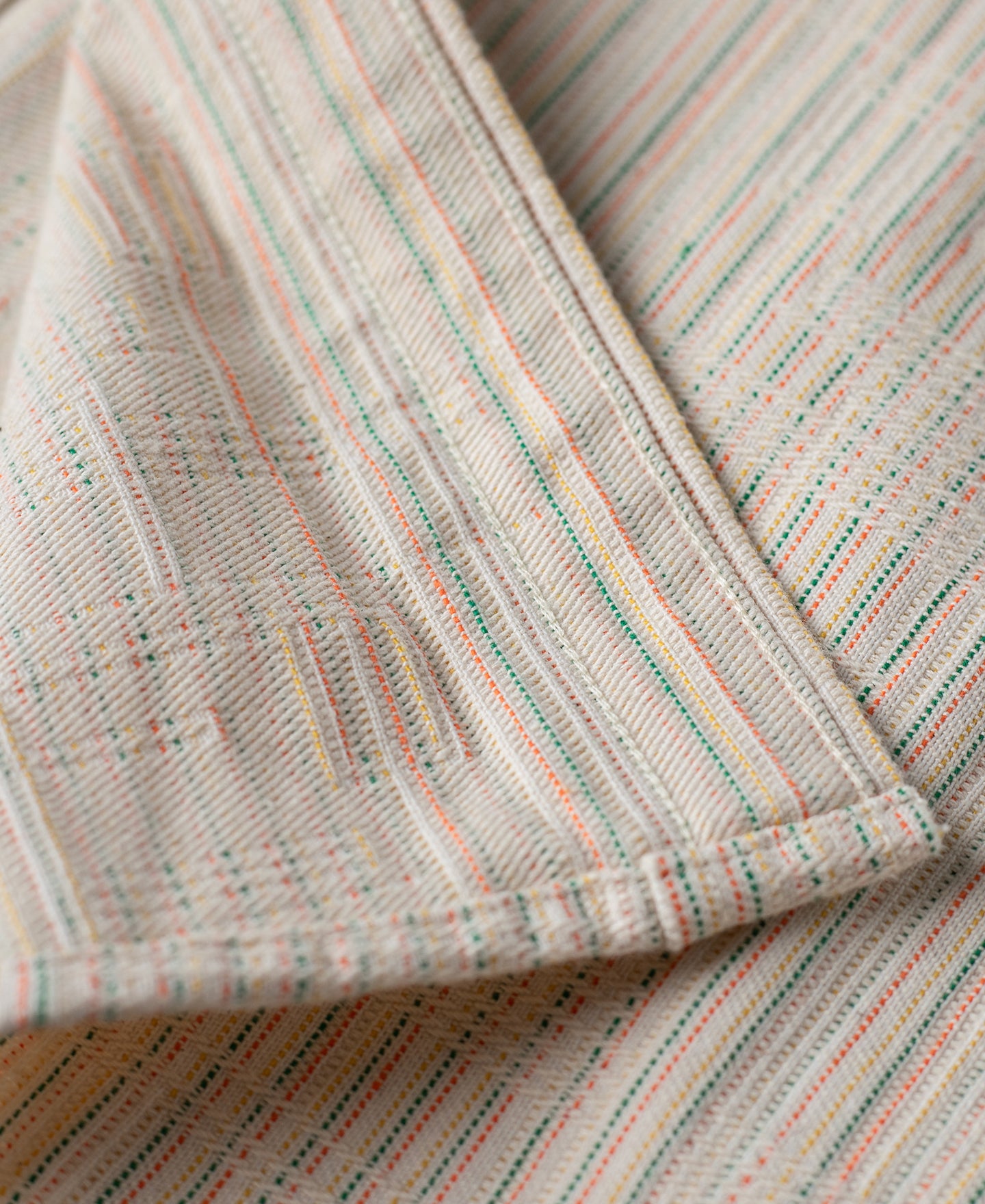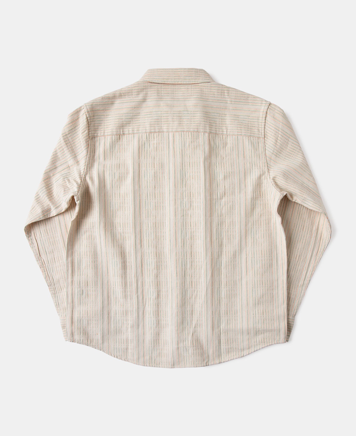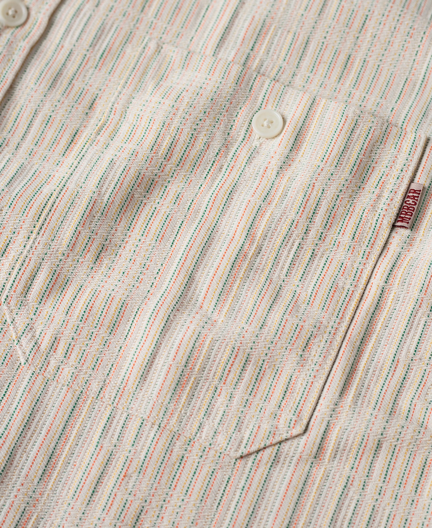 Designed in a classic workwear silhouette, this shirt is made from a custom-woven 300g pure cotton fabric with a unique texture. Beneath the cream surface, red, green, and yellow threads are intricately interwoven, creating a subtle yet rich layered look. The detailed texture offers a distinctly vintage and premium feel. Perfect for pairing with denim jeans for a vintage yet refined look.