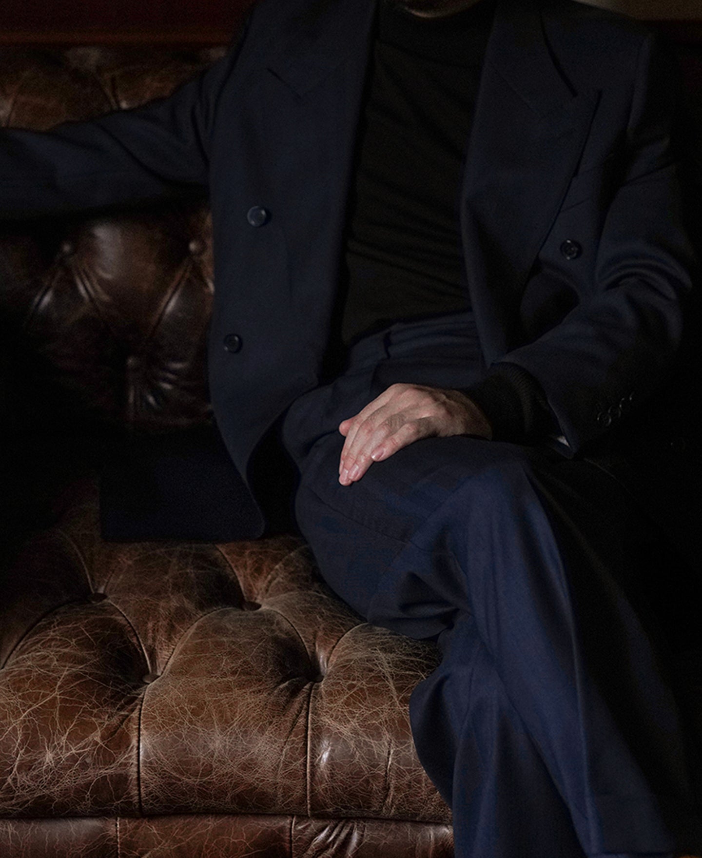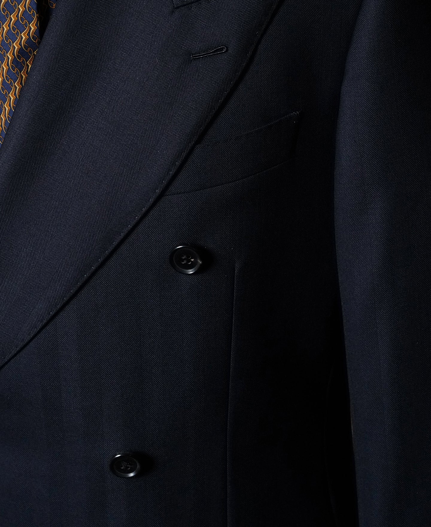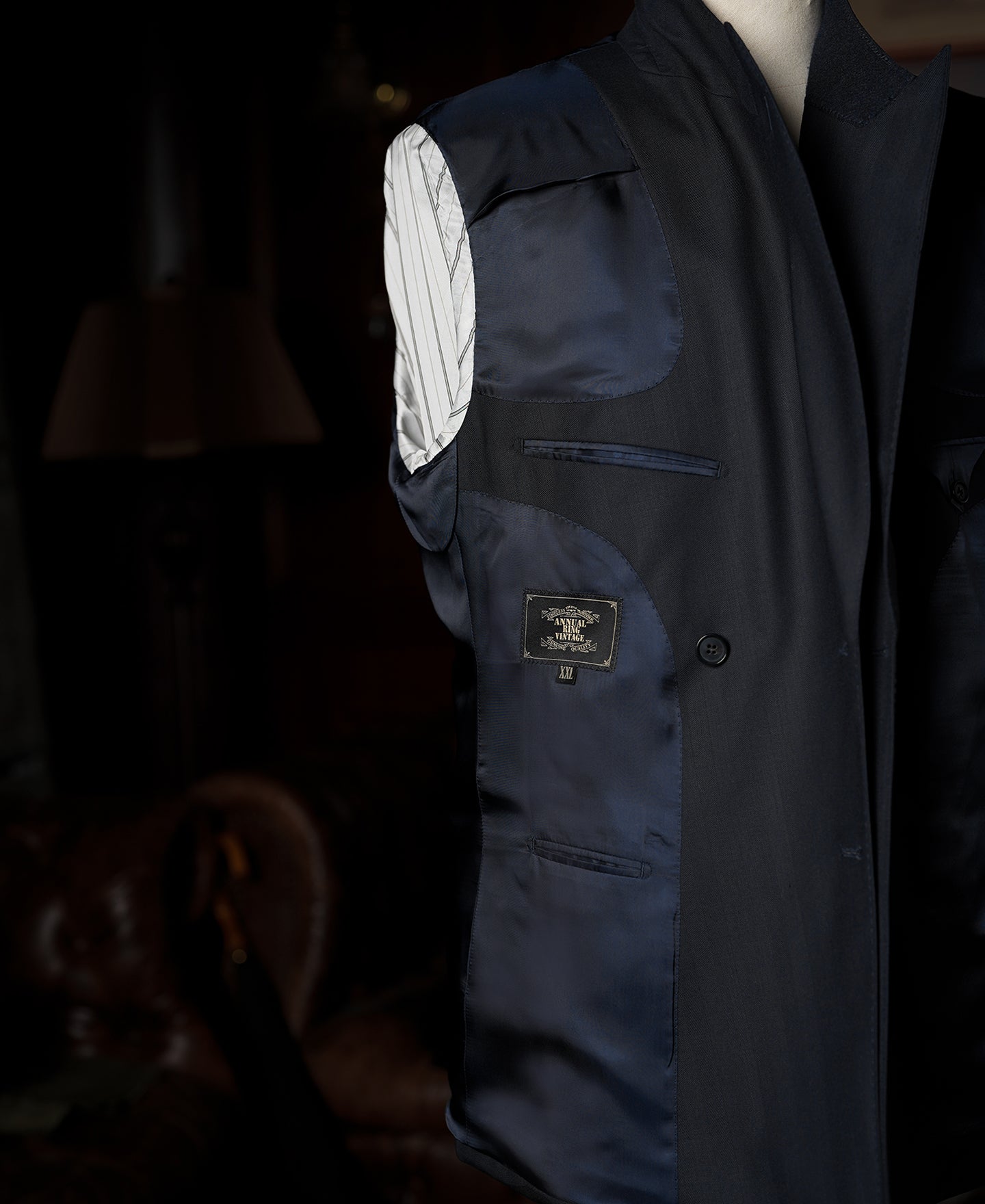 The 12cm wide curved lapels are understated yet distinctly vintage, with a lowered gorge line for a traditional,