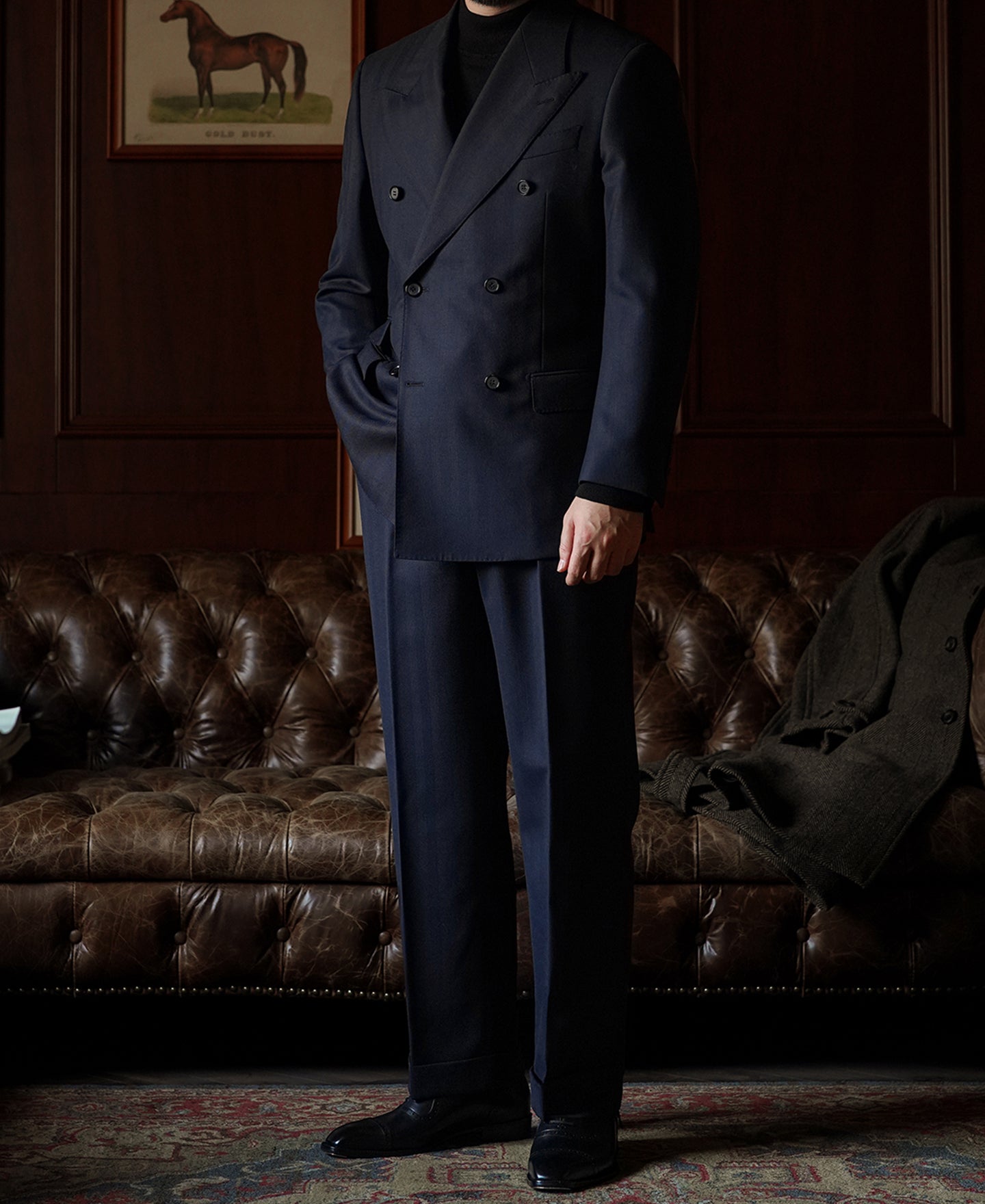 Inspired by the golden era of 1930s British tailoring, this suit features a classic six-button, two-roll structure with broad shoulders and a sculpted waist, creating a refined hourglass silhouette.