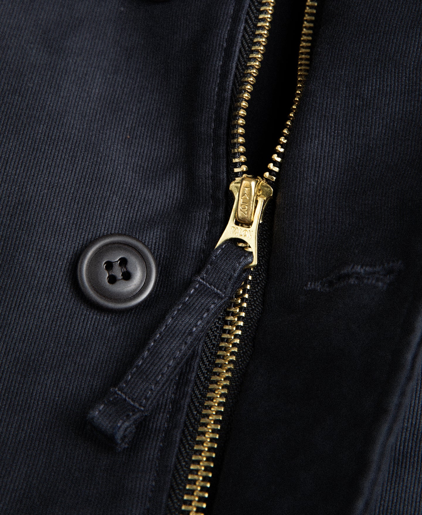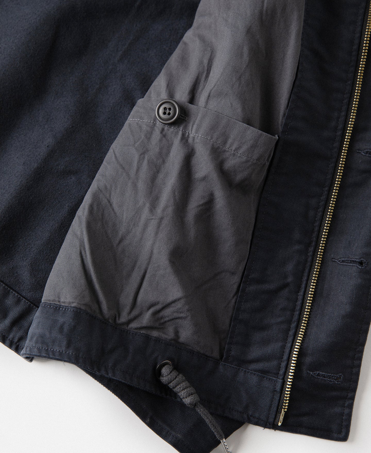 Crafted from a heavyweight, high-density jungle cloth (100% cotton), it provides substantial warmth and a structured silhouette. The corduroy-trimmed collar and cuffs offer a soft contrast to the durable outer shell, while a Talon zipper and Japanese urea buttons echo its authentic heritage.