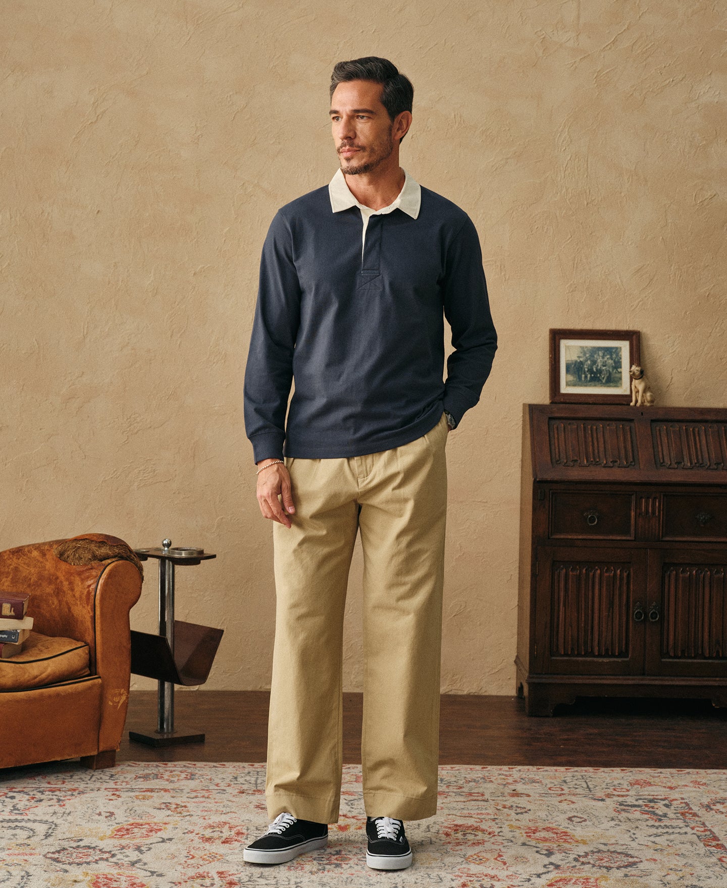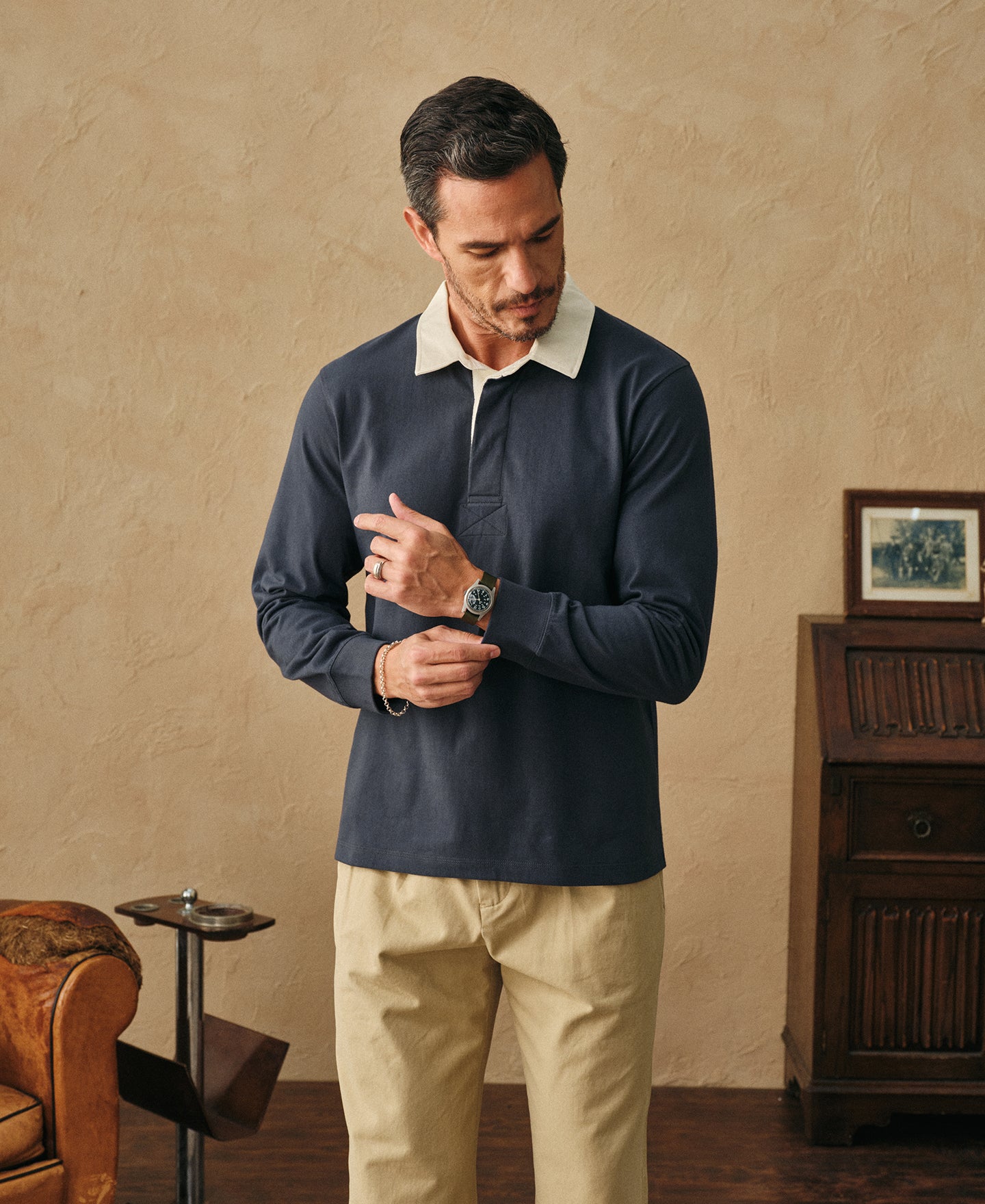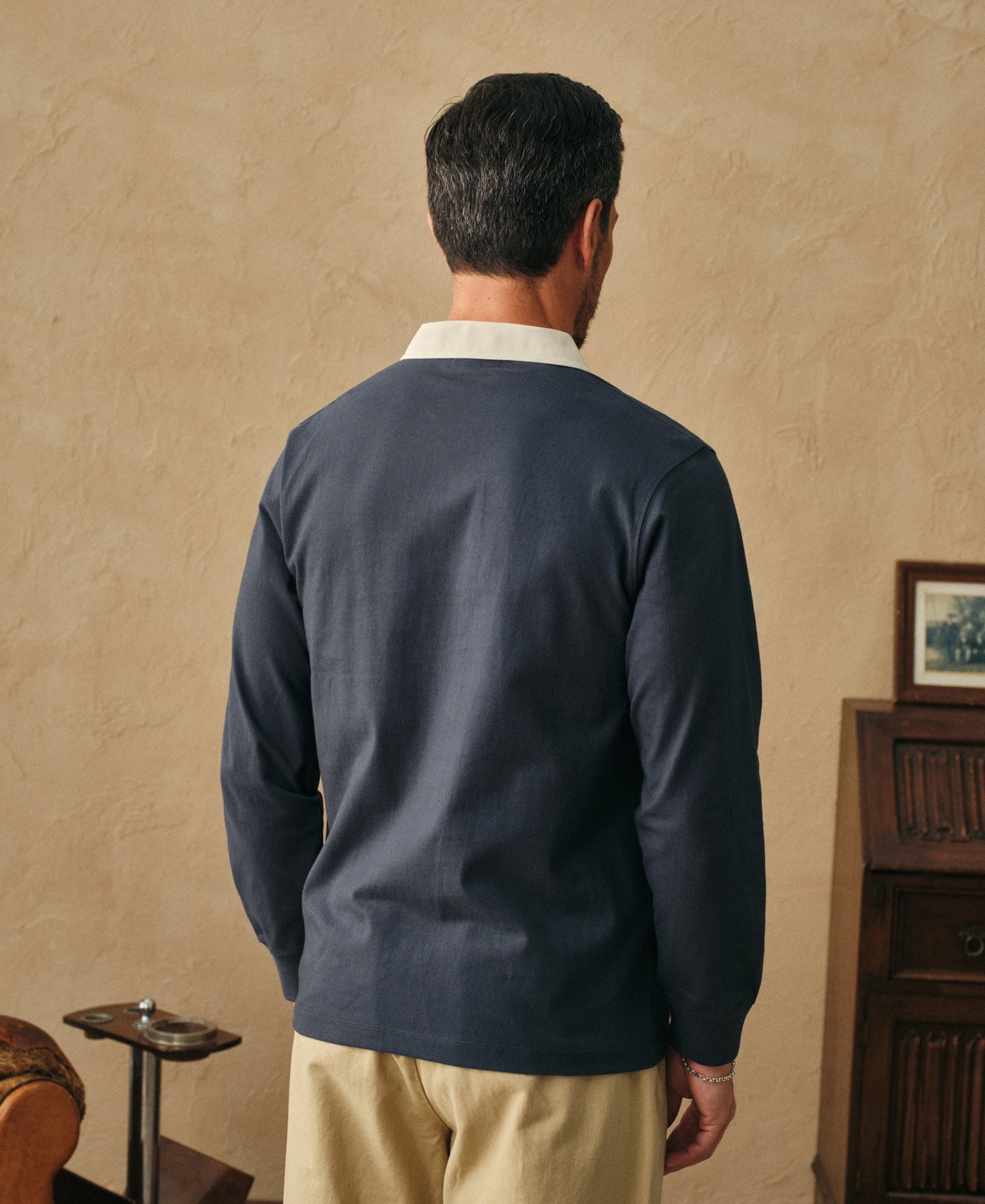 Made from heavyweight 7.8 oz cotton jersey. It features a twill rugby collar, a concealed three-button rugby placket, herringbone placket facing, and ribbed cuffs. The vintage-inspired seamless tubular body construction, combined with athletic details and a classic design, captures a preppy yet sporty sensibility.