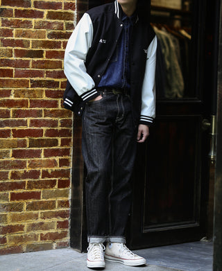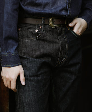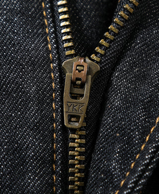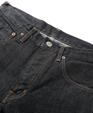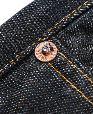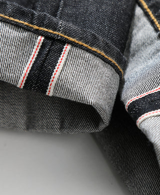 These basic five-pocket straight-fit jeans are comfortable and versatile, making them a must-have staple in your wardrobe. They pair perfectly with boots, sneakers, and athletic shoes. The 14 oz heavyweight selvedge denim features a ring-spun rope dyeing process, offering a vintage look.