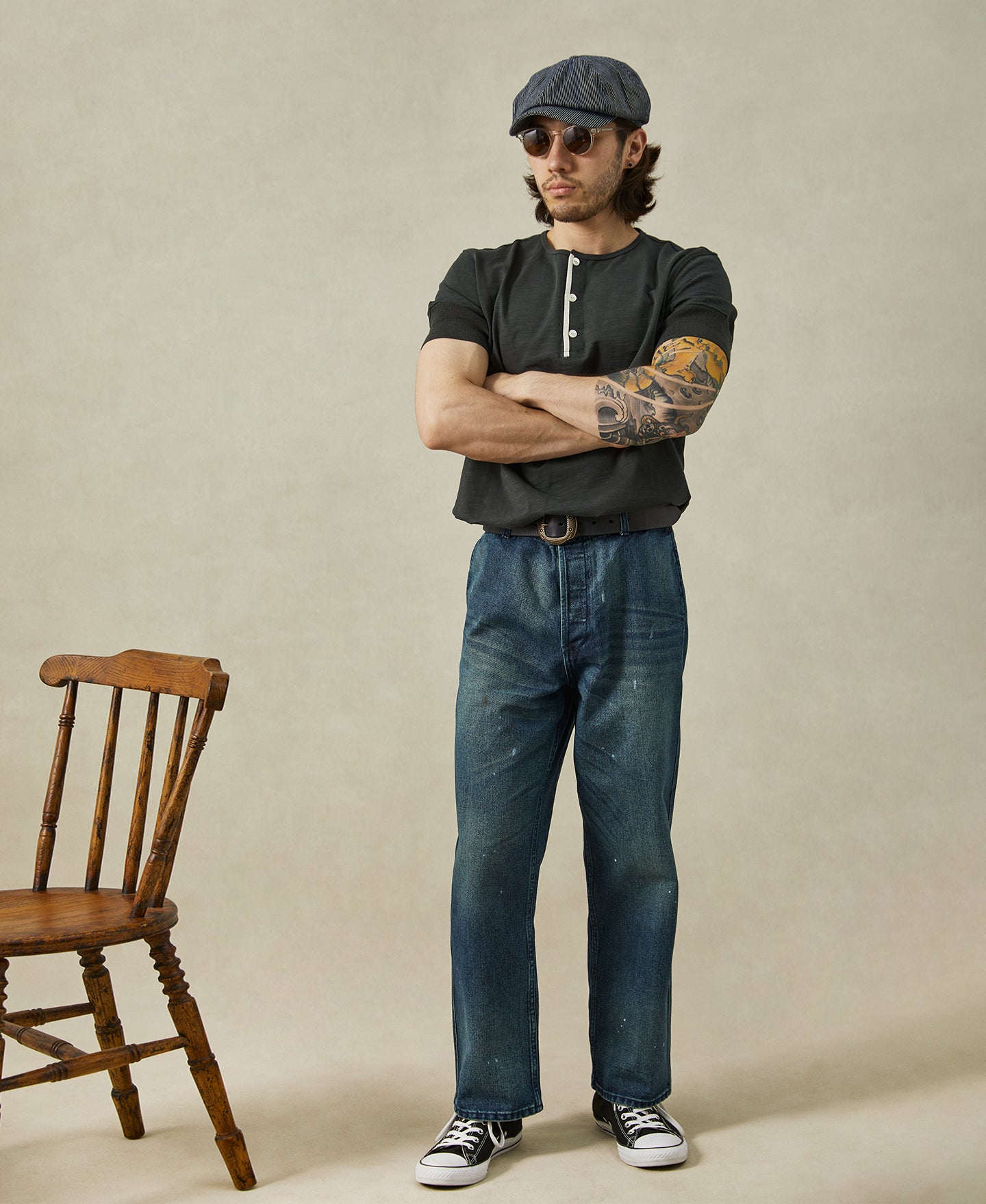 Inspired by the henry shirts of the 1900s, this one is crafted from 9.8 oz slub cotton fabric. The vintage cut and contrast color placket, featuring 3 genuine mother-of-pearl buttons, not only exude exceptional texture but also embody traditional style.