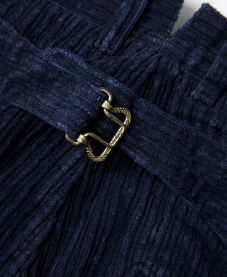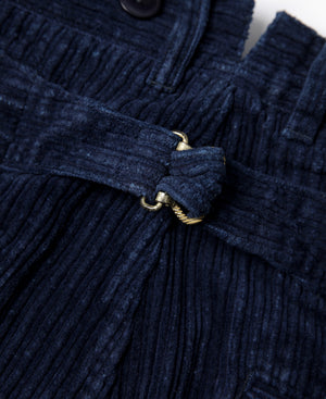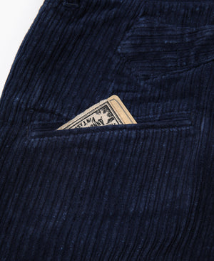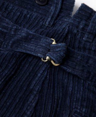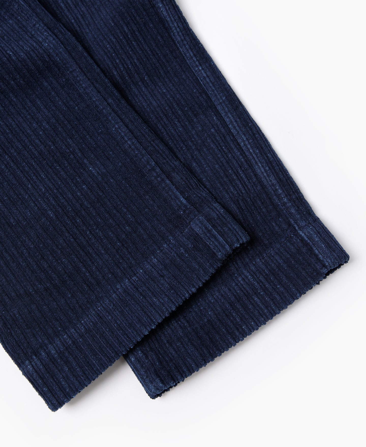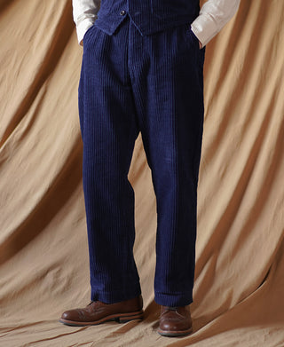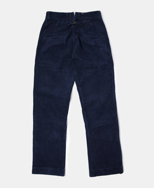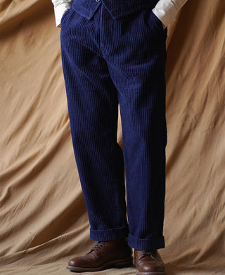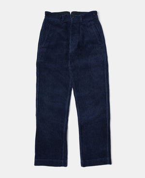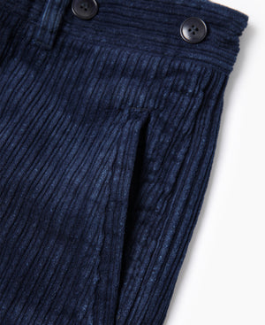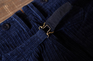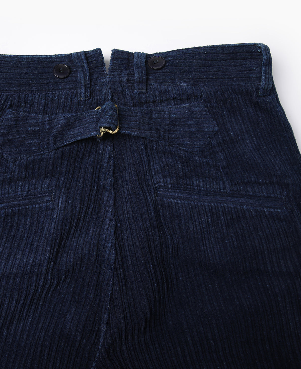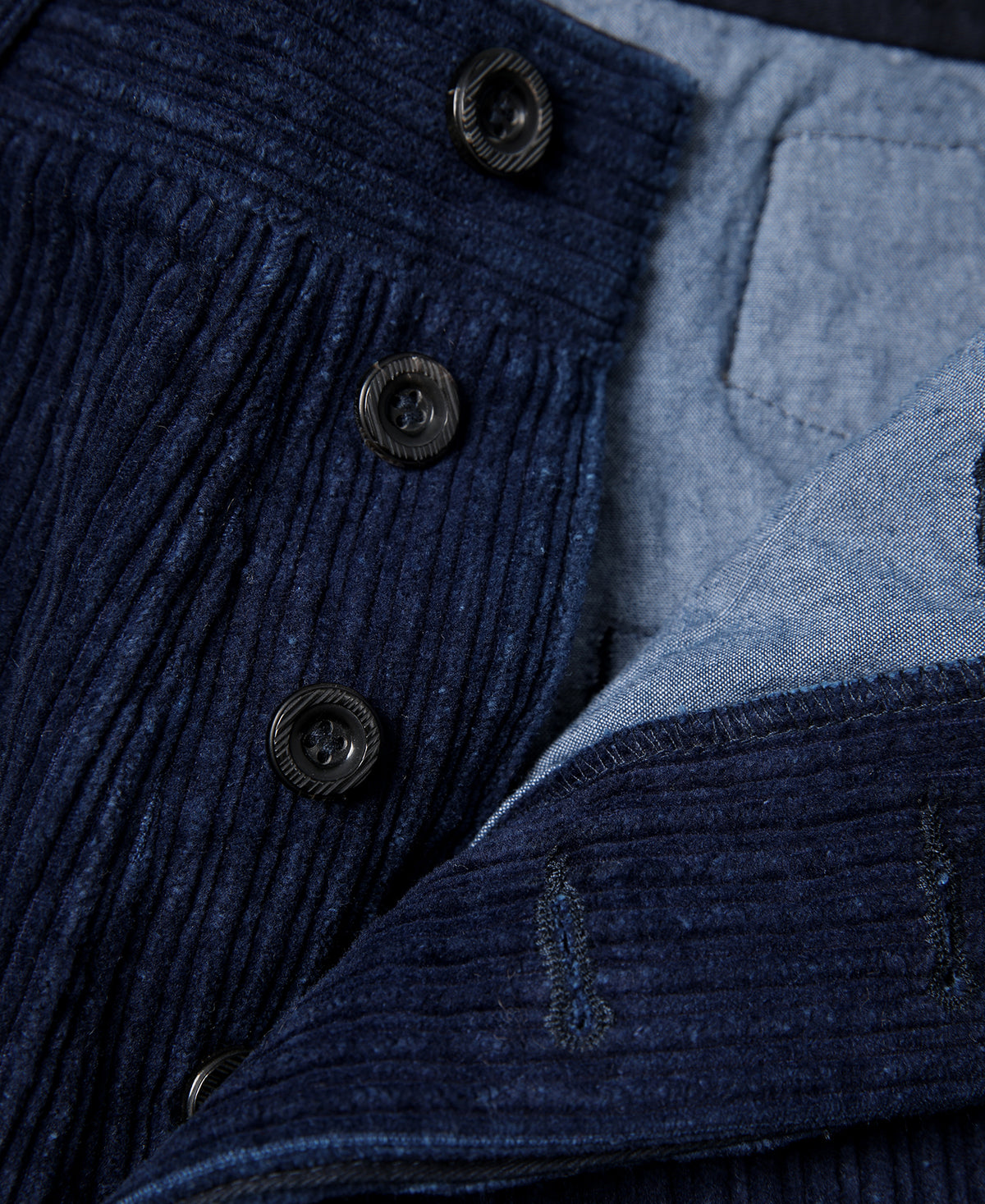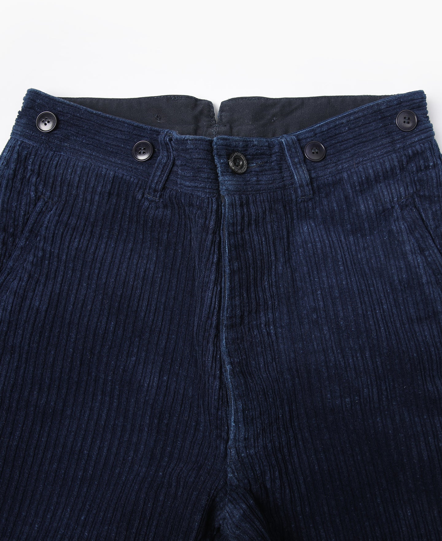 These classic-fit pants boast a straight leg, high rise, and genuine horn buttons. They feature exterior buttons for braces, and a button fly with a buttoned closure. Made from indigo-dyed thick and thin stripes corduroy fabric, they blend retro style with comfort effortlessly.