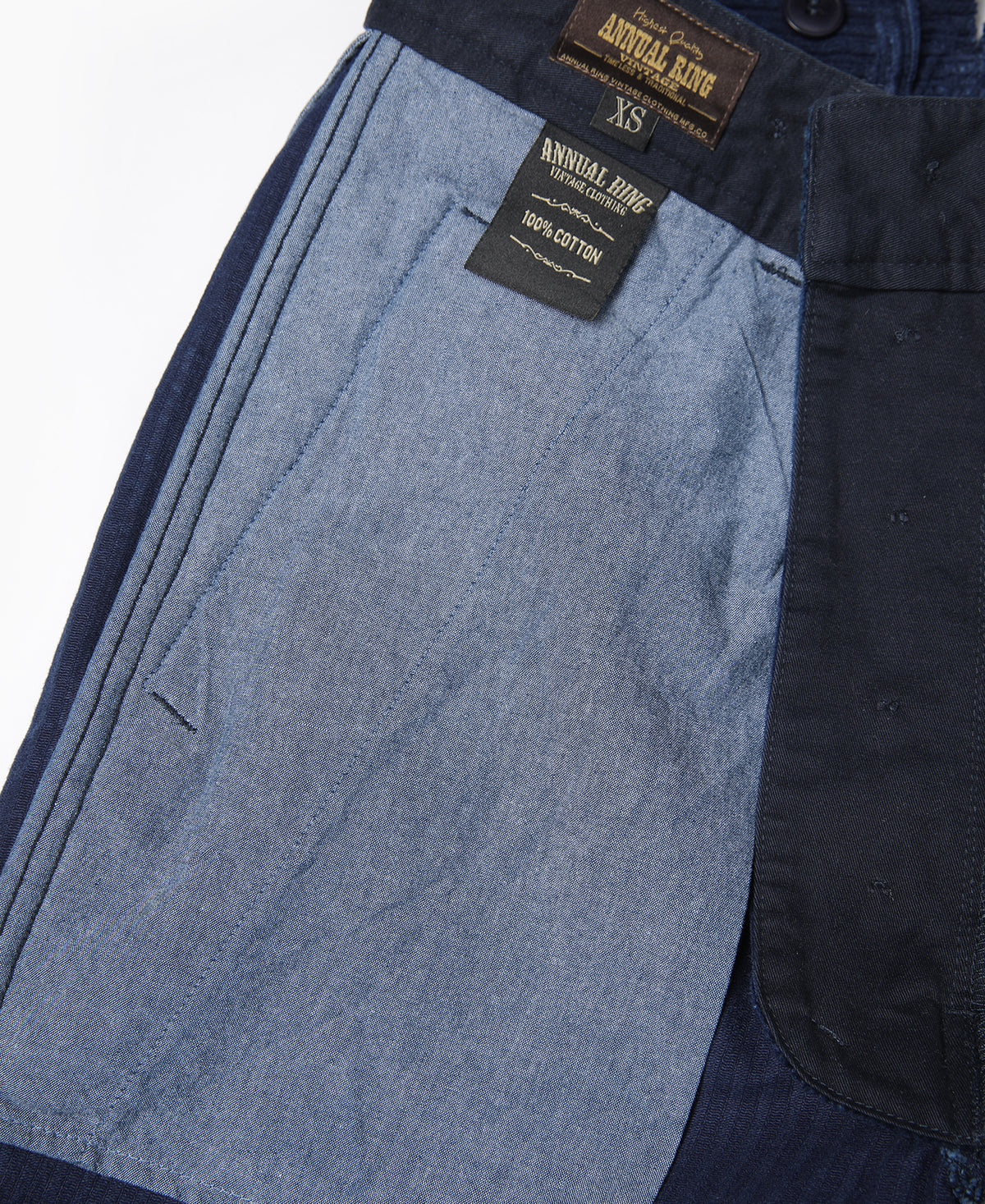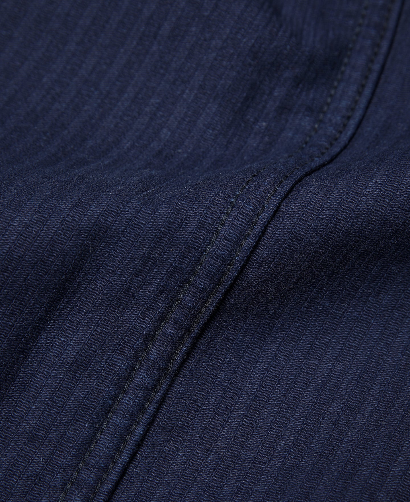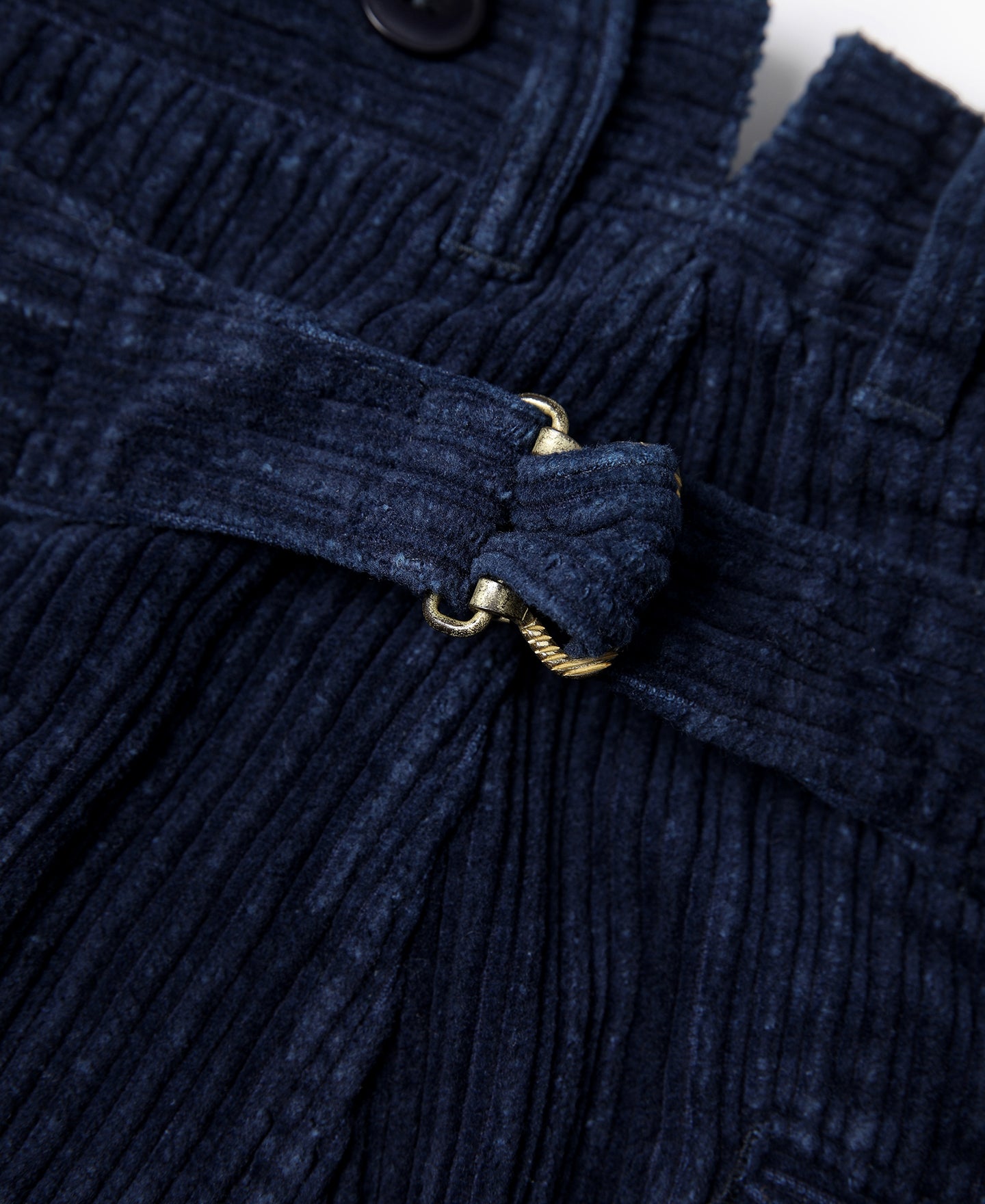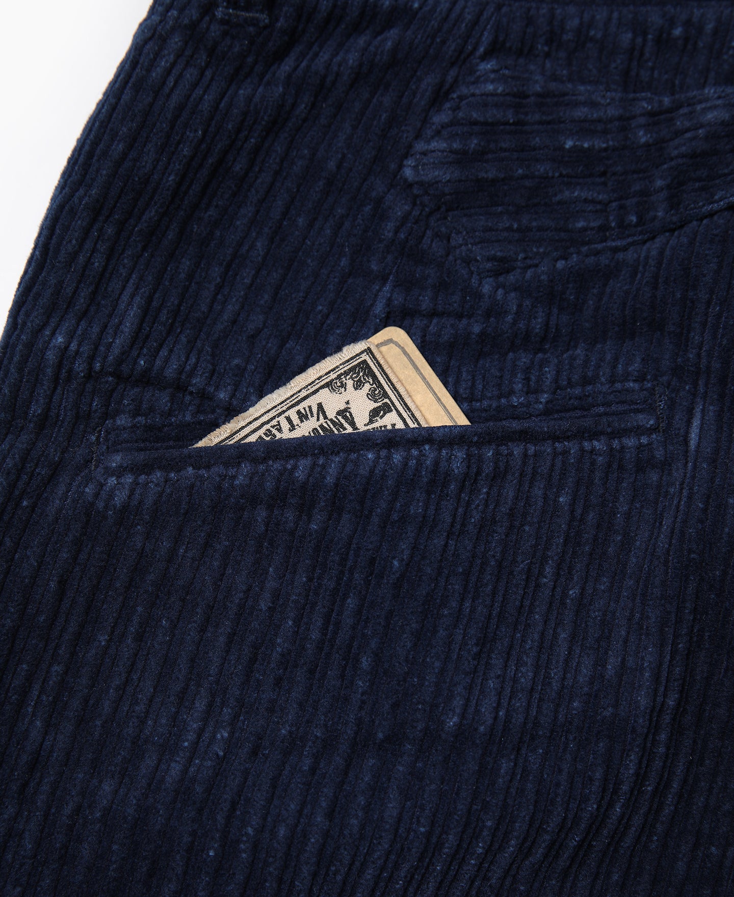 - Shell: 100% cotton, indigo-dyed thick and thin stripes corduroy fabric. Waist lining: 100% cotton, high-density cotton twill fabric. Pocket cloth: High-density chambray cloth.