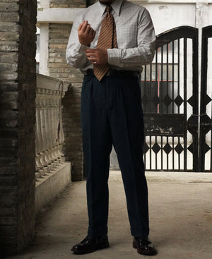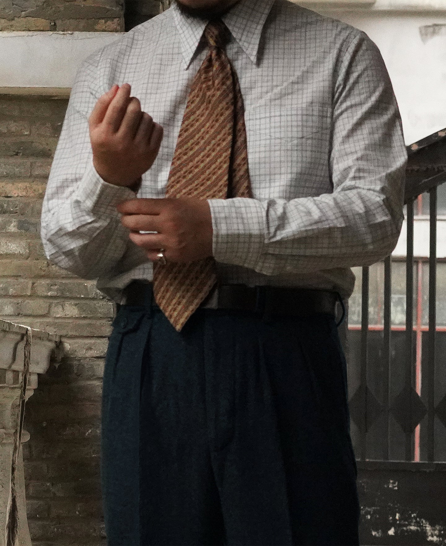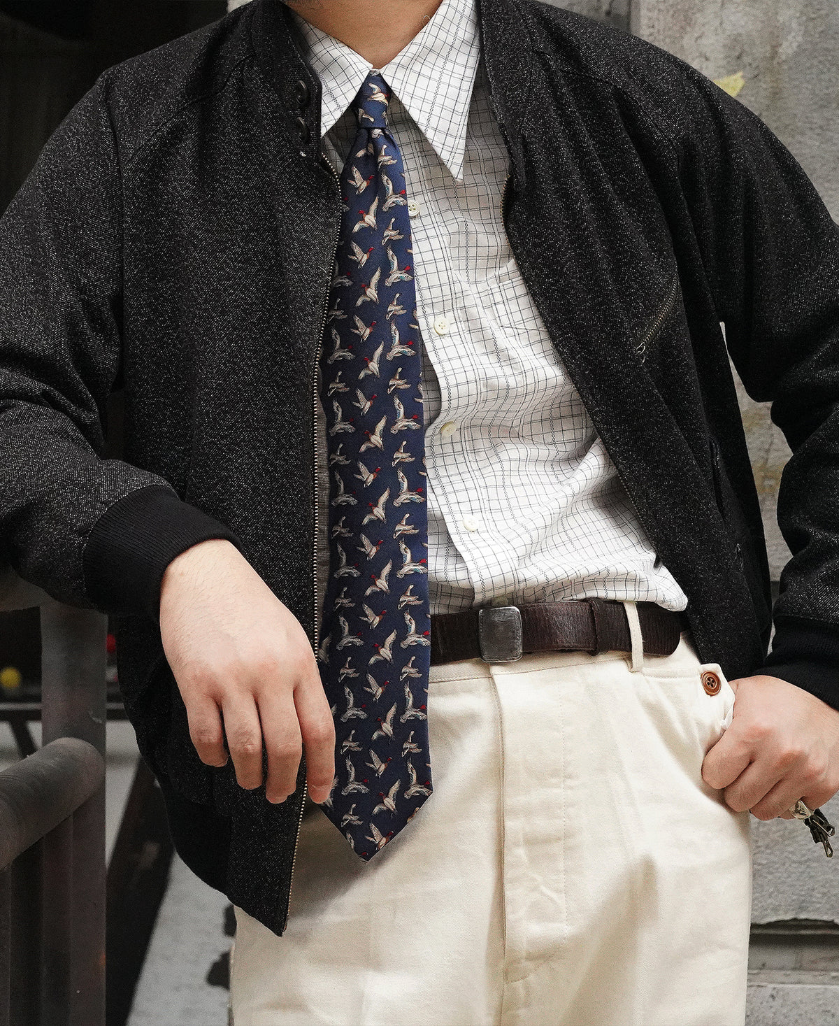 This shirt's fabric is inspired by a 1950s vintage design, tweaked for an authentic '50s look. It's medium to thin, featuring blue lines and detailed jacquard for a unique texture.