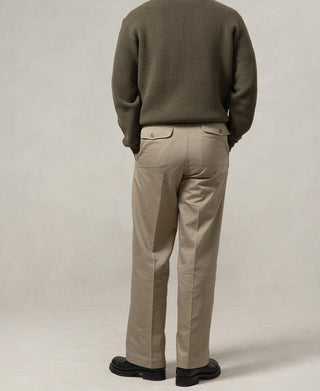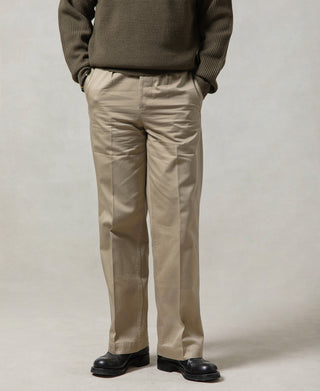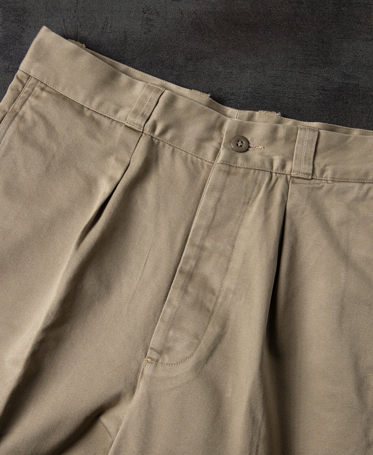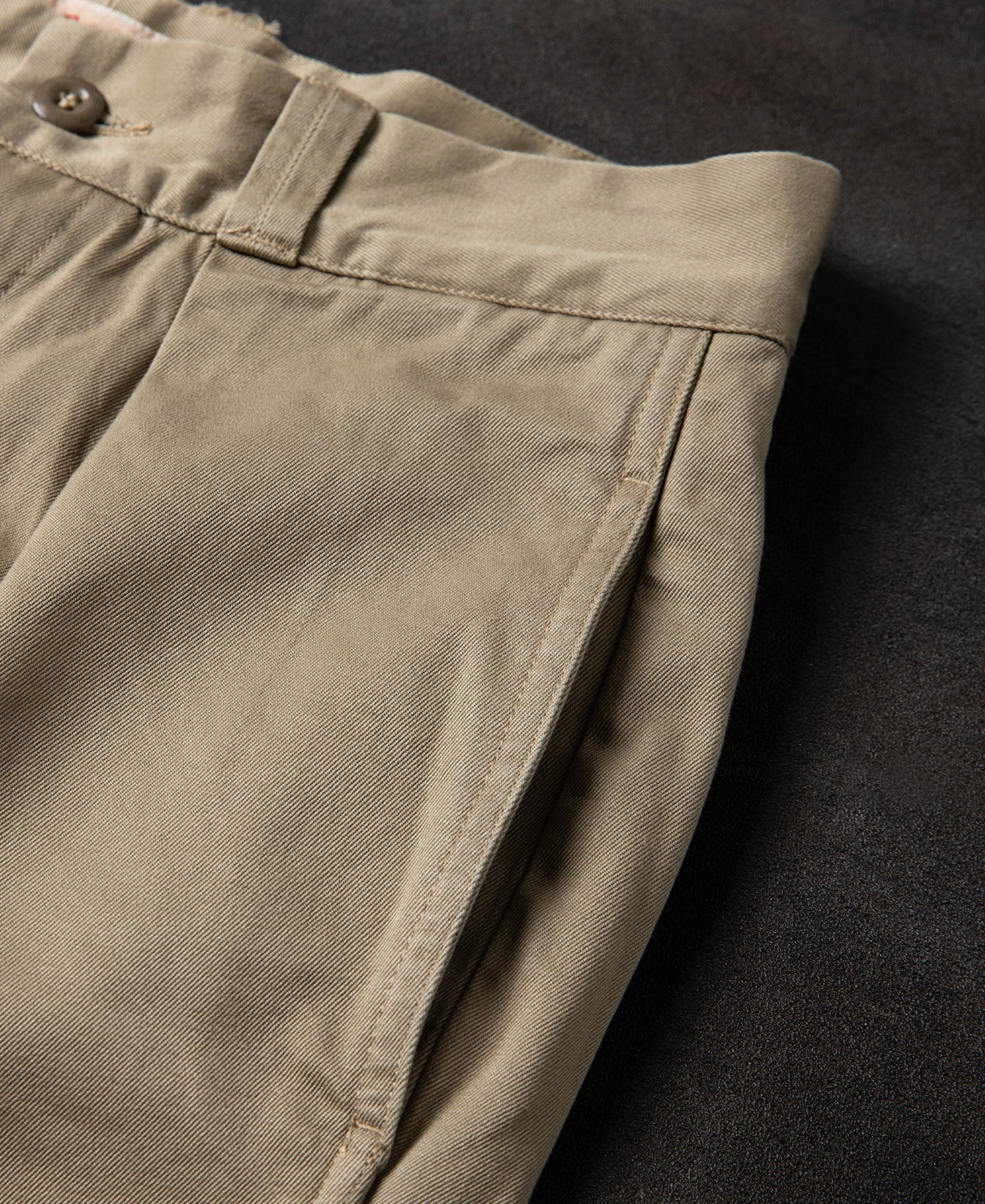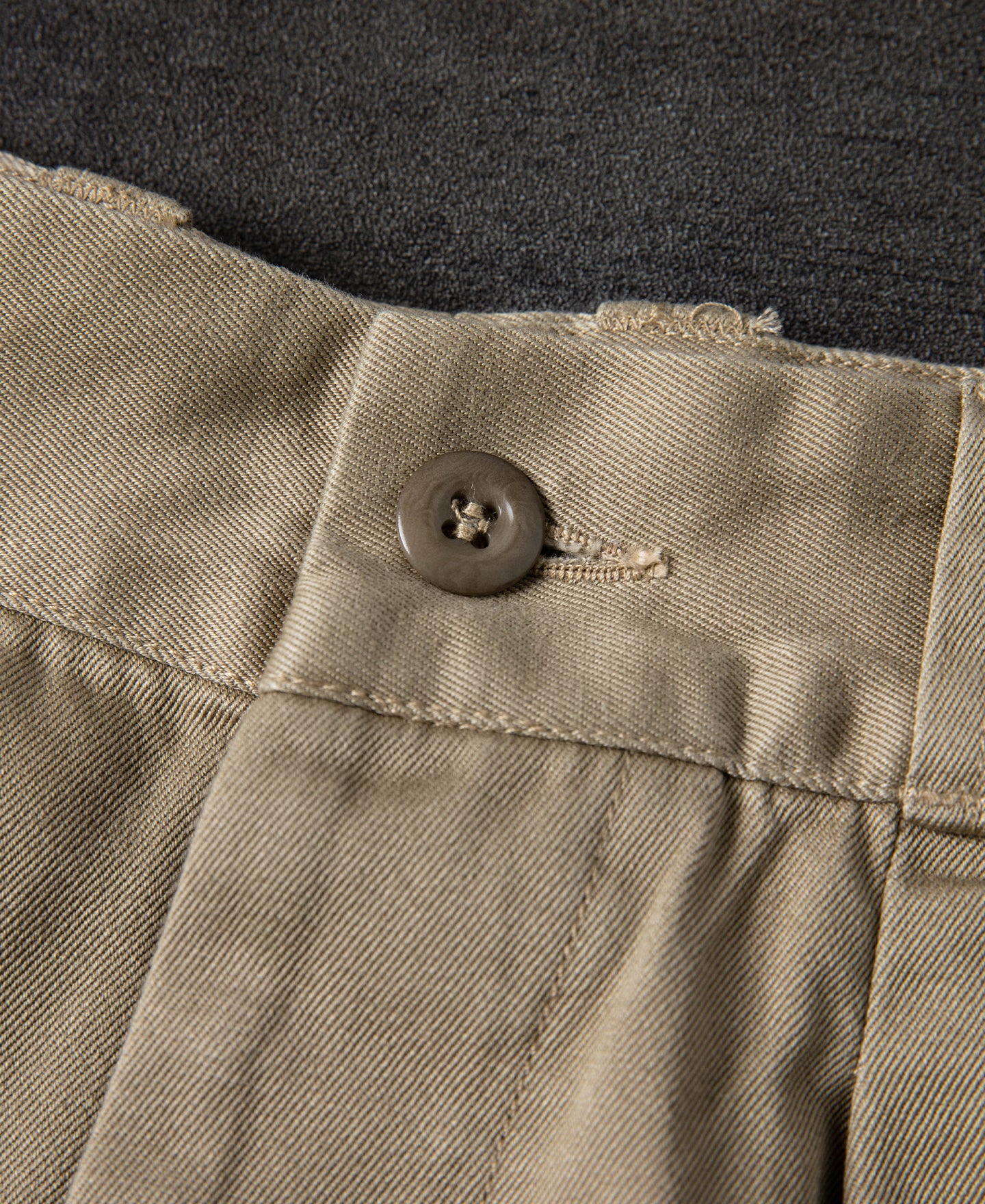 This pair is a reproduction of the rare single-pleated version of the French Army M-1952 Chino Trousers. Crafted from 10.5 oz high-density cotton twill fabric, it features a button fly, two side on-seam pockets, and two buttoned pockets at the back. The overall structure presents a high waist and straight leg shape. The design and details of this pair precisely replicate the original version. It has undergone a garment wash to give it a lived-in feel. Time Catcher stands behind the quality and authenticity of this product. -