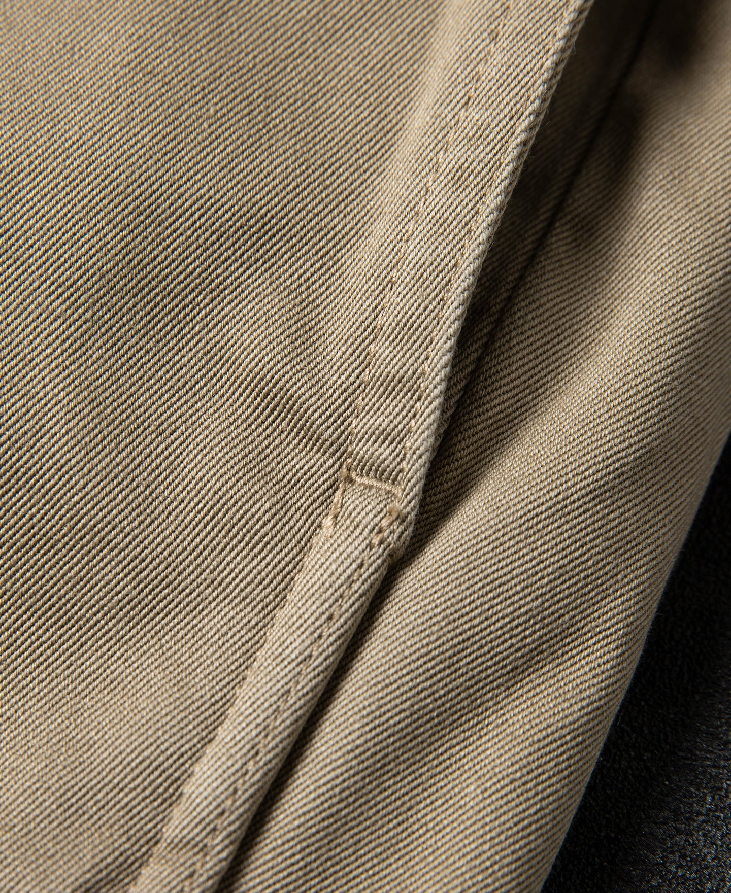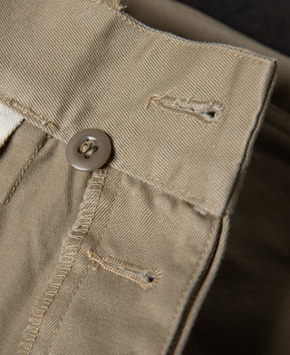 This pair is a reproduction of the rare single-pleated version of the French Army M-1952 Chino Trousers. Crafted from 10.5 oz high-density cotton twill fabric, it features a button fly, two side on-seam pockets, and two buttoned pockets at the back. The overall structure presents a high waist and straight leg shape. The design and details of this pair precisely replicate the original version. It has undergone a garment wash to give it a lived-in feel. Time Catcher stands behind the quality and authenticity of this product.